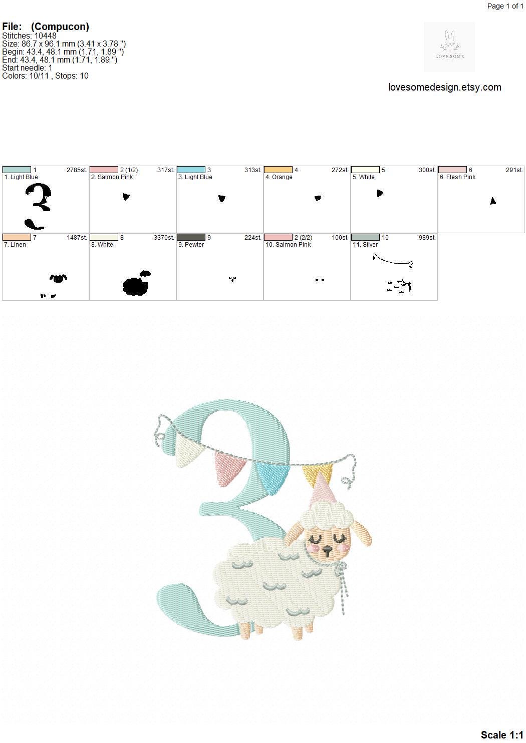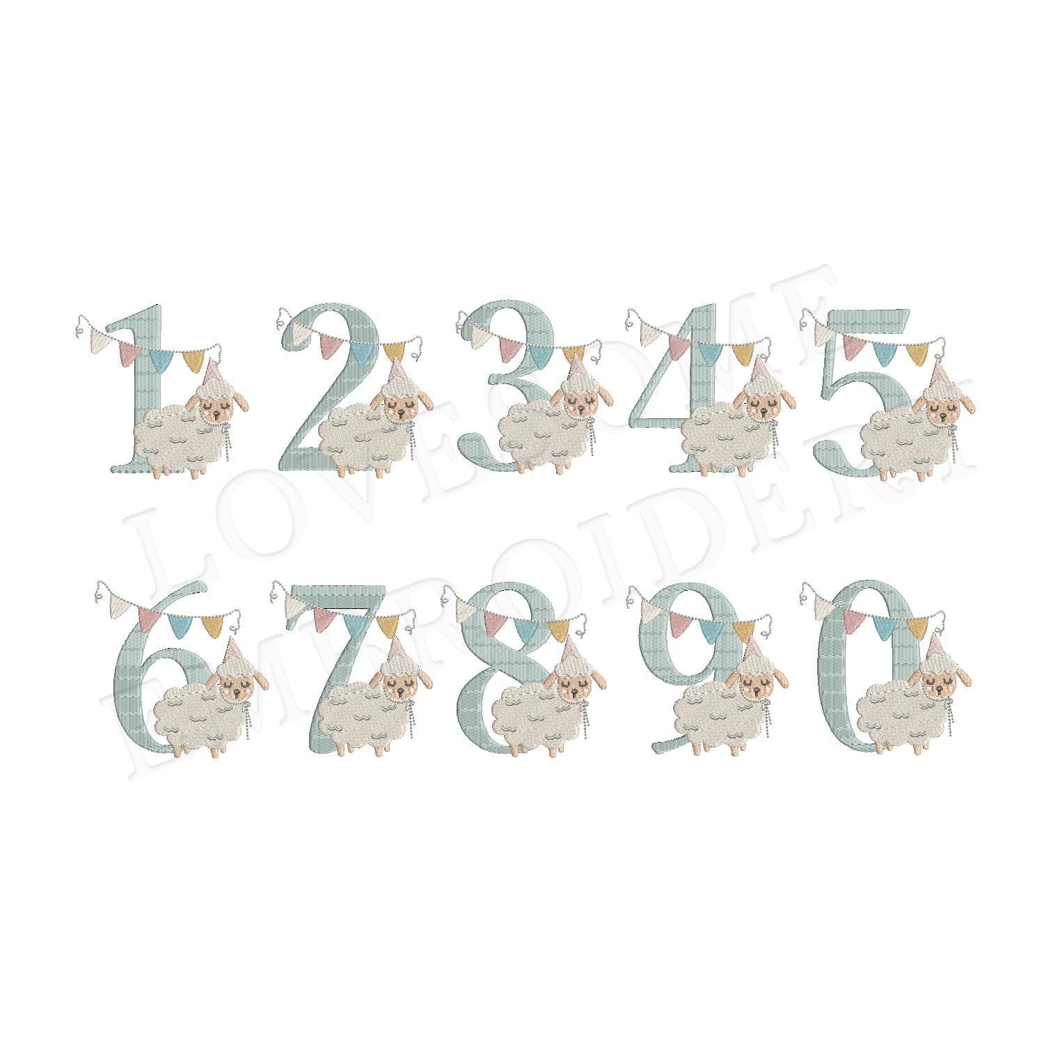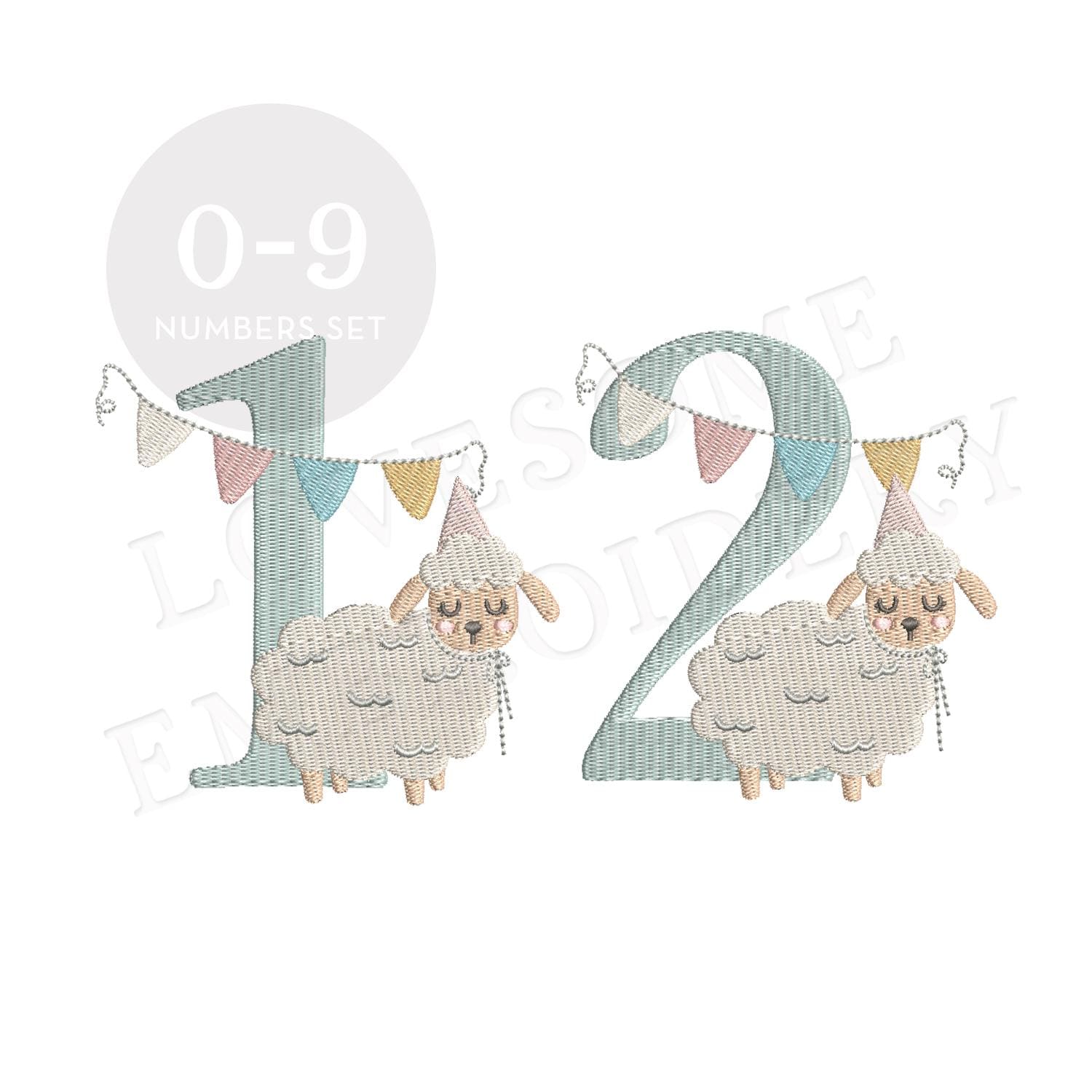 This listing features a machine embroidery numbers set which includes embroidery files of ten numbers (0-9) with a cute little birthday lamb with a party hat design in 4inch size for 4x4 hoops for machine embroidery. (For the whole set, pls see the listing images.)