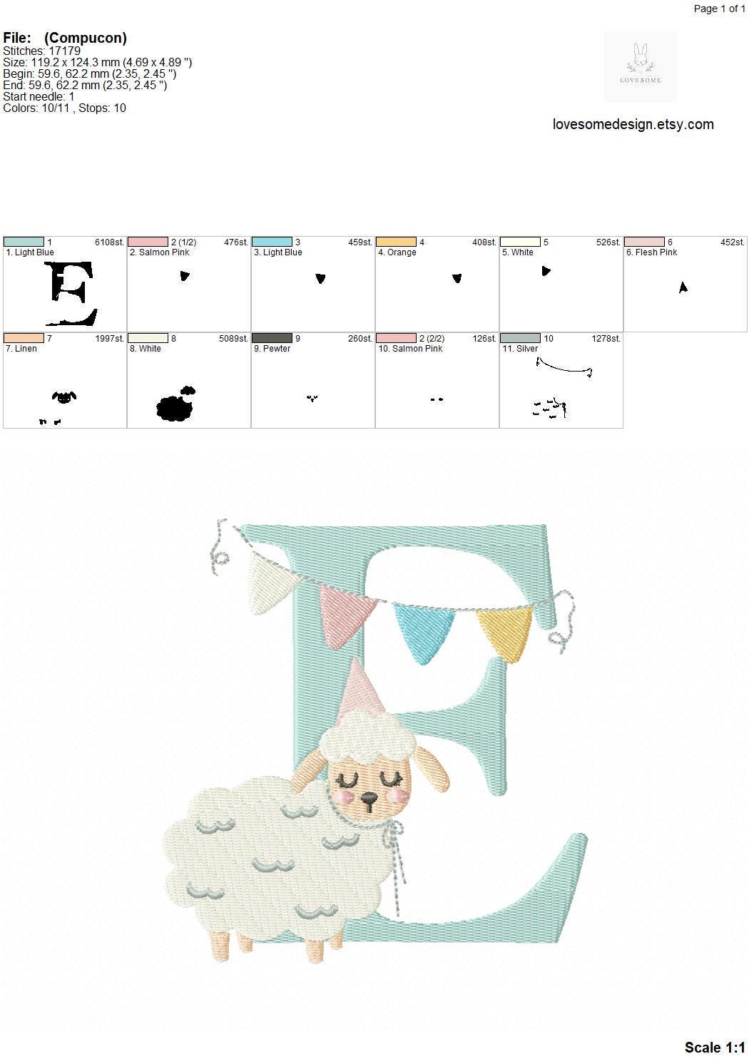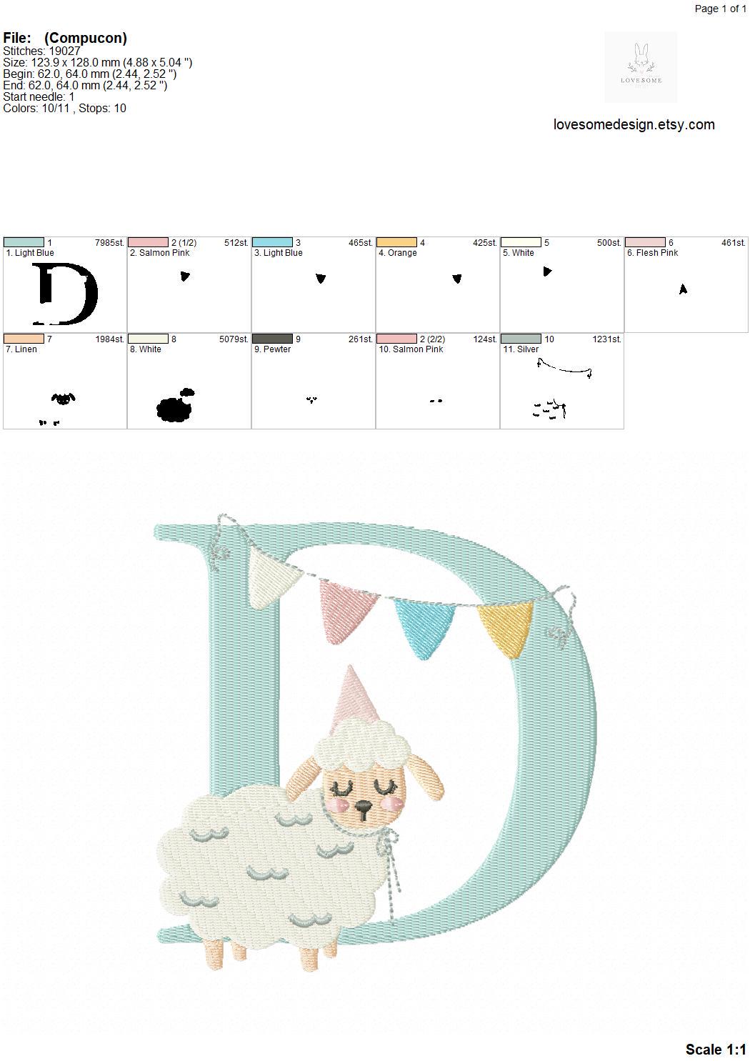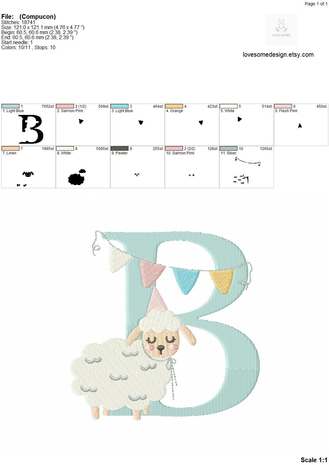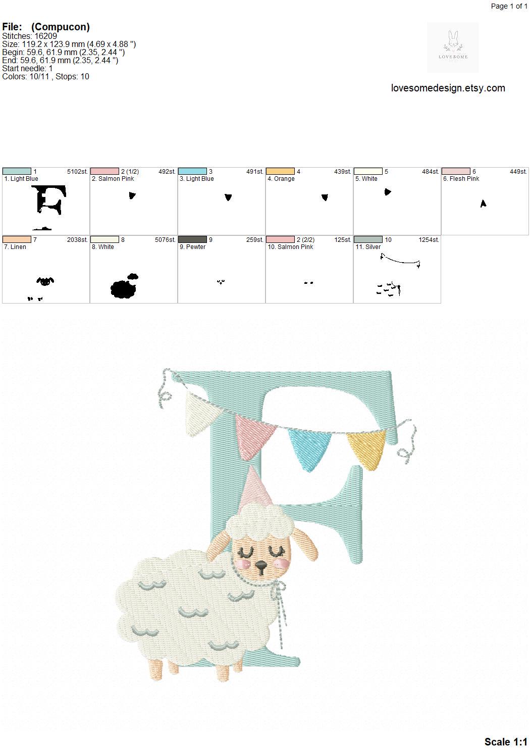 This listing features a machine embroidery font set which includes embroidery files of 26 uppercase monogram letters with a cute little birthday lamb with a party hat design in 5inch size. (For the whole set, pls see the listing images.)