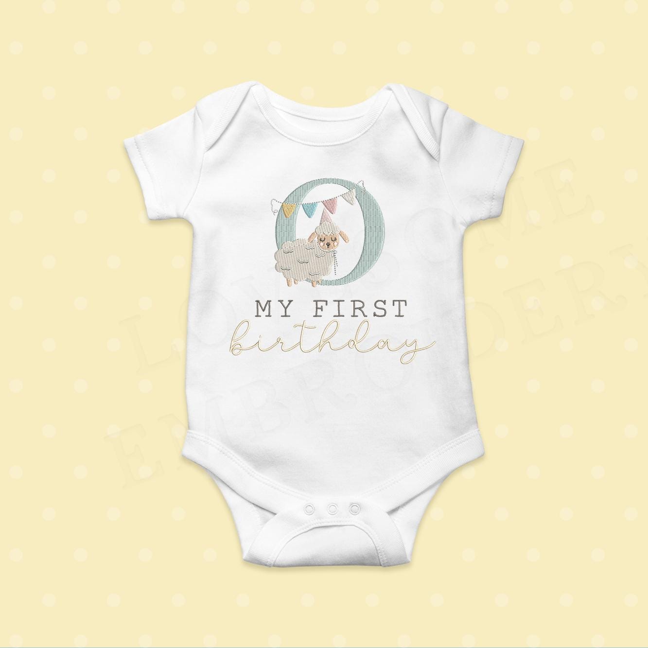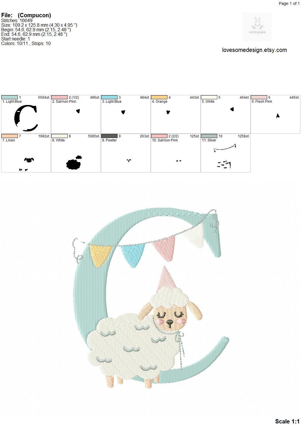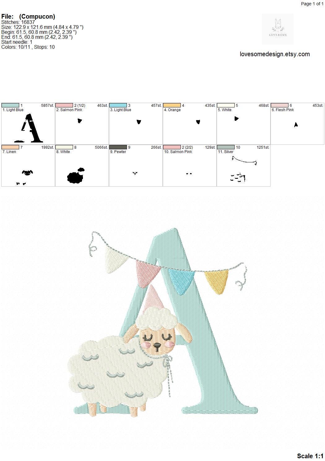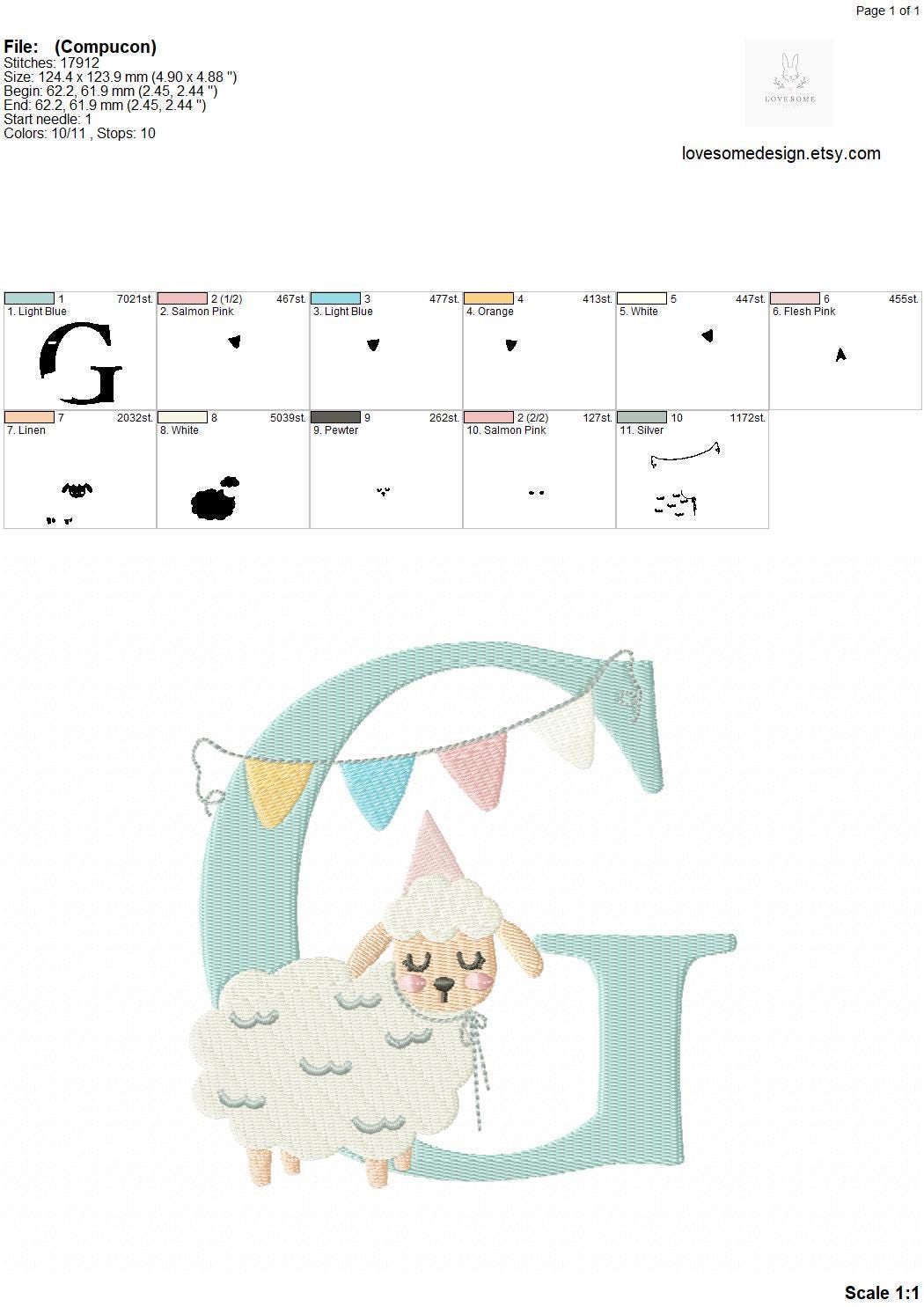 This listing features a machine embroidery font set which includes embroidery files of 26 uppercase monogram letters with a cute little birthday lamb with a party hat design in 5inch size. (For the whole set, pls see the listing images.)