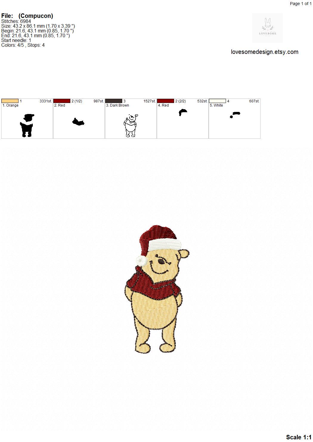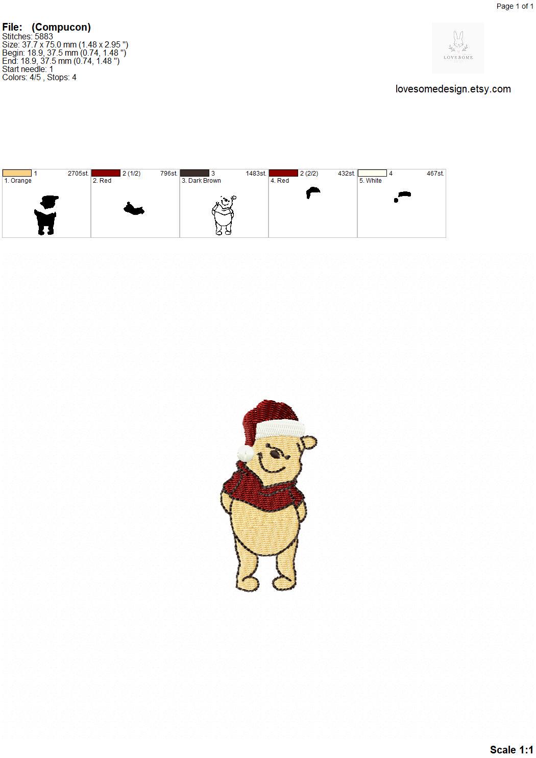 This listing features a machine embroidery file of Winnie the Pooh design with a santa hat in two small sizes, 3inch and 3.5inch.