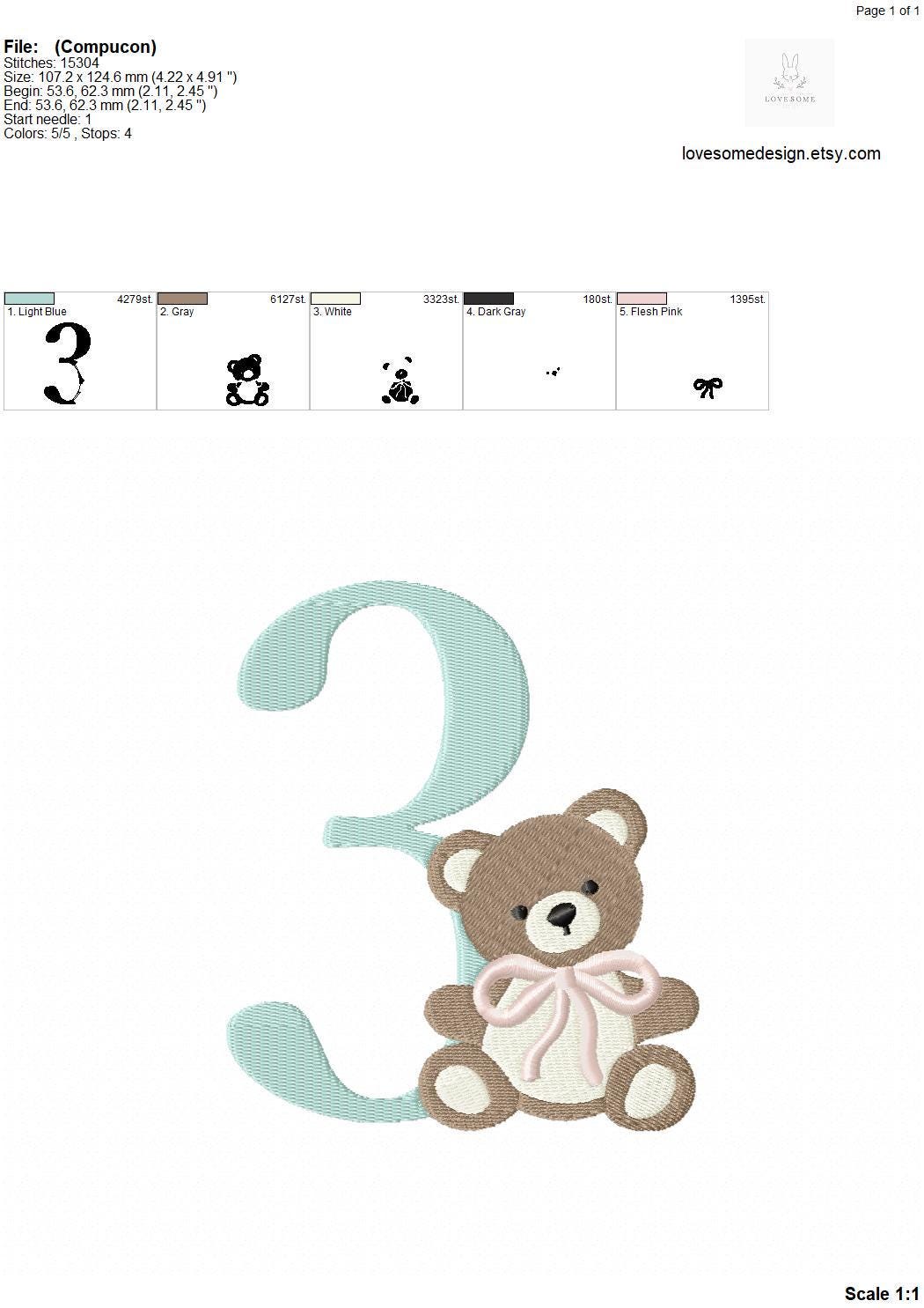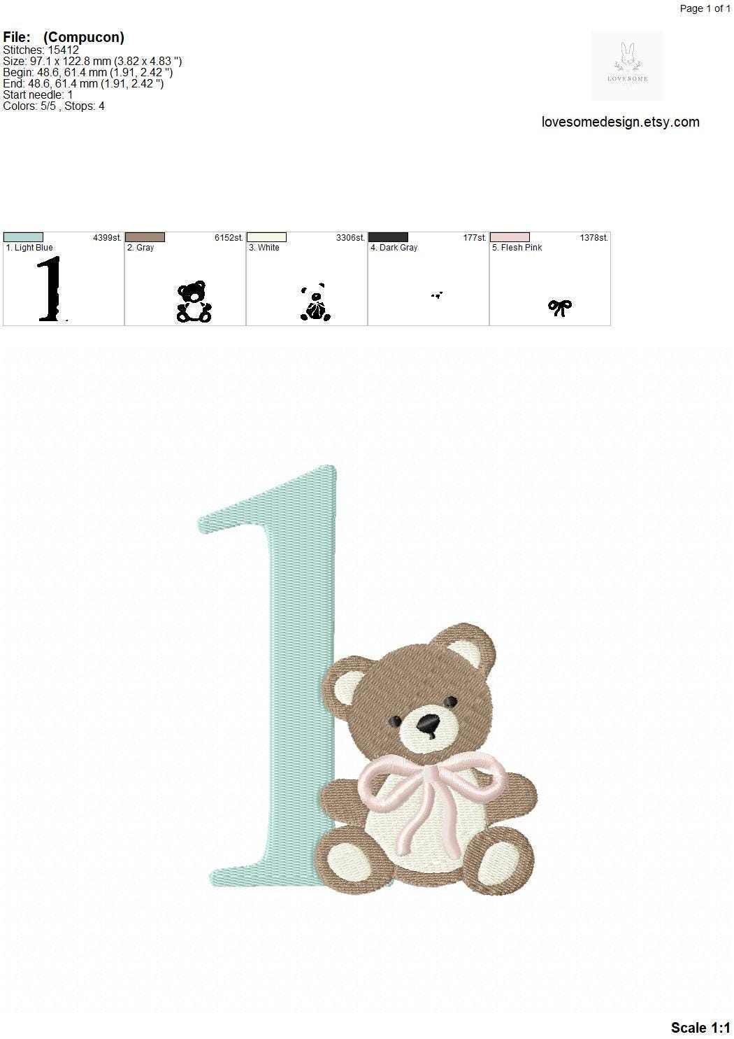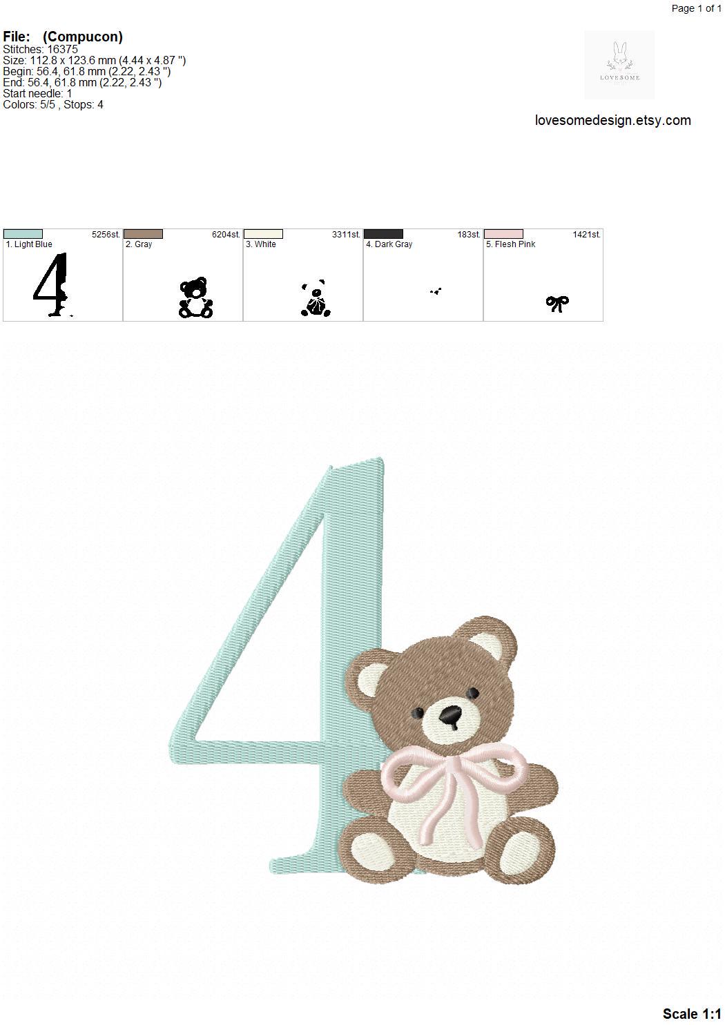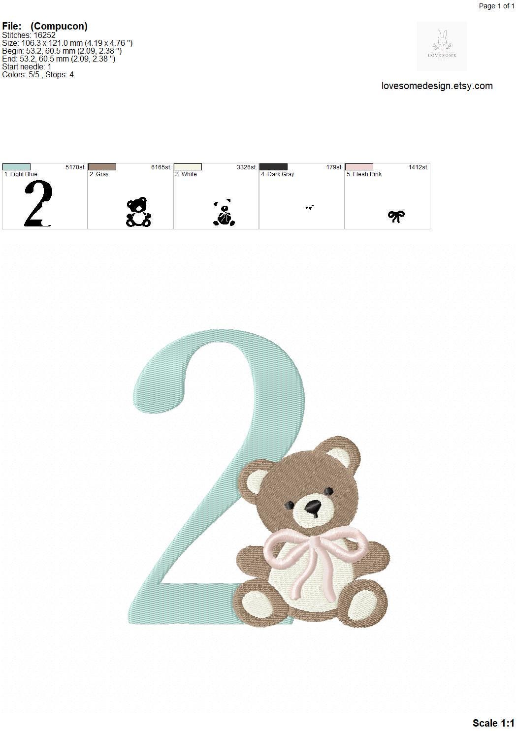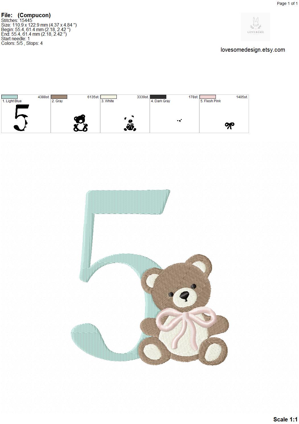 This listing features a machine embroidery numbers set which includes embroidery files of ten numbers (0-9) with cute teddy with bow design in 5inch size for machine embroidery. (For the whole set, pls see the listing images.)