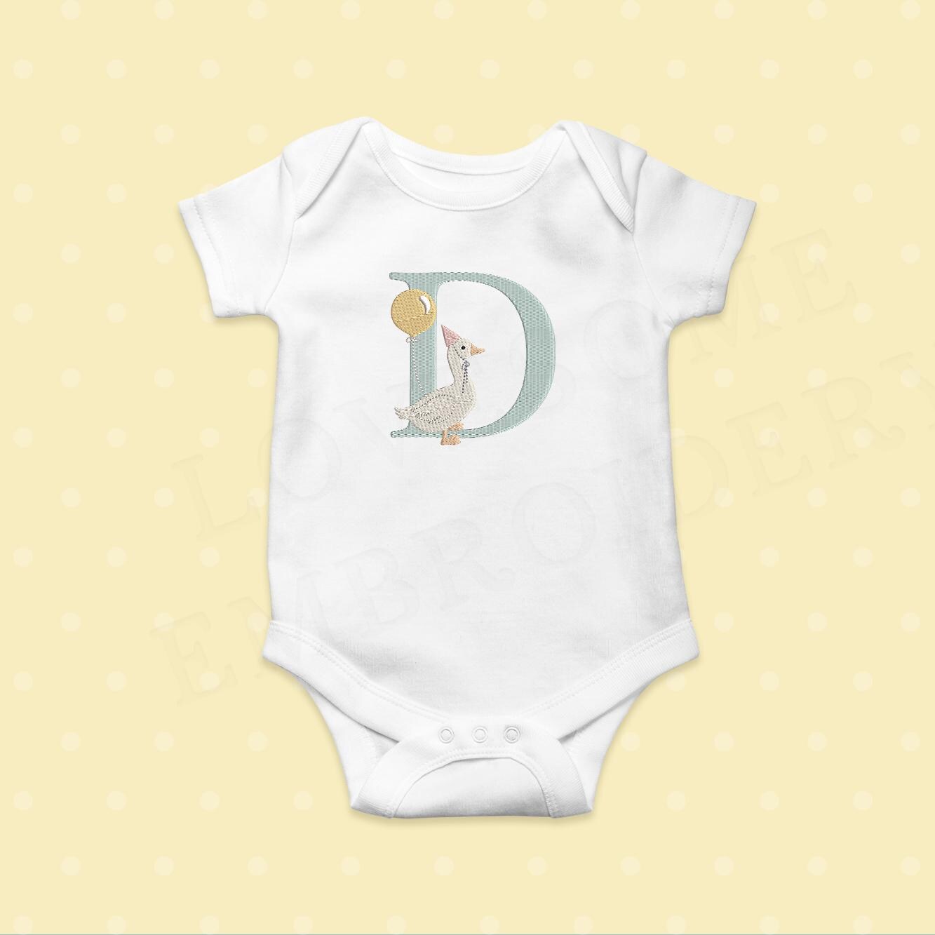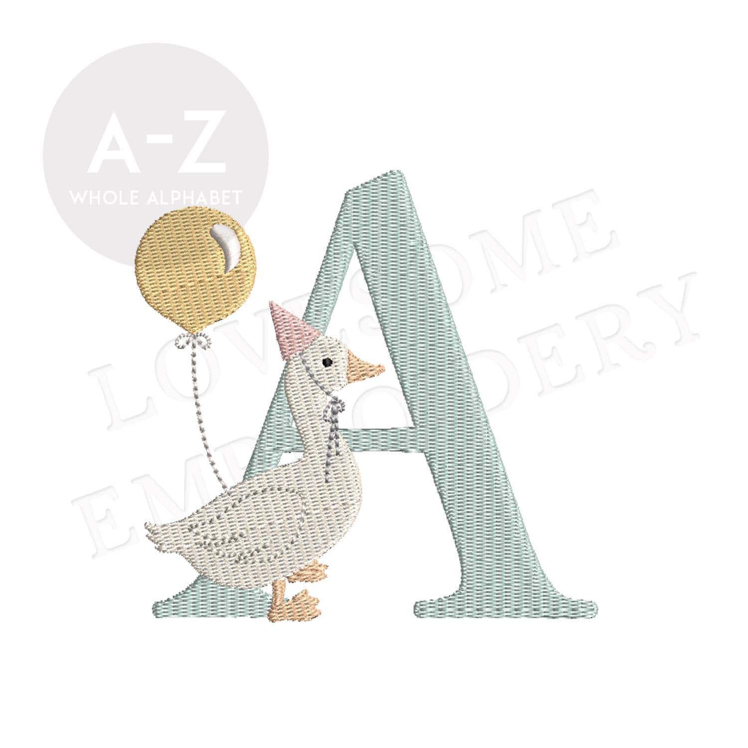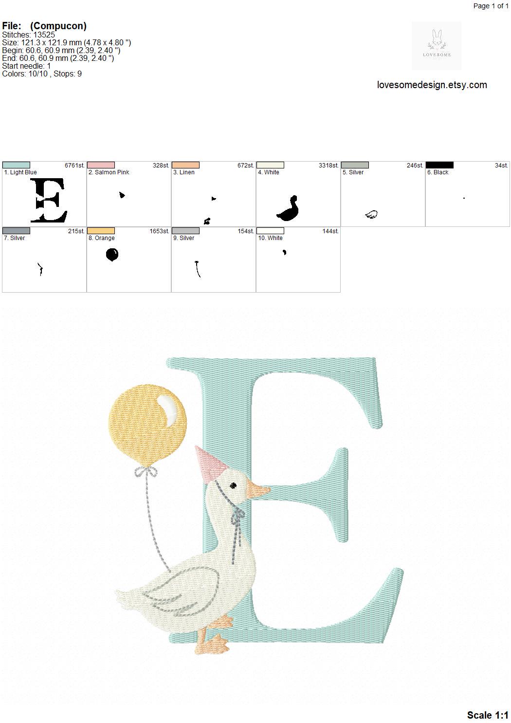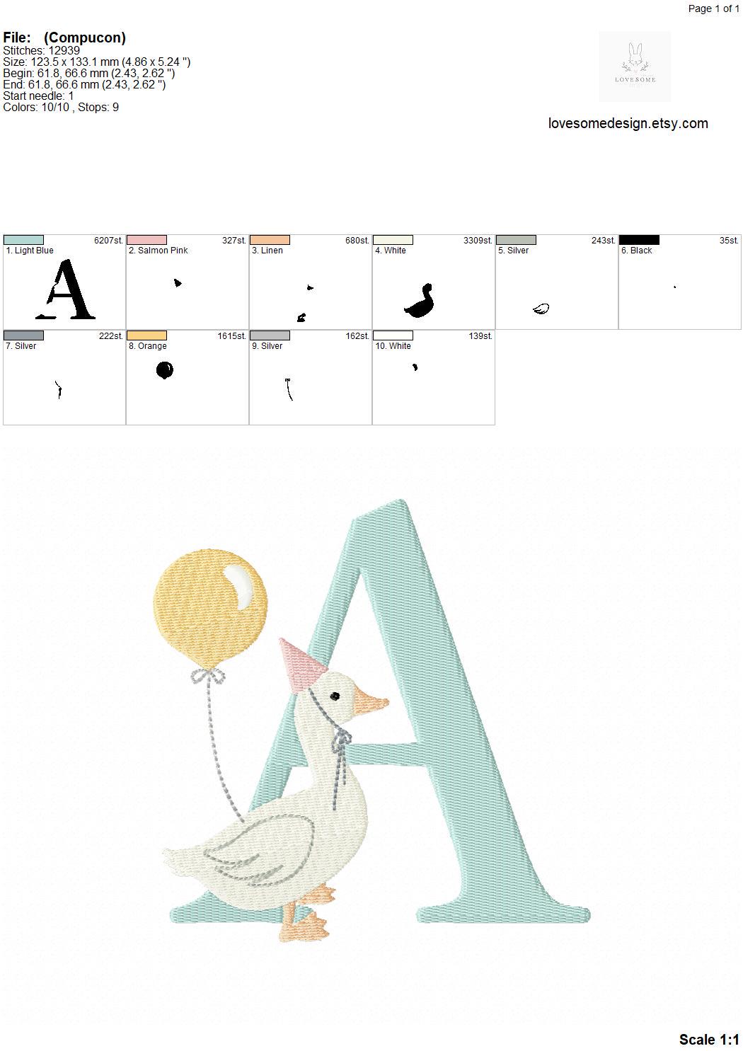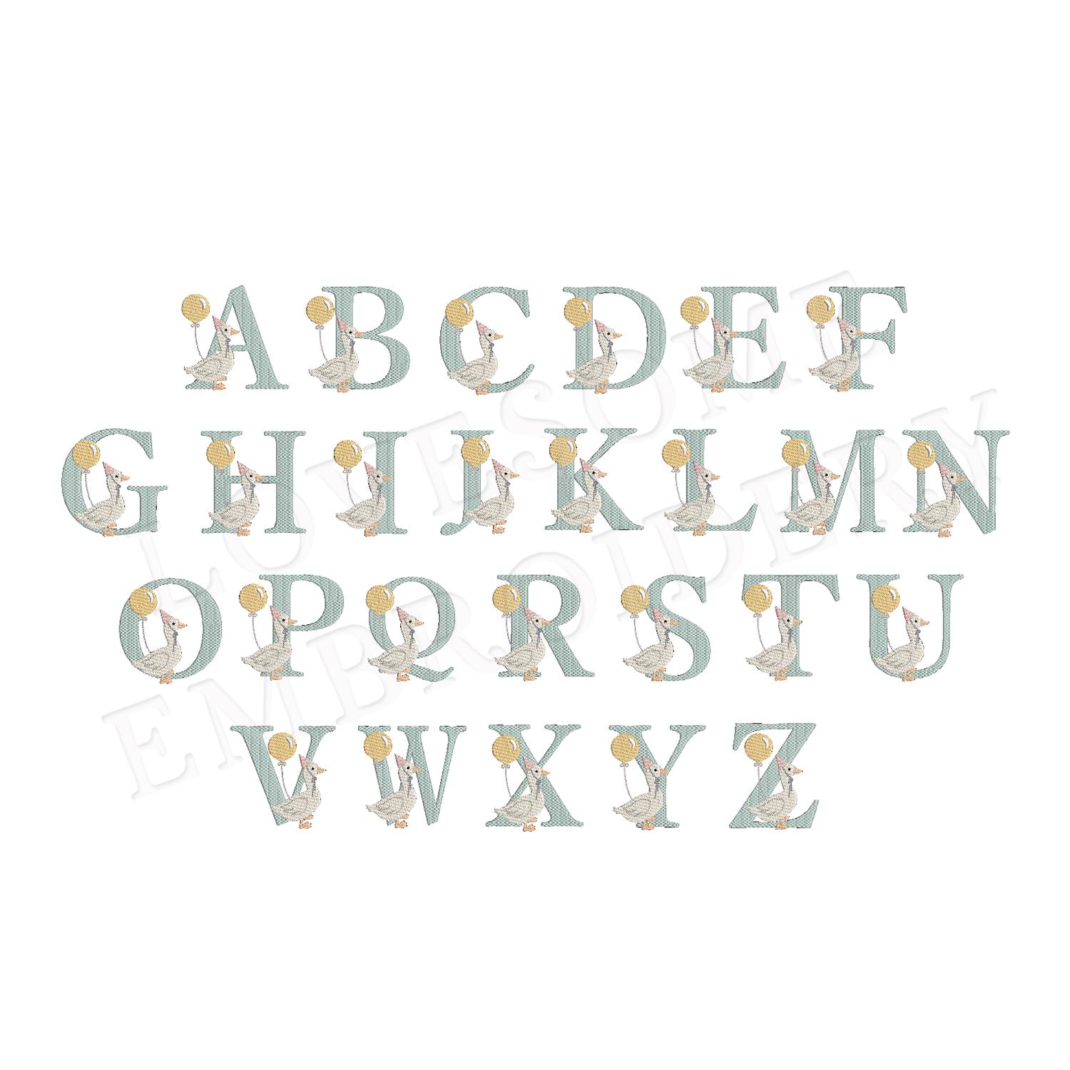 This listing features a machine embroidery font set which includes embroidery files of 26 uppercase monogram letters with cute silly goose with a balloon design in 5inch size. (For the whole set, pls see the listing images.)