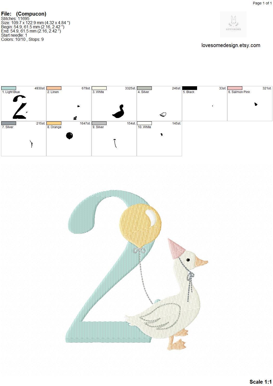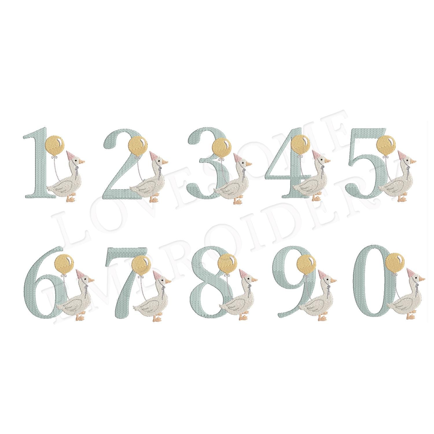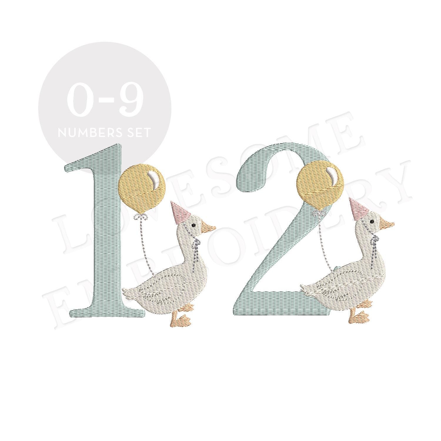 This listing features a machine embroidery numbers set which includes embroidery files of ten numbers (0-9) with cute silly goose with a balloon design in 5inch size for machine embroidery. (For the whole set, pls see the listing images.)