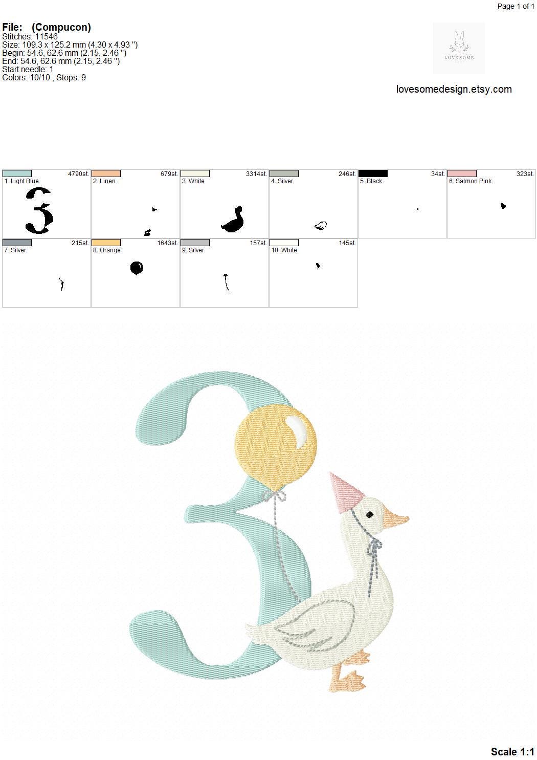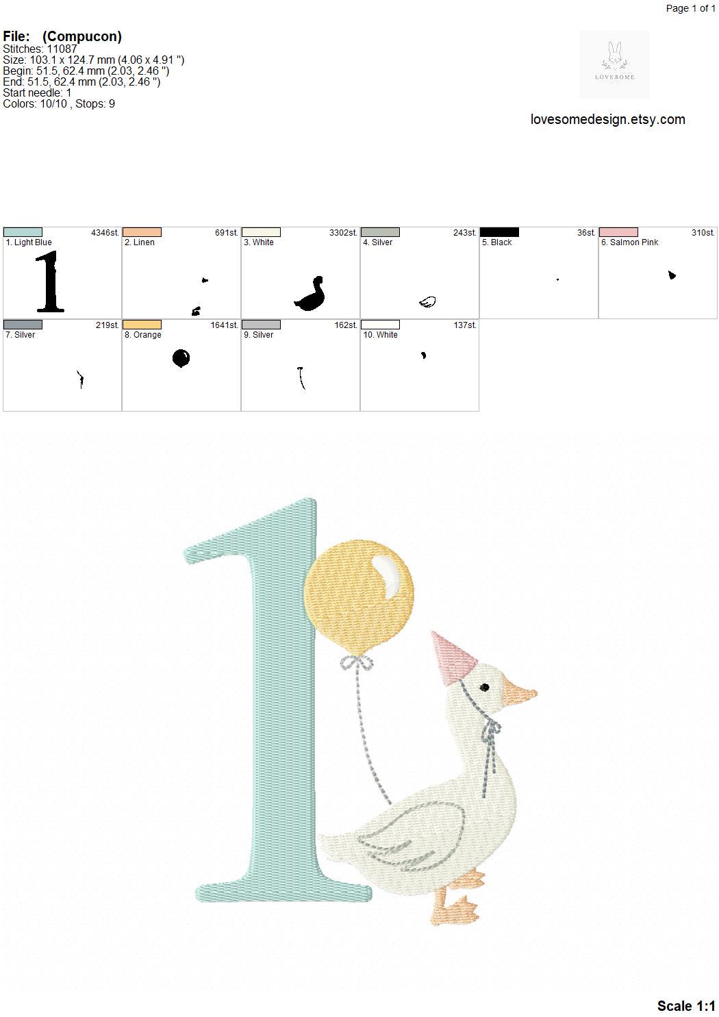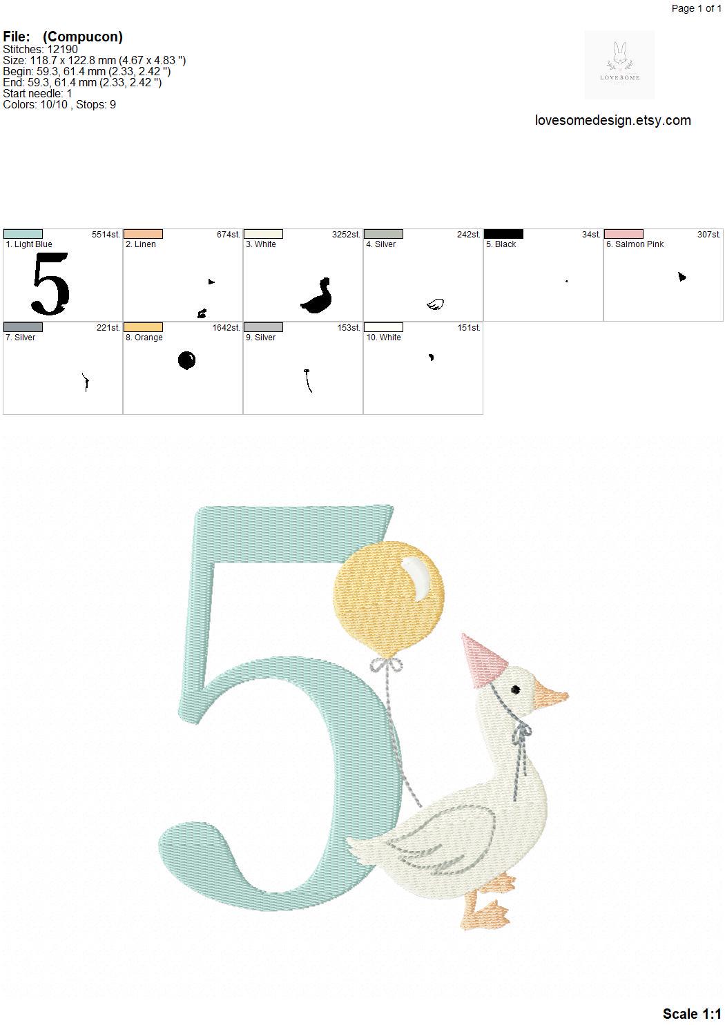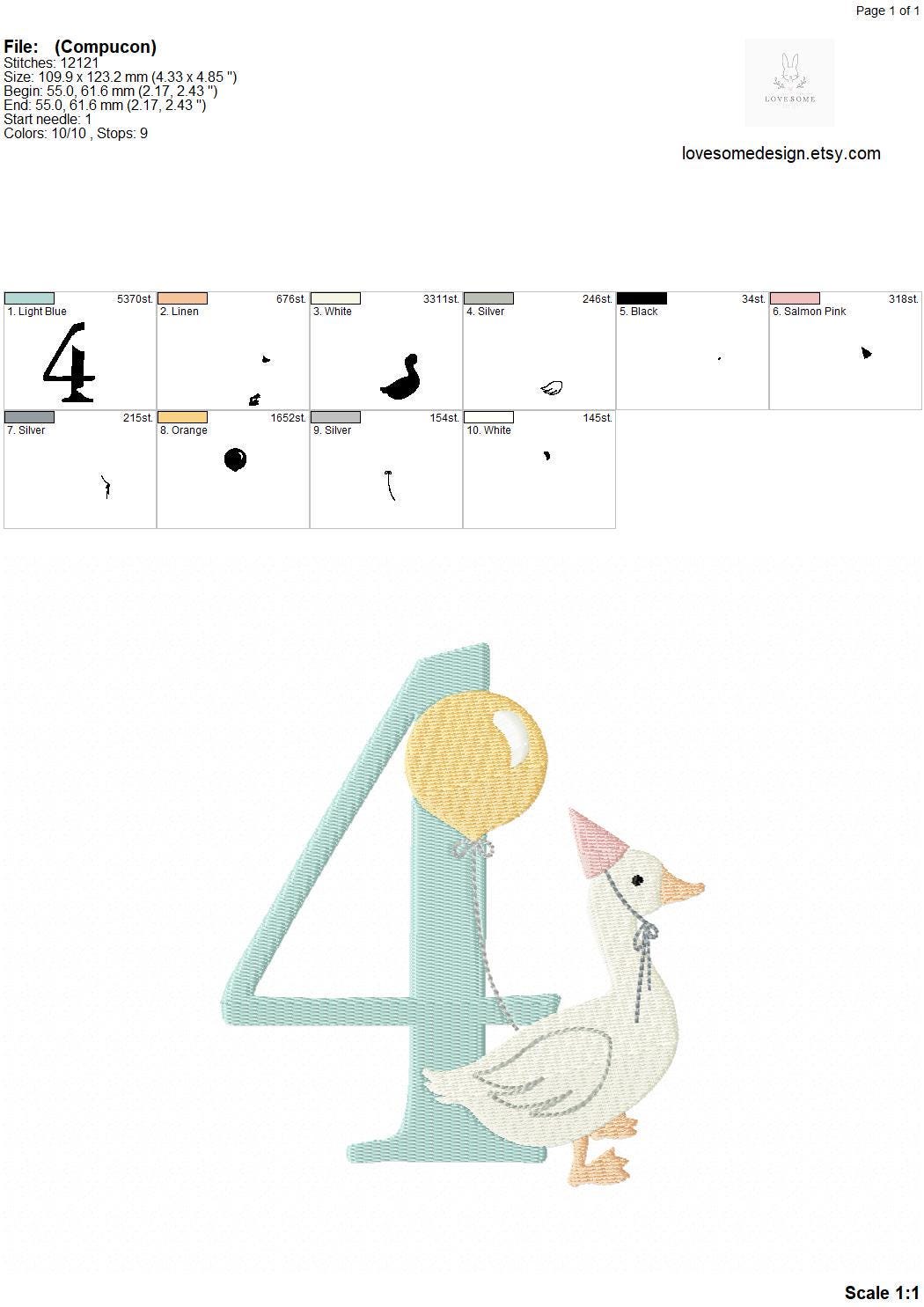 This listing features a machine embroidery numbers set which includes embroidery files of ten numbers (0-9) with cute silly goose with a balloon design in 5inch size for machine embroidery. (For the whole set, pls see the listing images.)