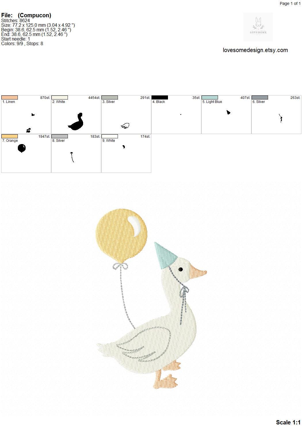 This listing includes one cute silly goose with a balloon design for machine embroidery in two sizes, appr. in 4inch and 5inch size for embroidery hoops in different sizes.