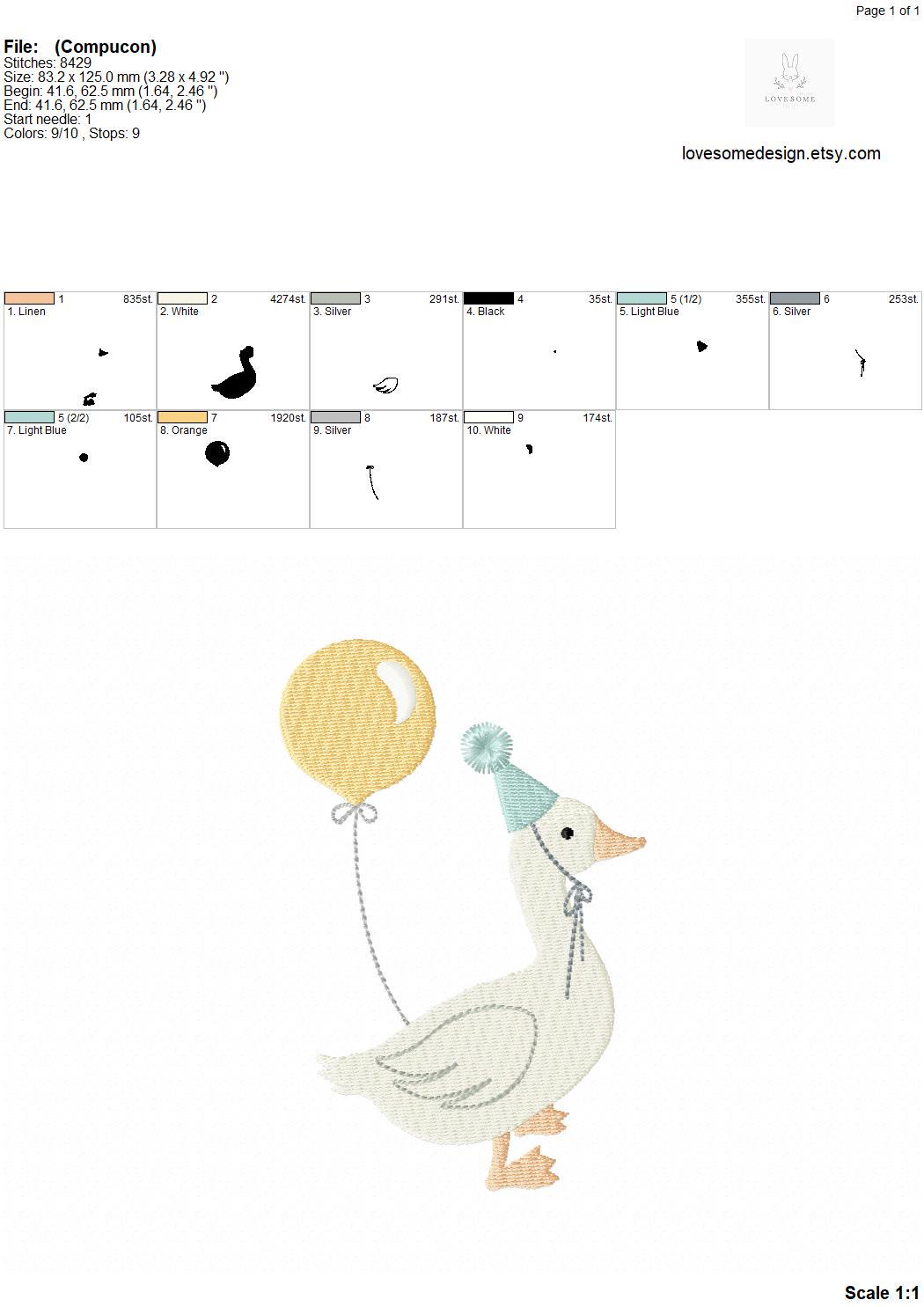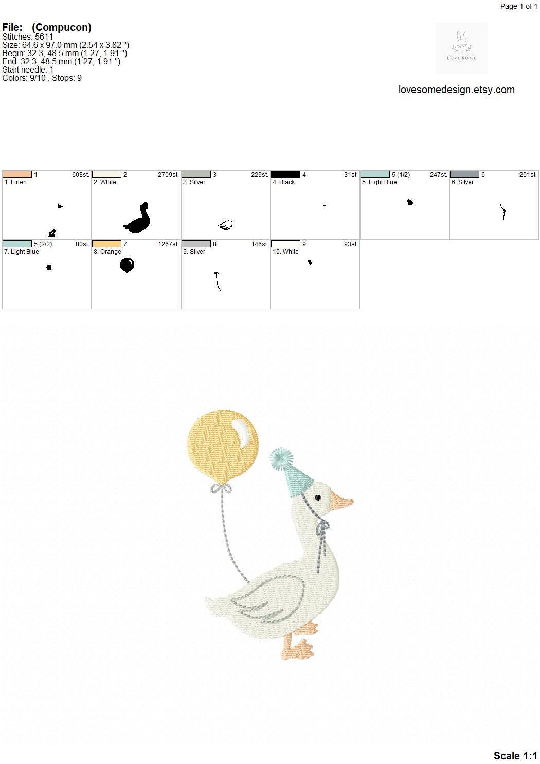 This listing includes one cute silly goose with a balloon design for machine embroidery in two sizes, appr. in 4inch and 5inch size.