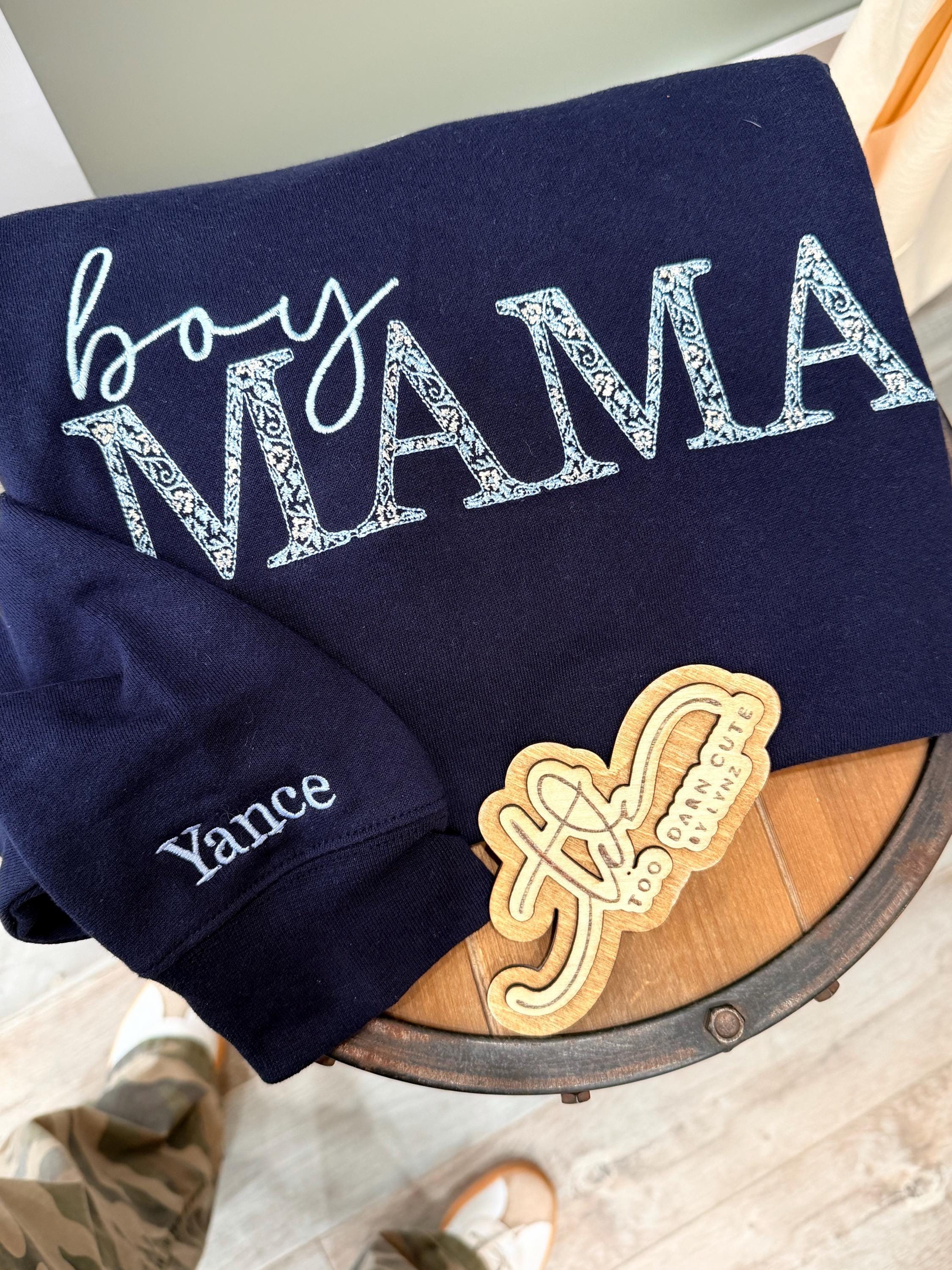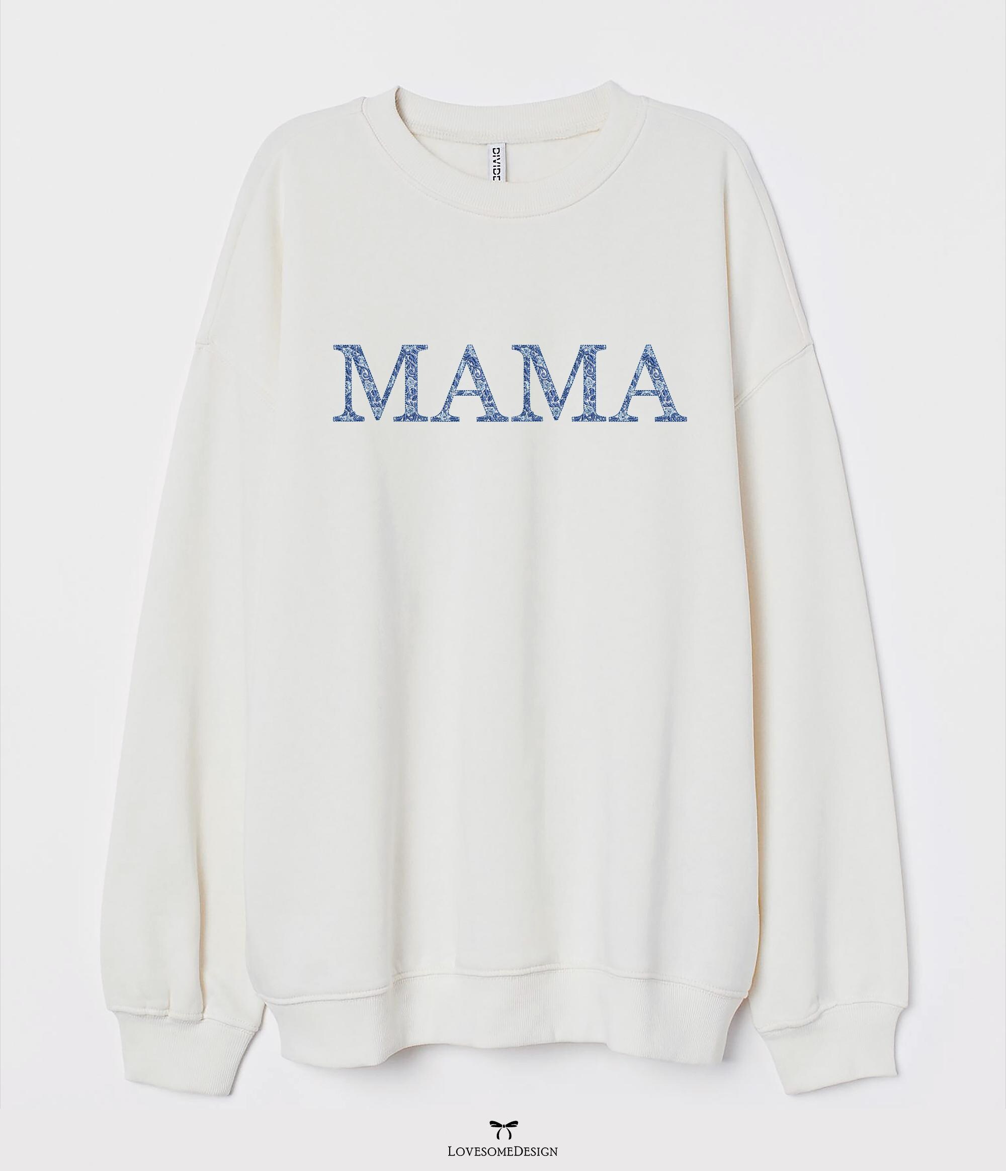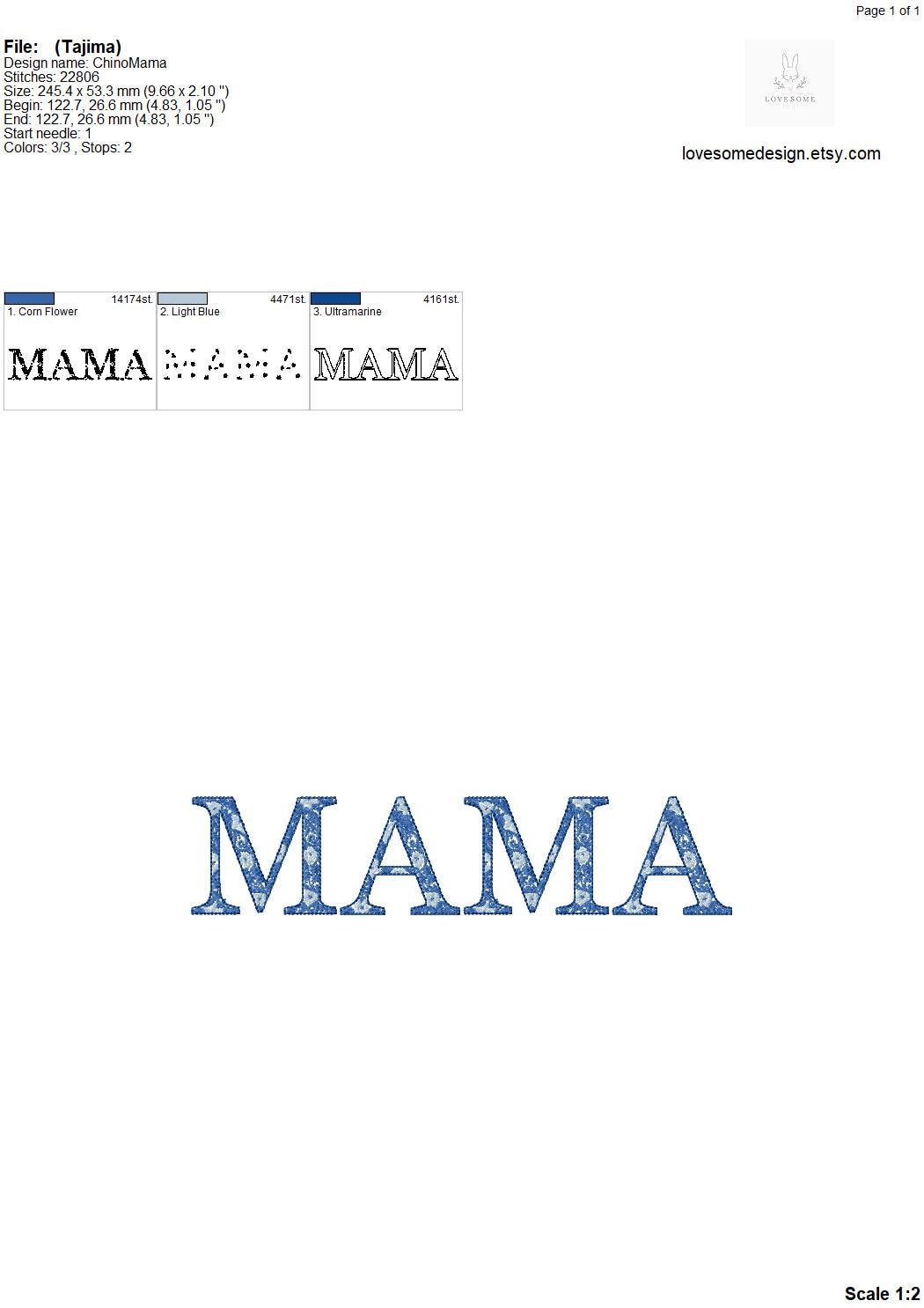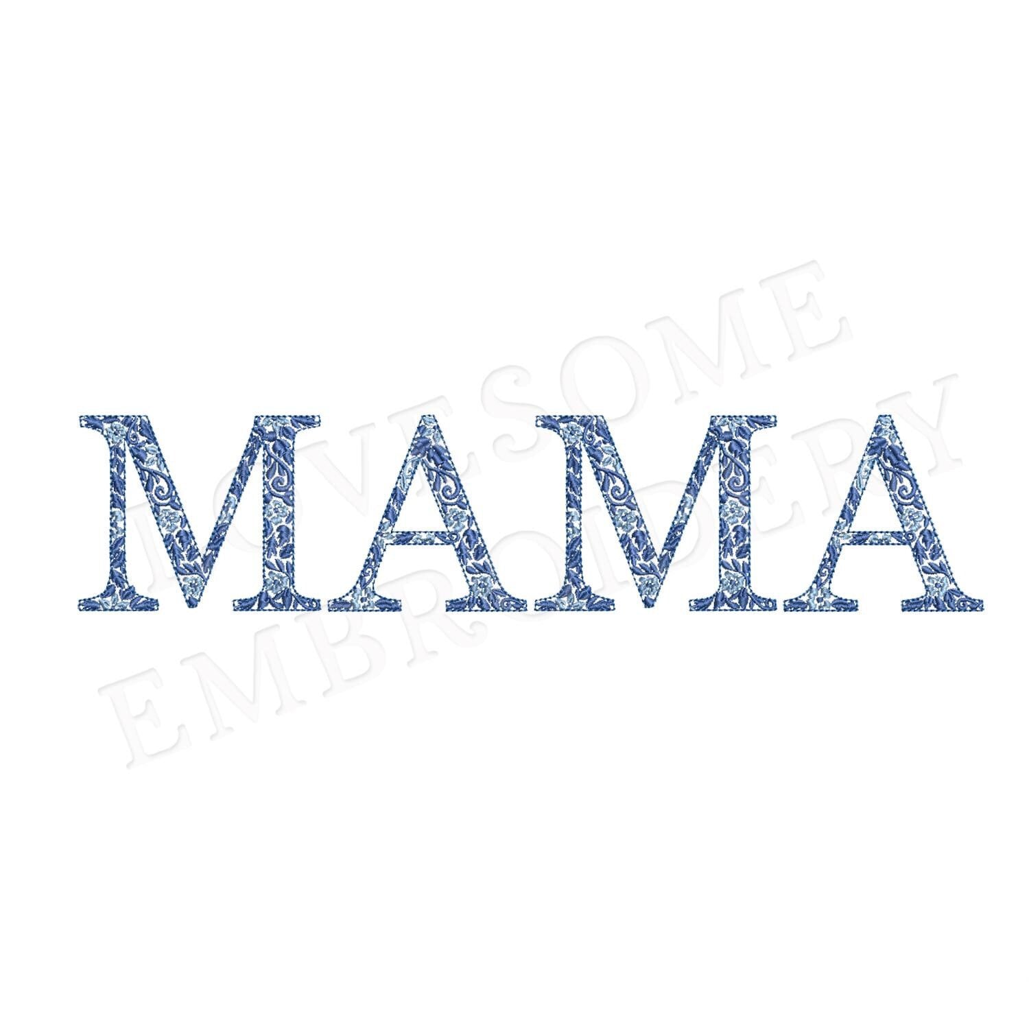 This listing features a machine embroidery file of word "MAMA" which has a beautiful blue chinoiserie fill design in 10inch size.