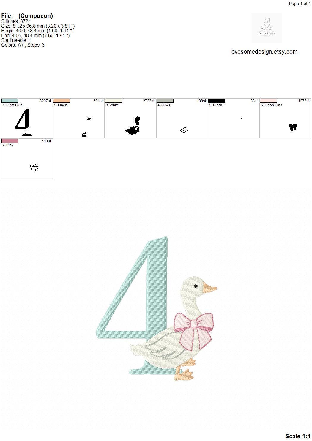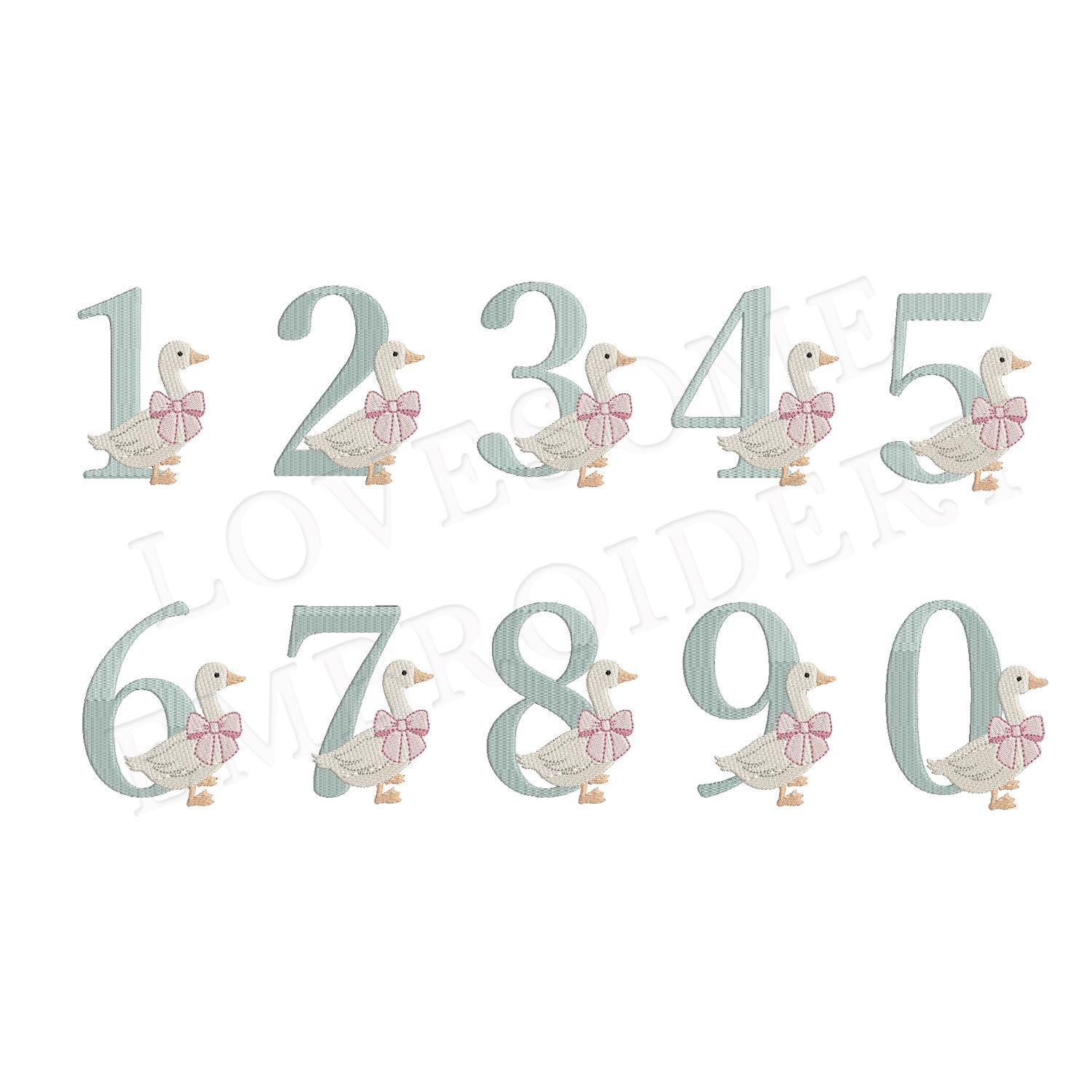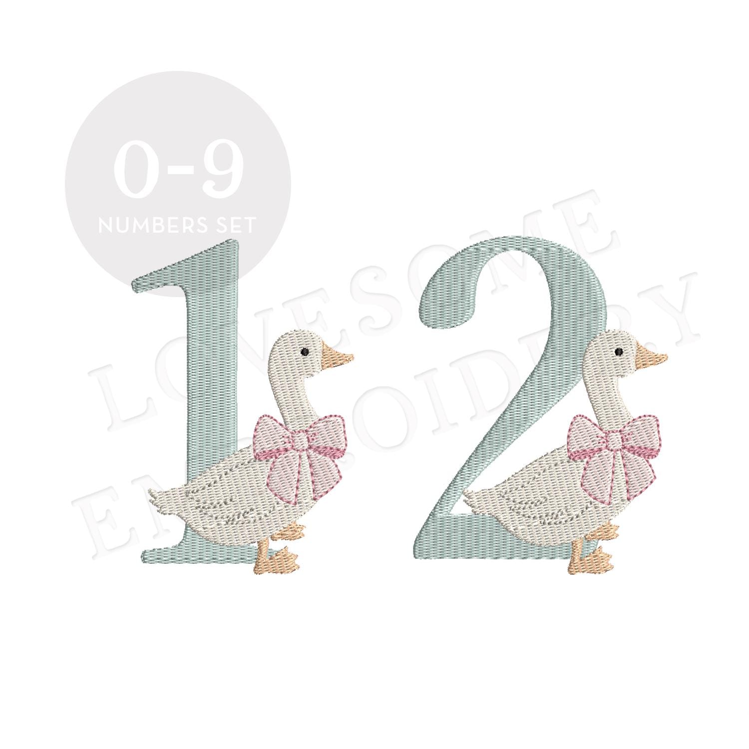 This listing features a machine embroidery numbers set which includes embroidery files of ten numbers (0-9) with cute silly goose with a bow design in one size for 4x4 hoops for machine embroidery. (For the whole set, pls see the listing images.)