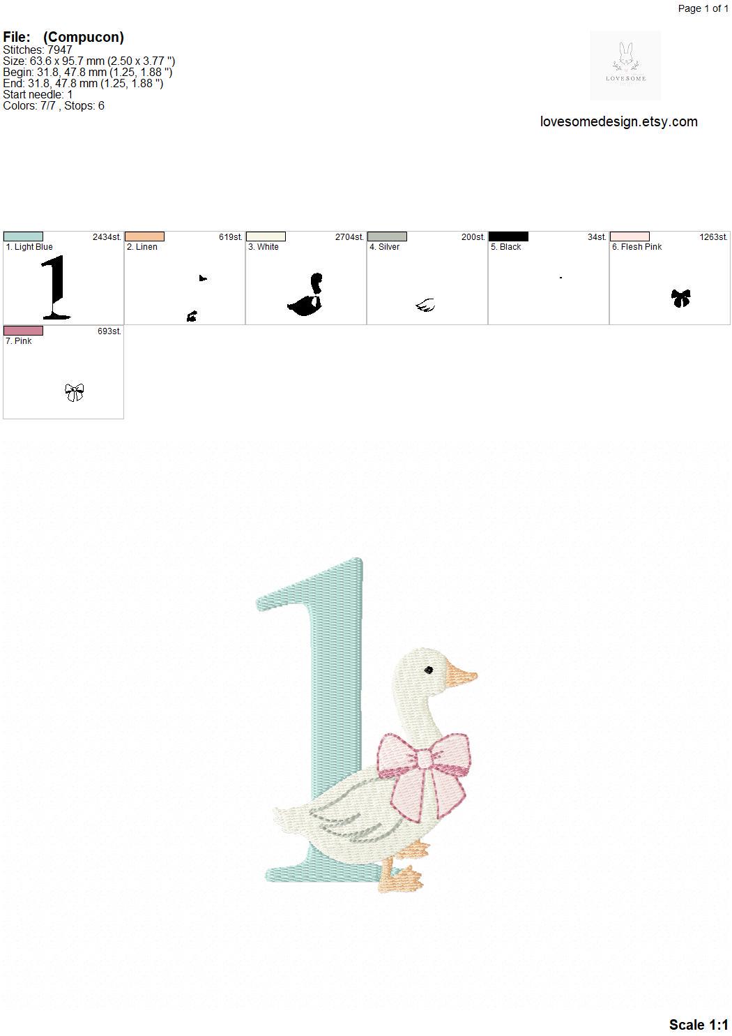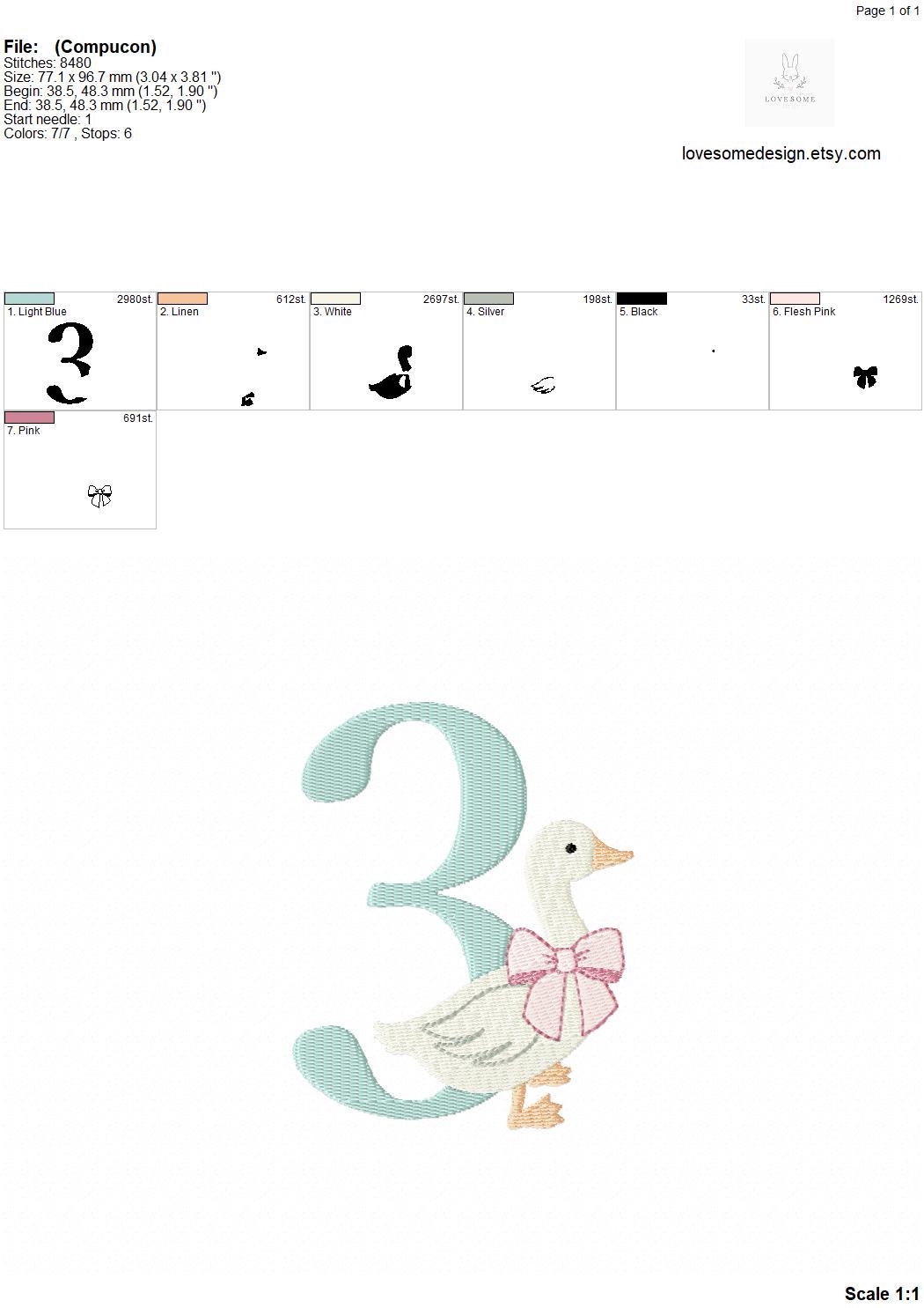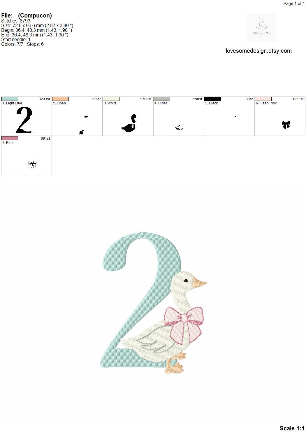 This listing features a machine embroidery numbers set which includes embroidery files of ten numbers (0-9) with cute silly goose with a bow design in one size for 4x4 hoops for machine embroidery. (For the whole set, pls see the listing images.)