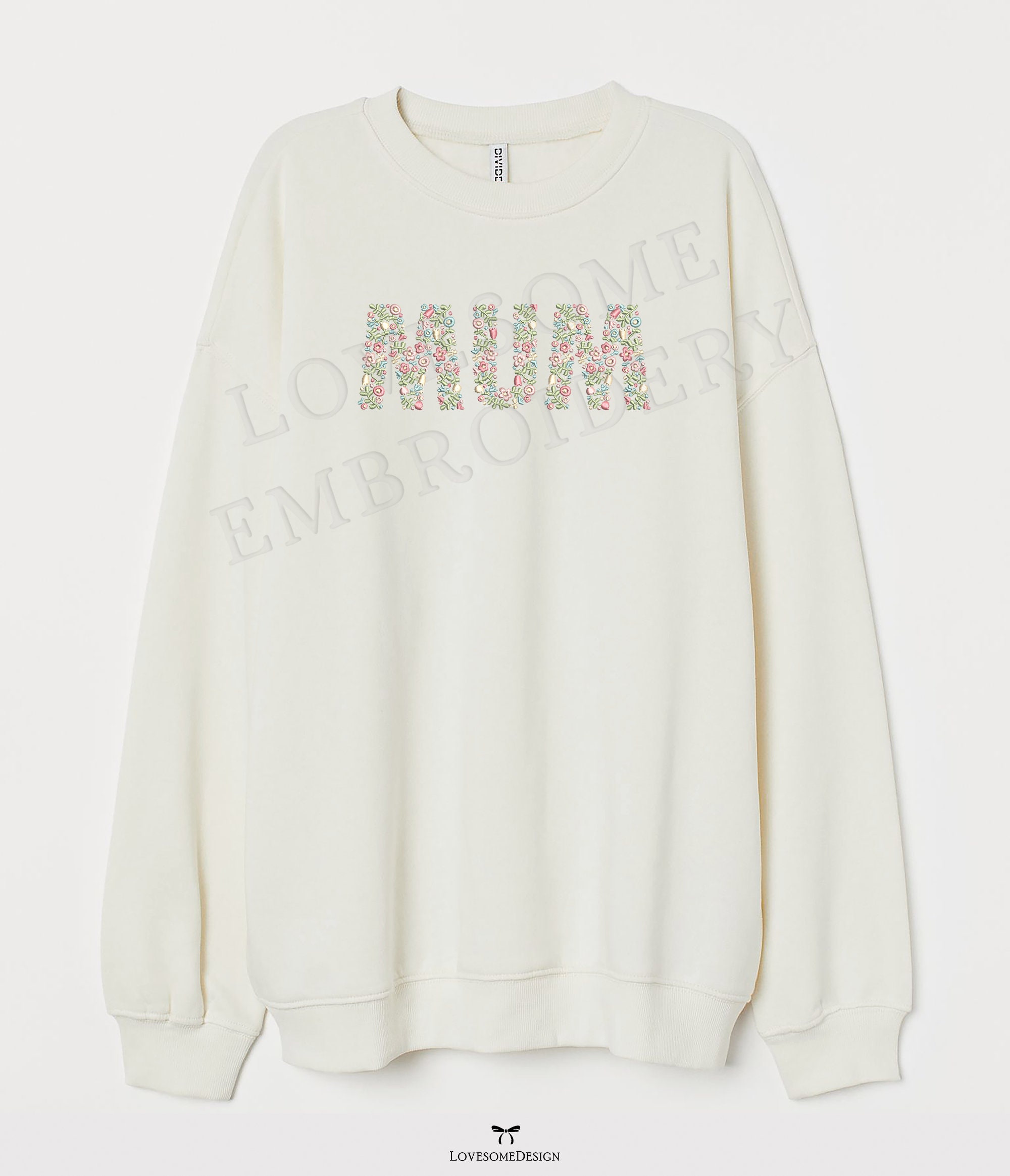 This listing features a machine embroidery file of word "MUM" which has a beautiful dainty floral fill design with pastel spring colors in 8inch size.