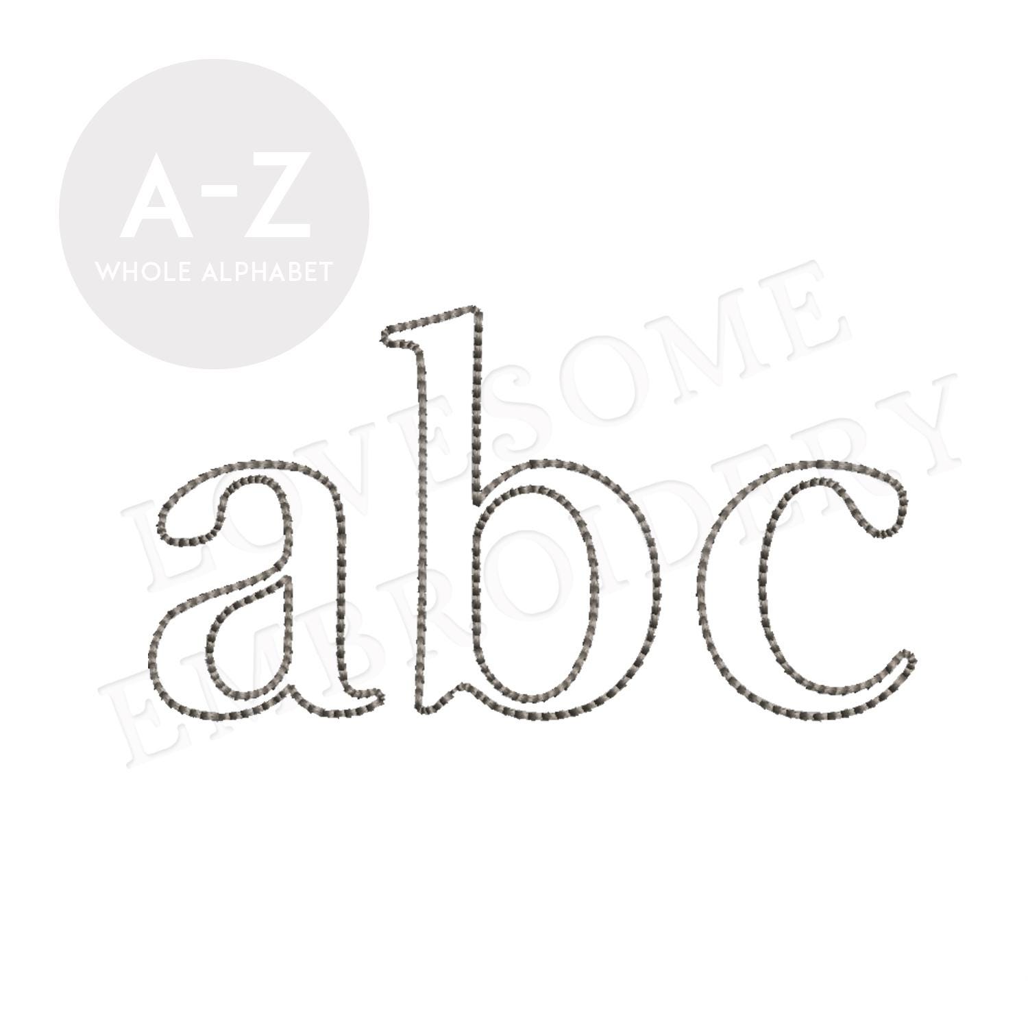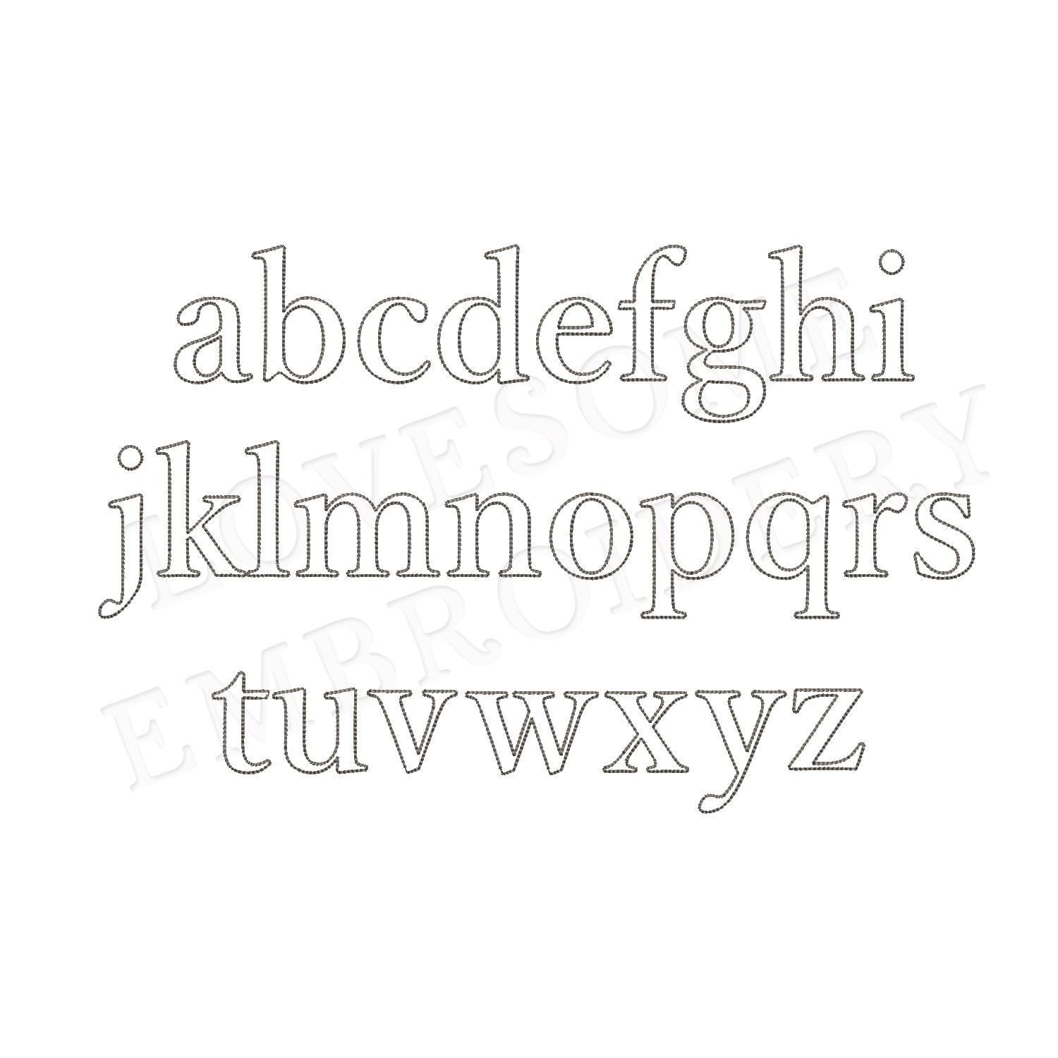 This listing features a machine embroidery font set which includes embroidery files of 26 lowercase outline letters in 1inch size perfectly matching with our outline Alphabets.