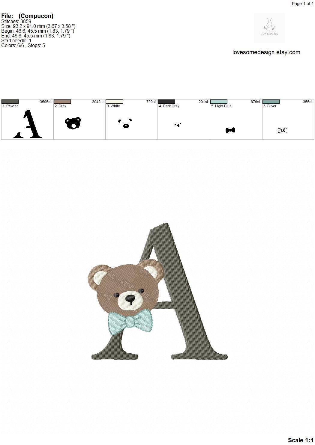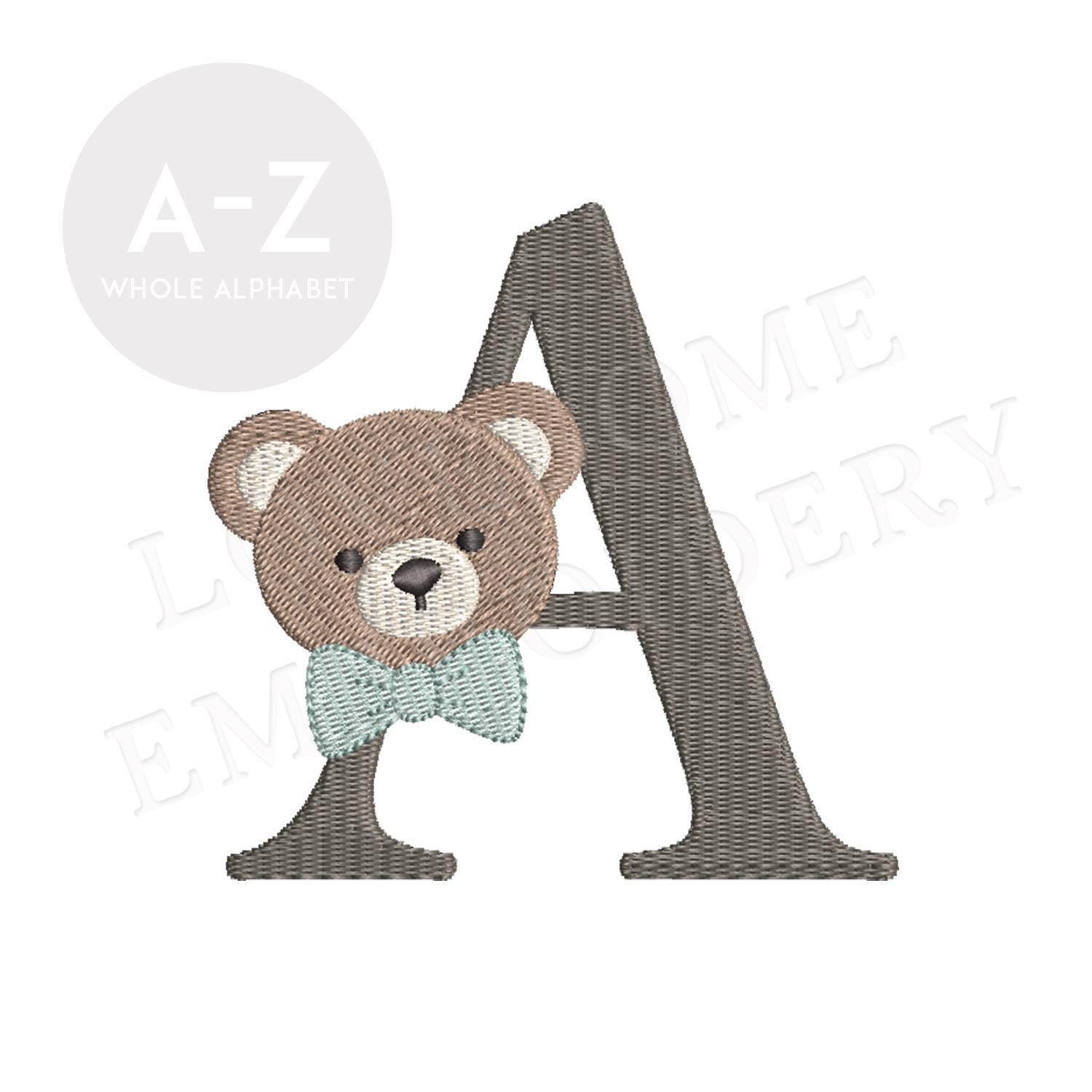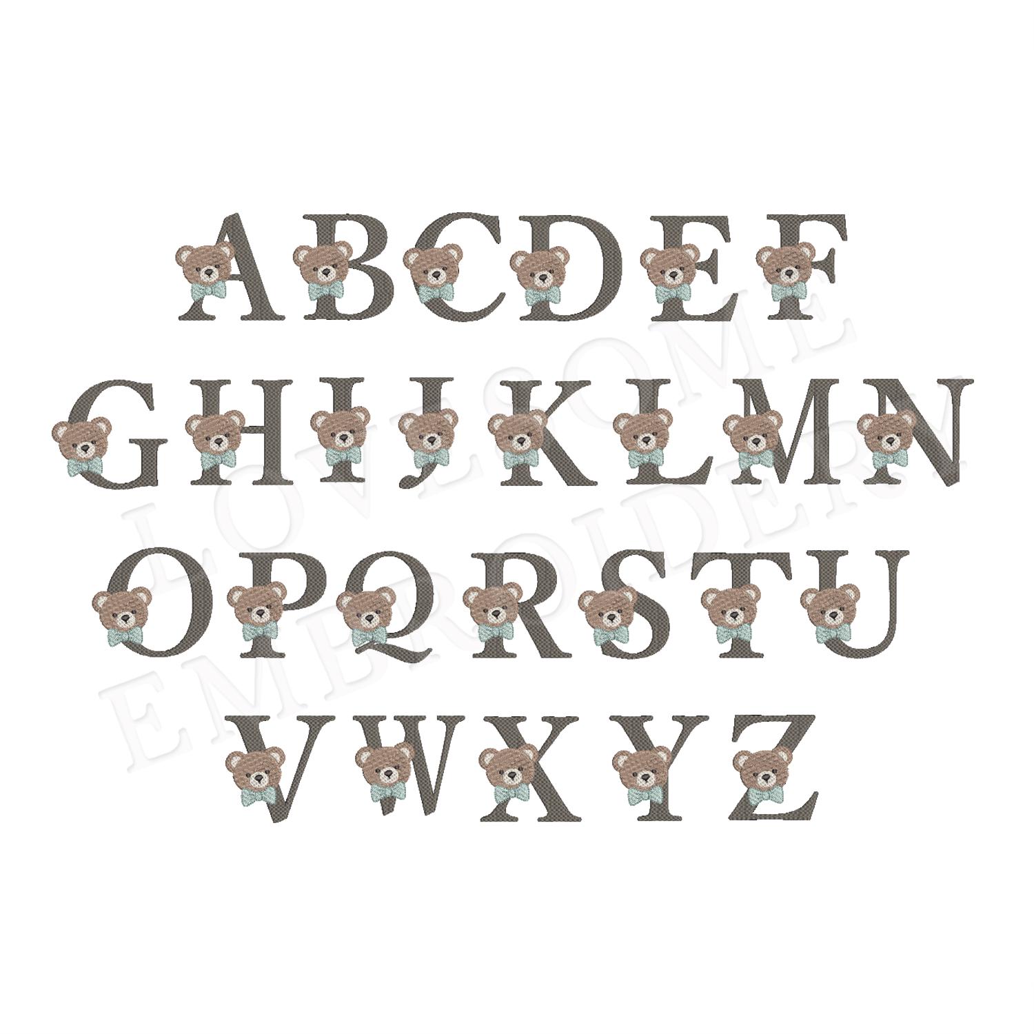 This listing features a machine embroidery font set which includes embroidery files of 26 uppercase monogram letters with cute teddy face with bow tie design in 4inch size. (For the whole set, pls see the listing images.)