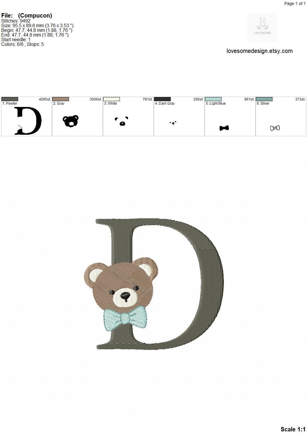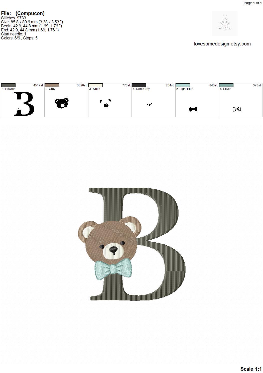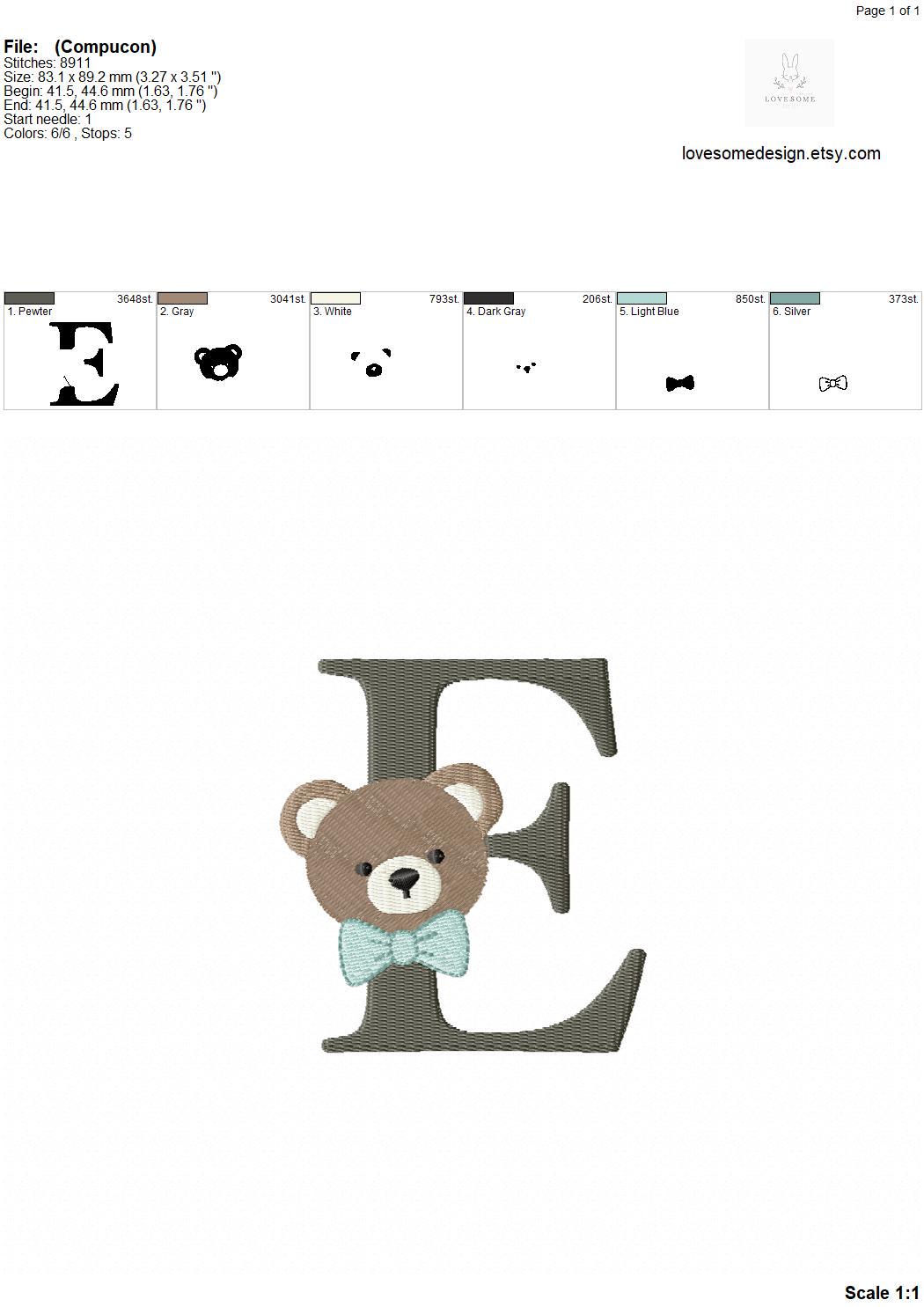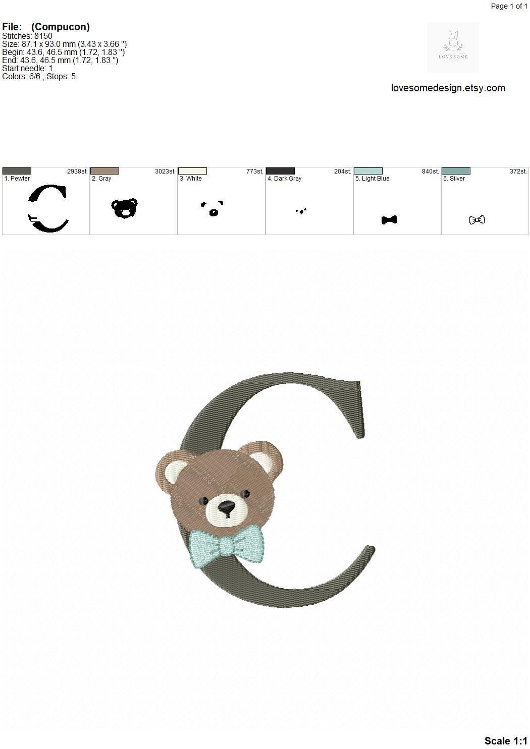 This listing features a machine embroidery font set which includes embroidery files of 26 uppercase monogram letters with cute teddy face with bow tie design in 4inch size. (For the whole set, pls see the listing images.)