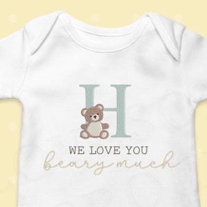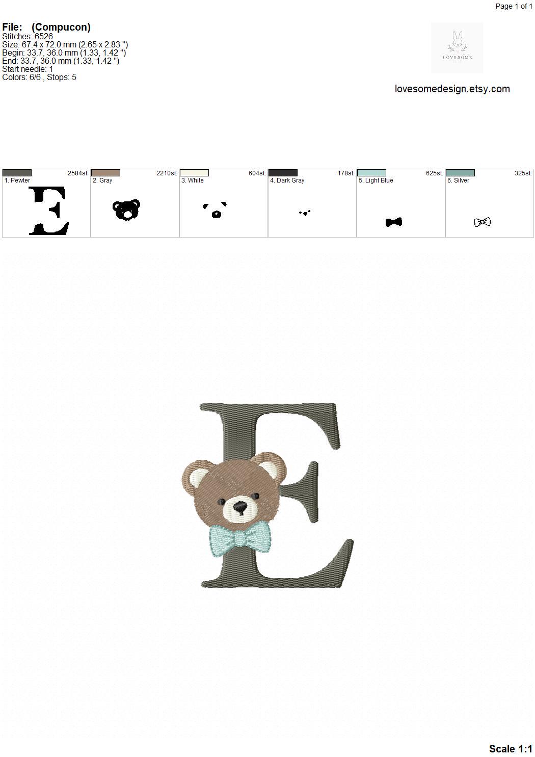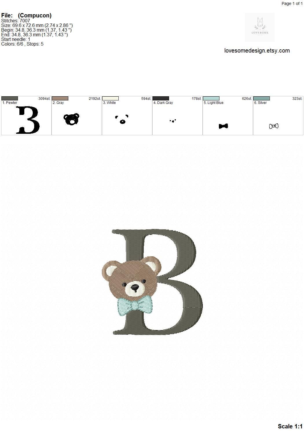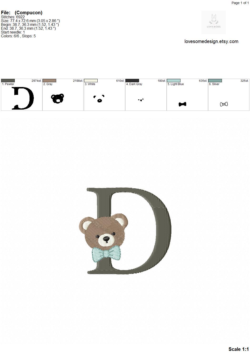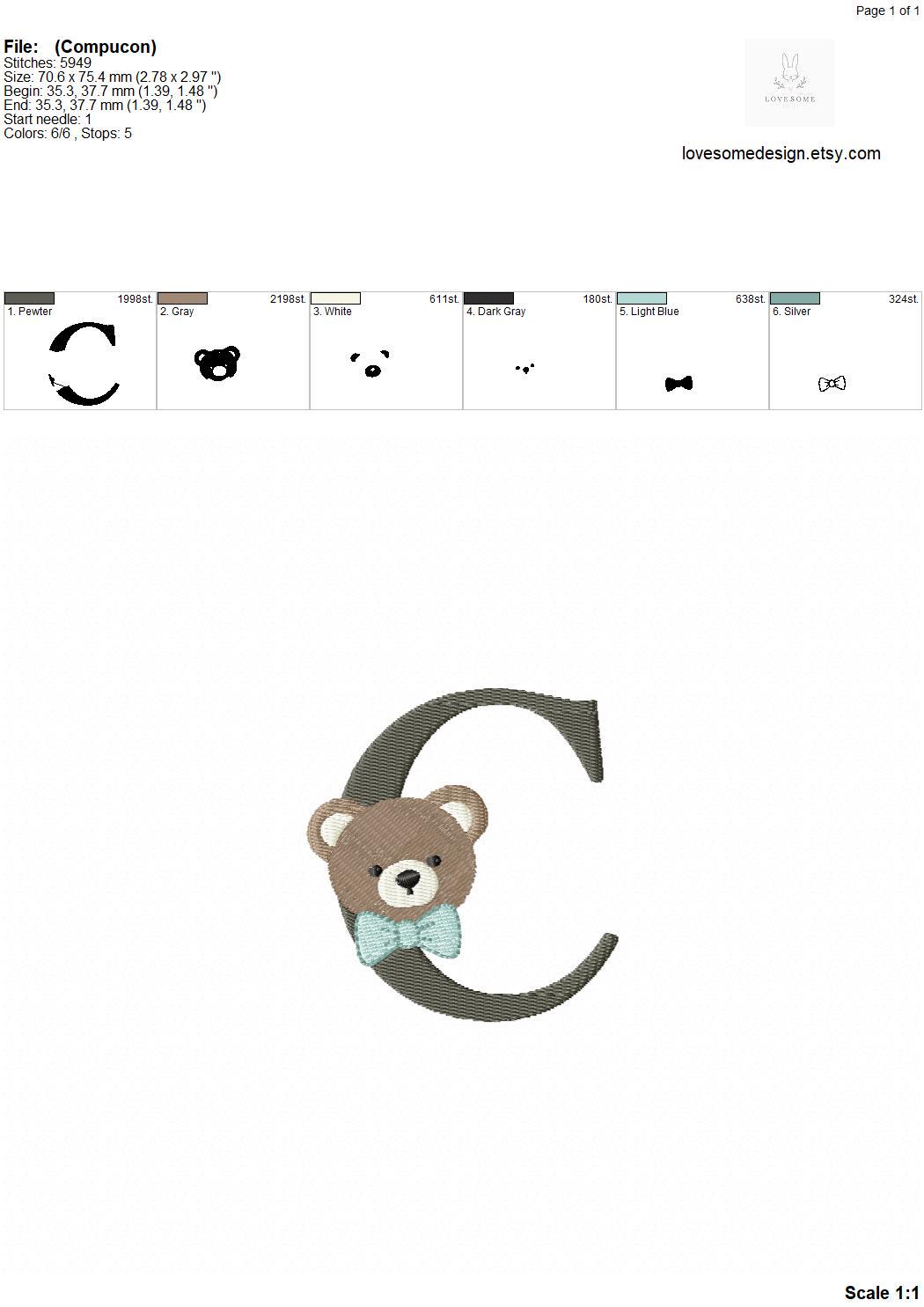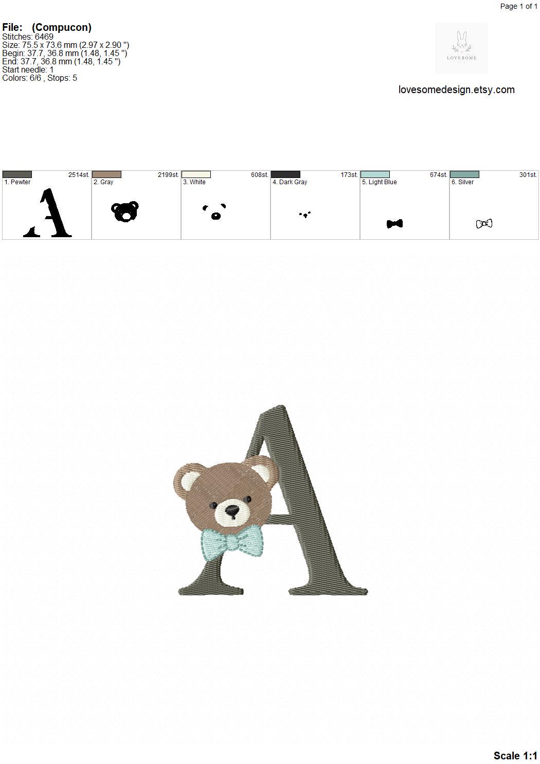 This listing features a machine embroidery font set which includes embroidery files of 26 uppercase monogram letters with cute teddy face with bow tie design in 3inch size. (For the whole set, pls see the listing images.)