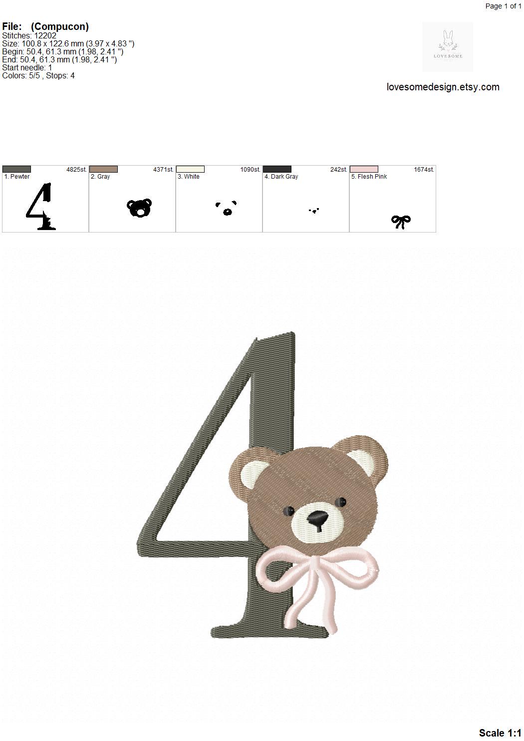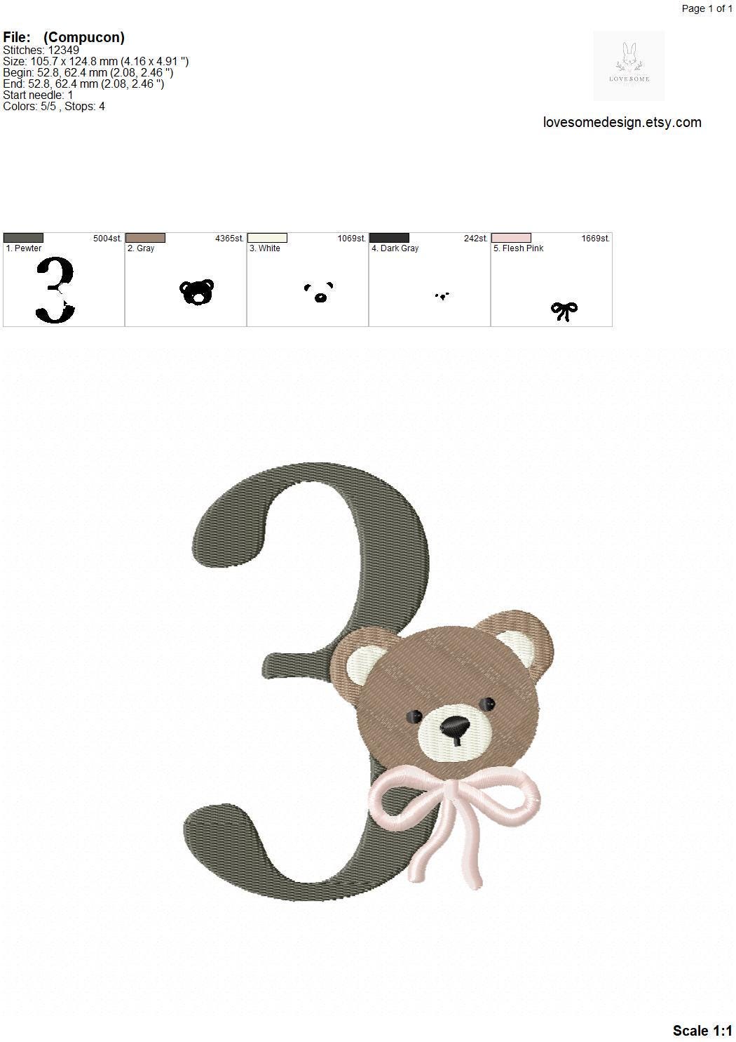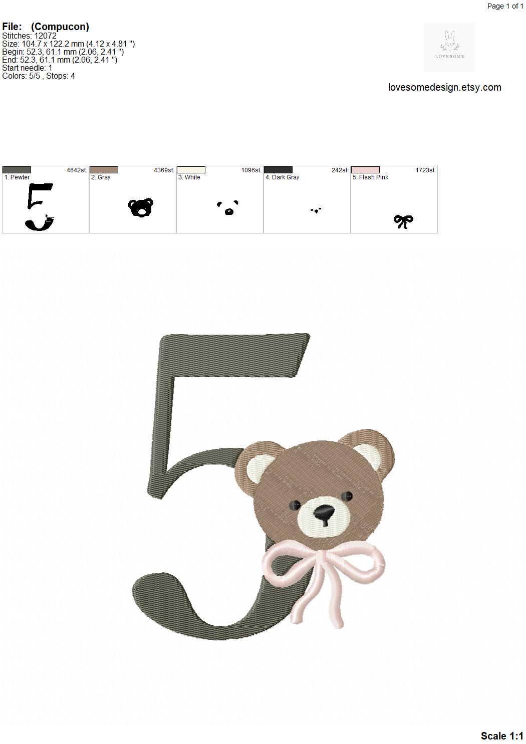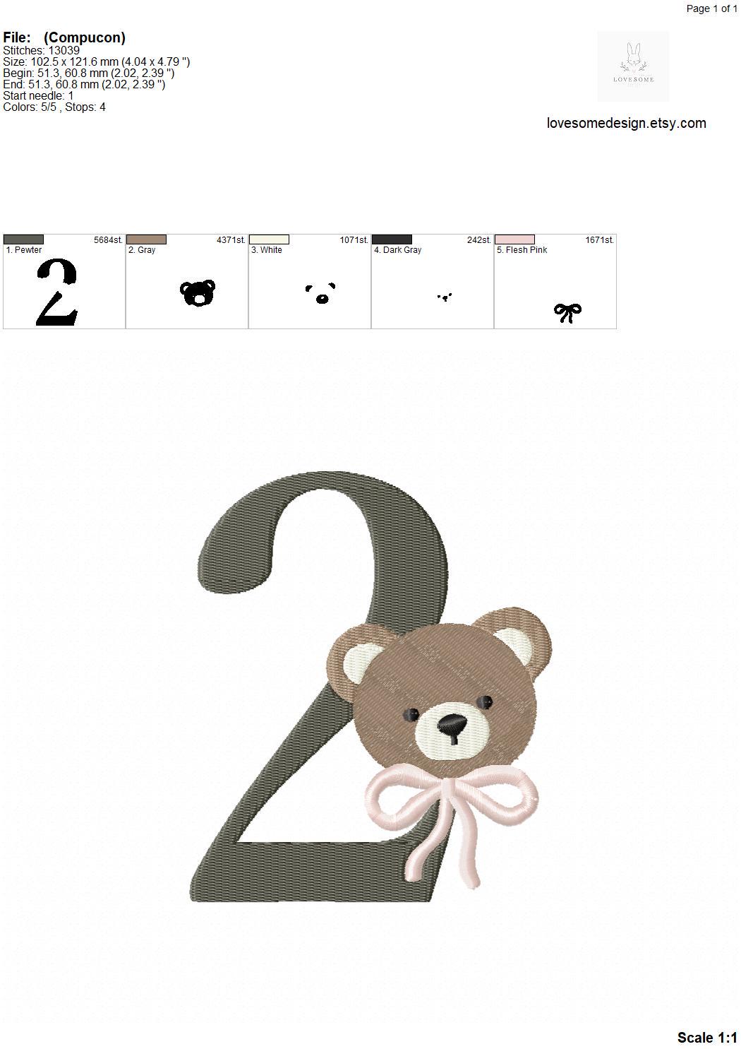 This listing features a machine embroidery numbers set which includes embroidery files of ten numbers (0-9) with cute teddy with bow design in 5inch size for machine embroidery. (For the whole set, pls see the listing images.)