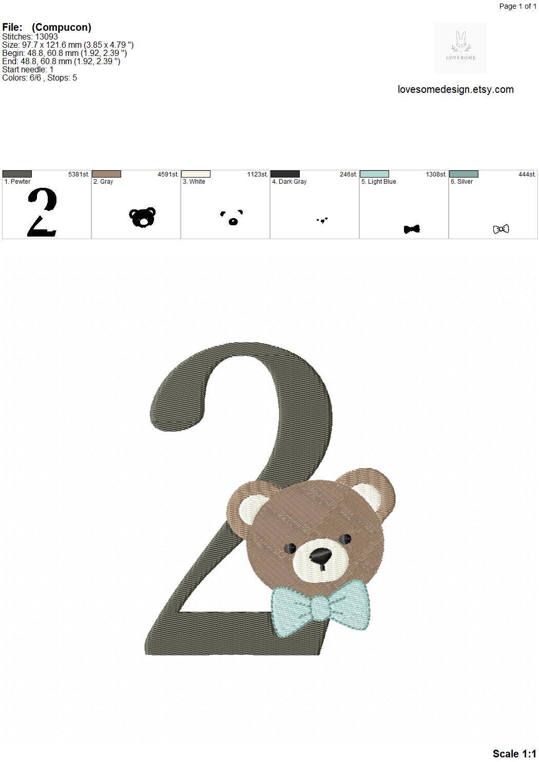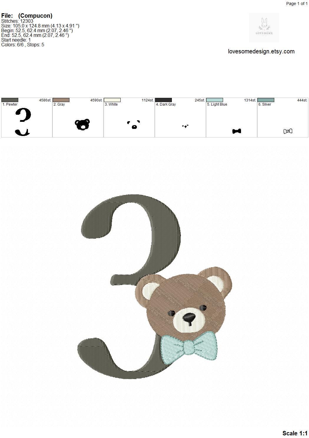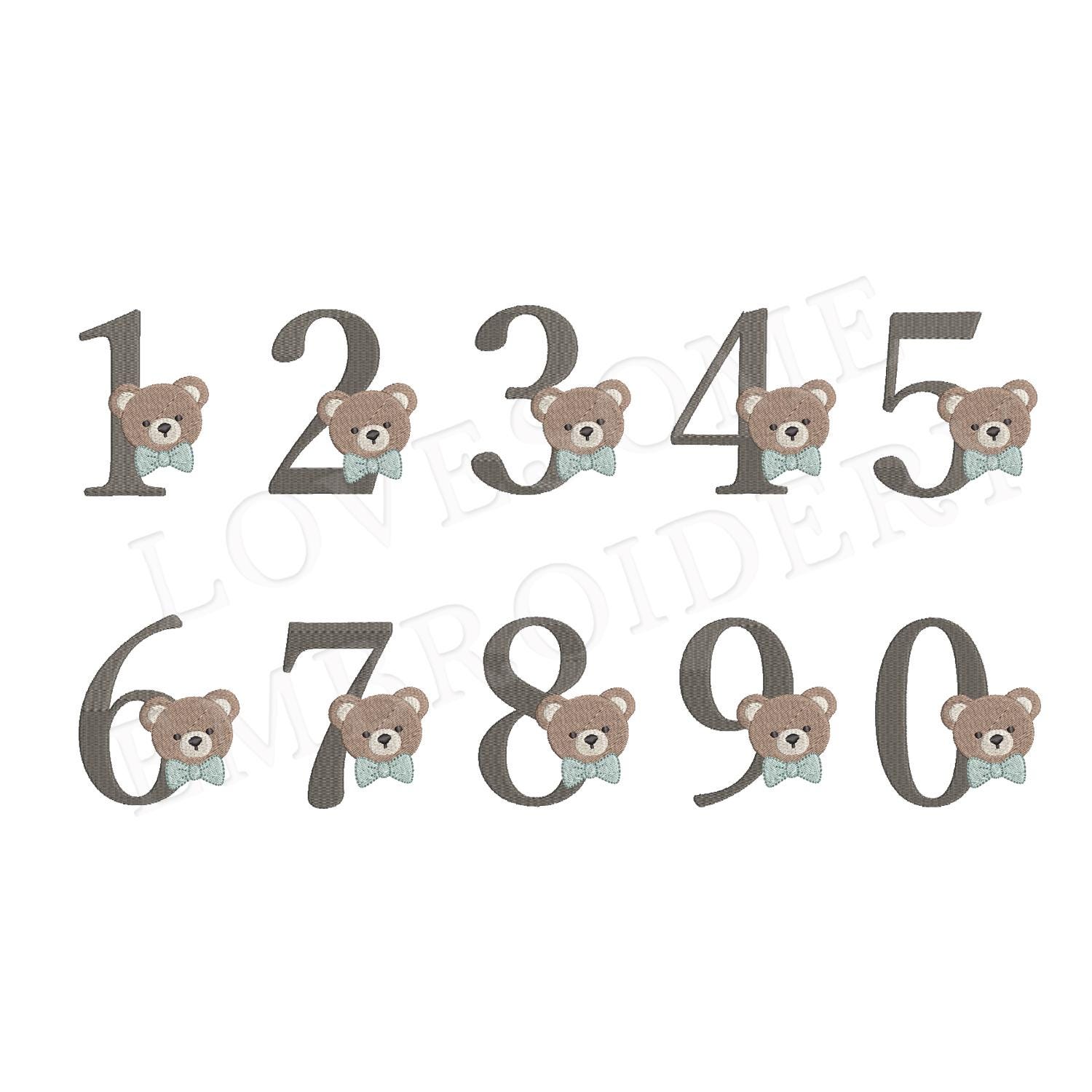 This listing features a machine embroidery numbers set which includes embroidery files of ten numbers (0-9) with cute teddy with bow tie design in 5inch size for machine embroidery. (For the whole set, pls see the listing images.)