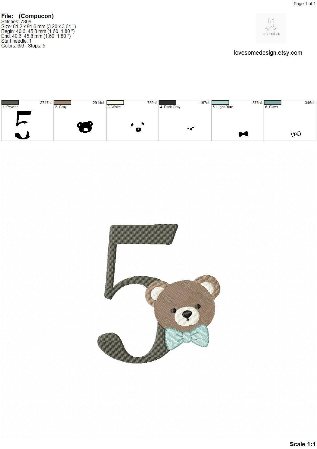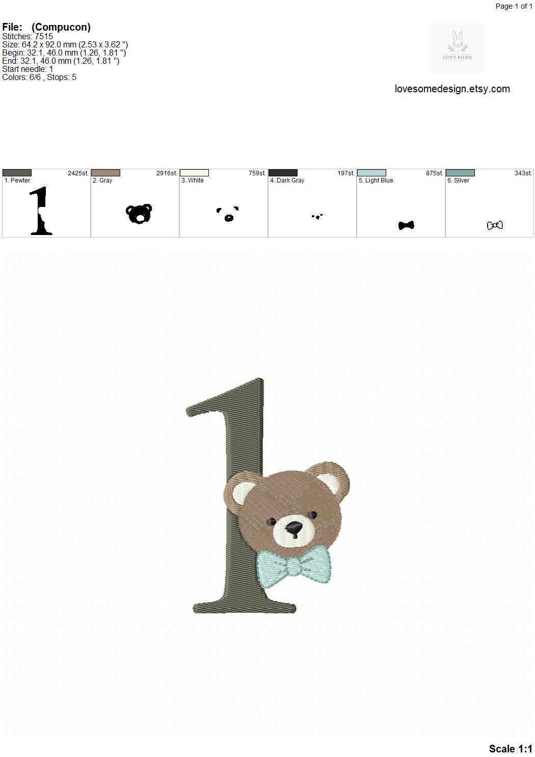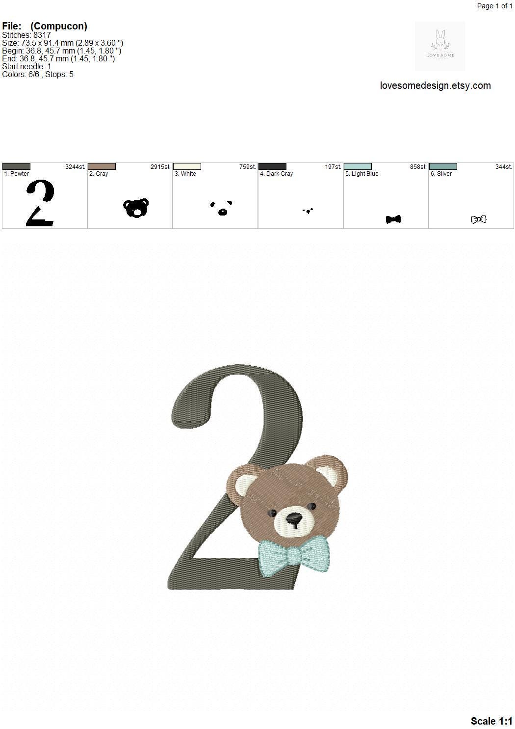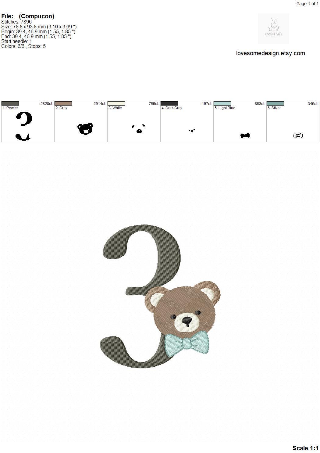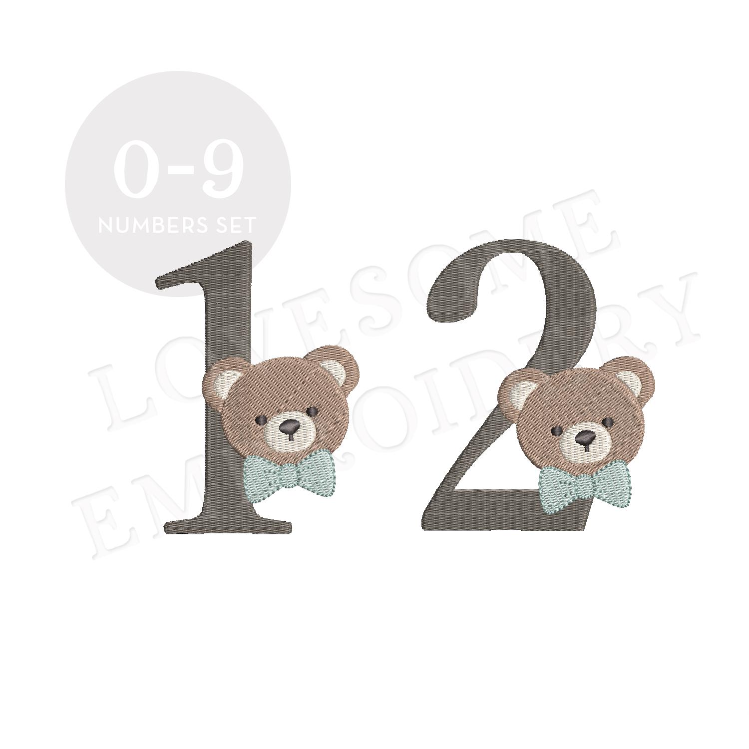 This listing features a machine embroidery numbers set which includes embroidery files of ten numbers (0-9) with cute teddy with bow tie design in 4inch size for machine embroidery. (For the whole set, pls see the listing images.)