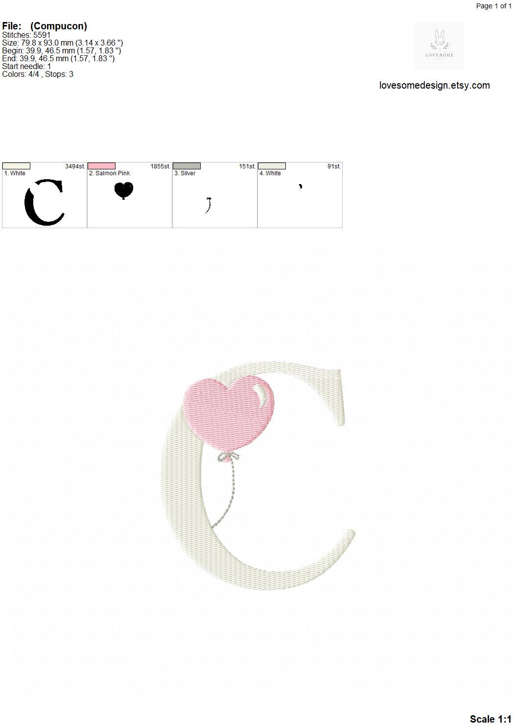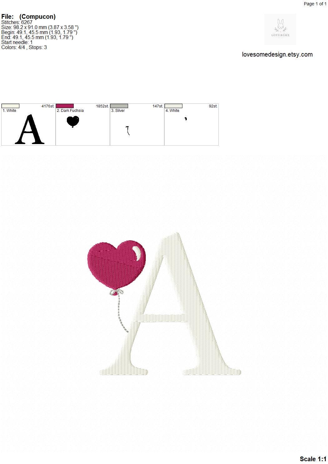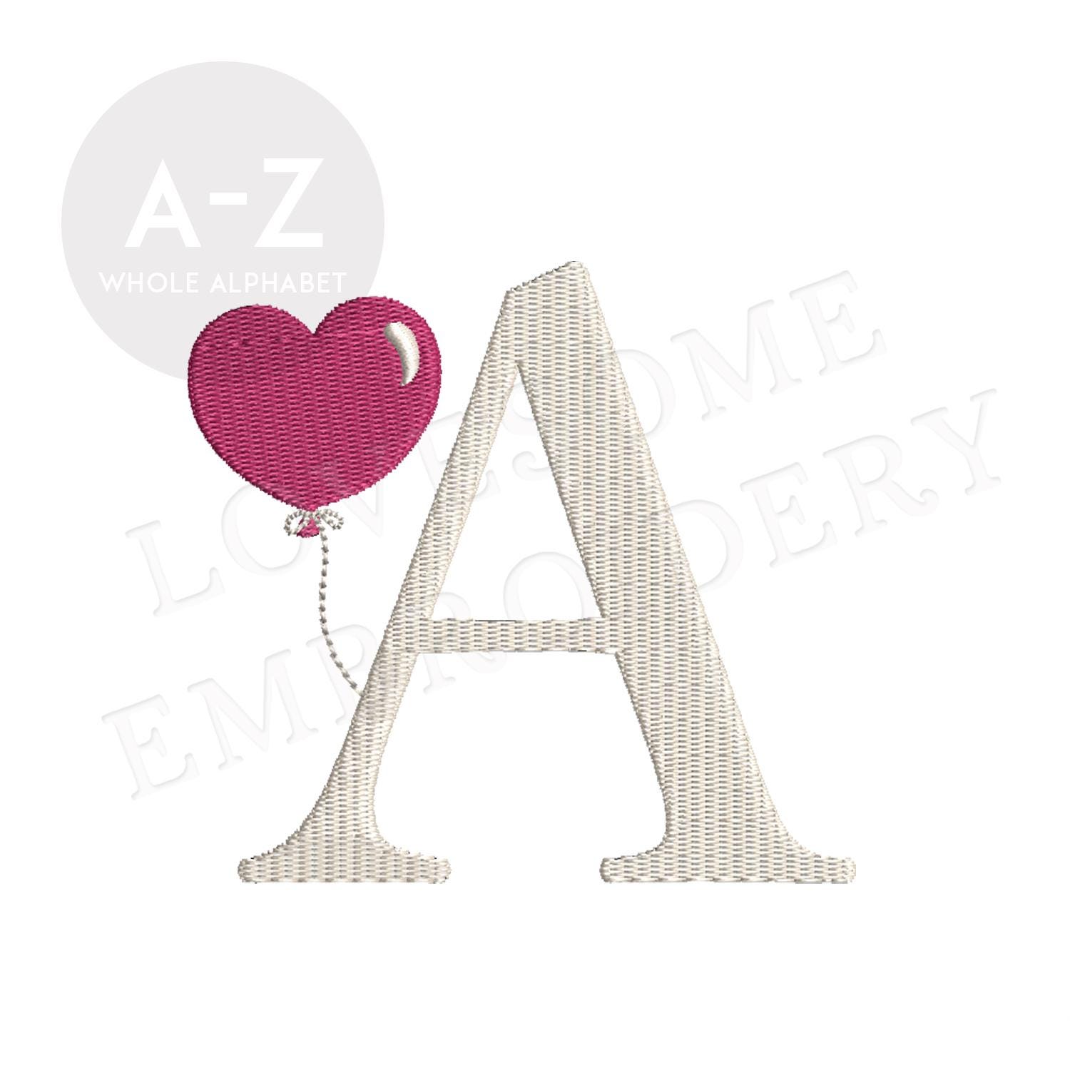 This listing features a machine embroidery font set which includes embroidery files of 26 uppercase monogram letters with heart balloon design in 4inch size. (For the whole set, pls see the listing images.)
