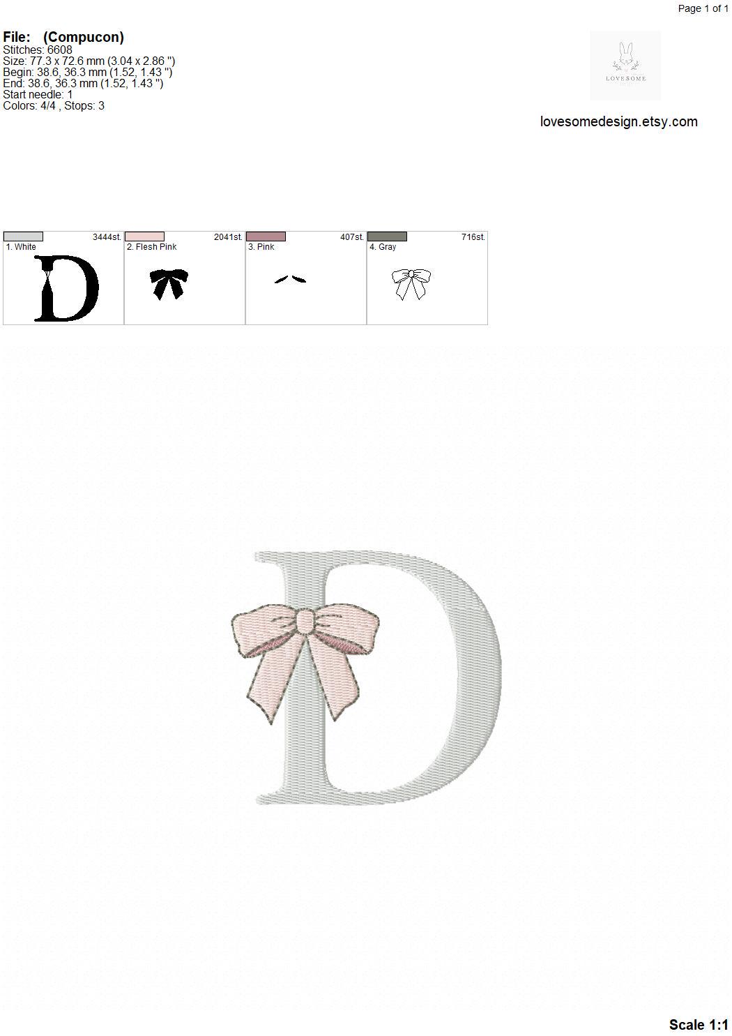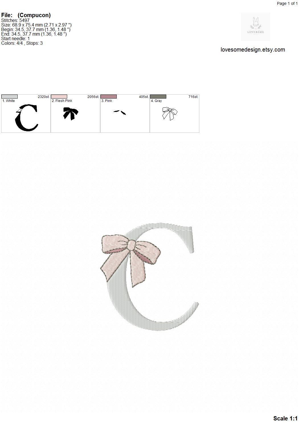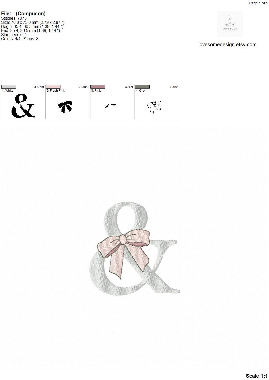 This listing features a machine embroidery font set which includes embroidery files of 26 uppercase monogram letters and an ampersand with a pretty coquette bow design in 3inch size. (For the whole set, pls see the listing images.)