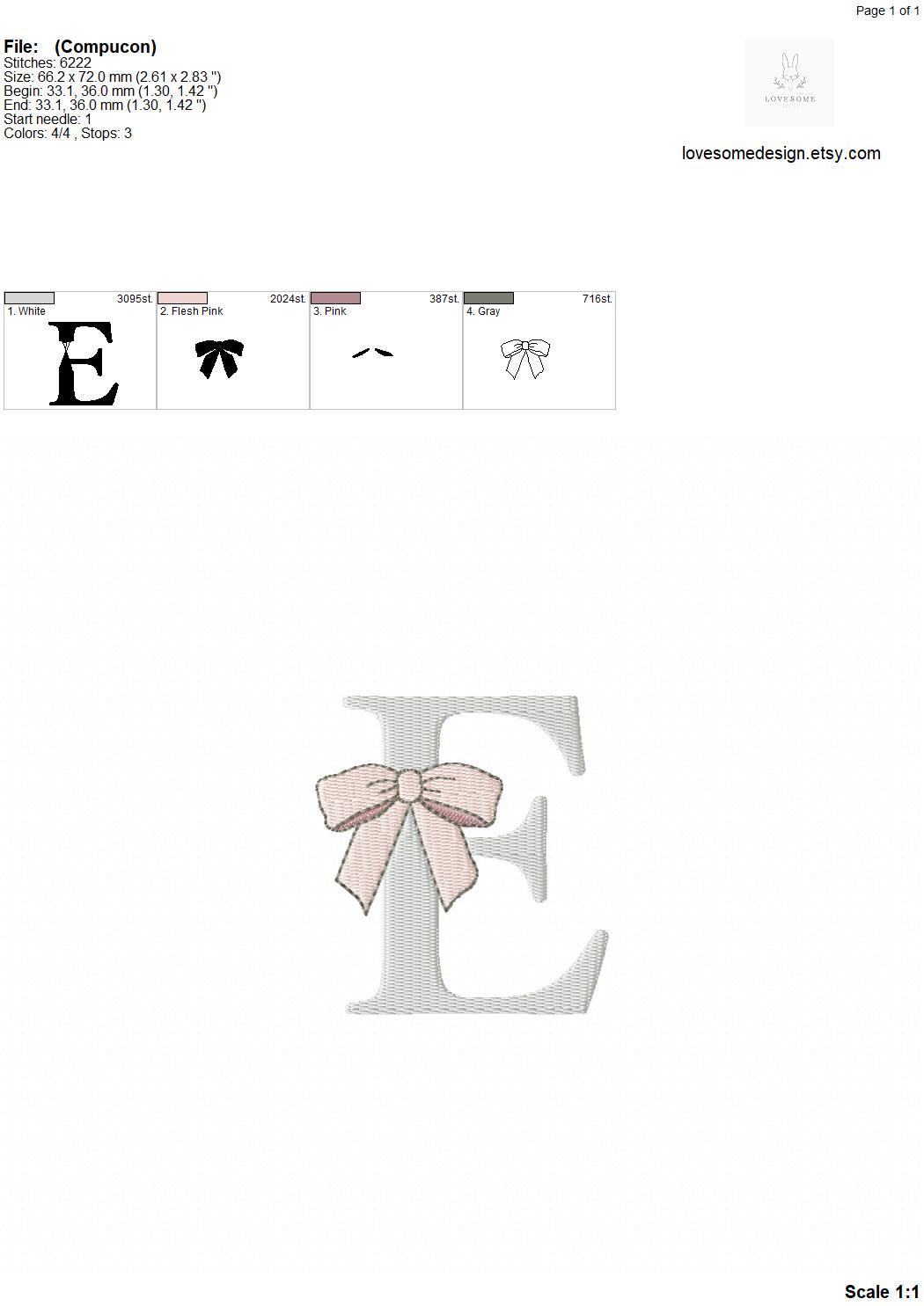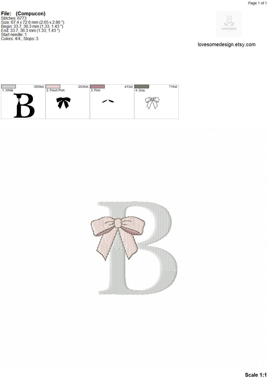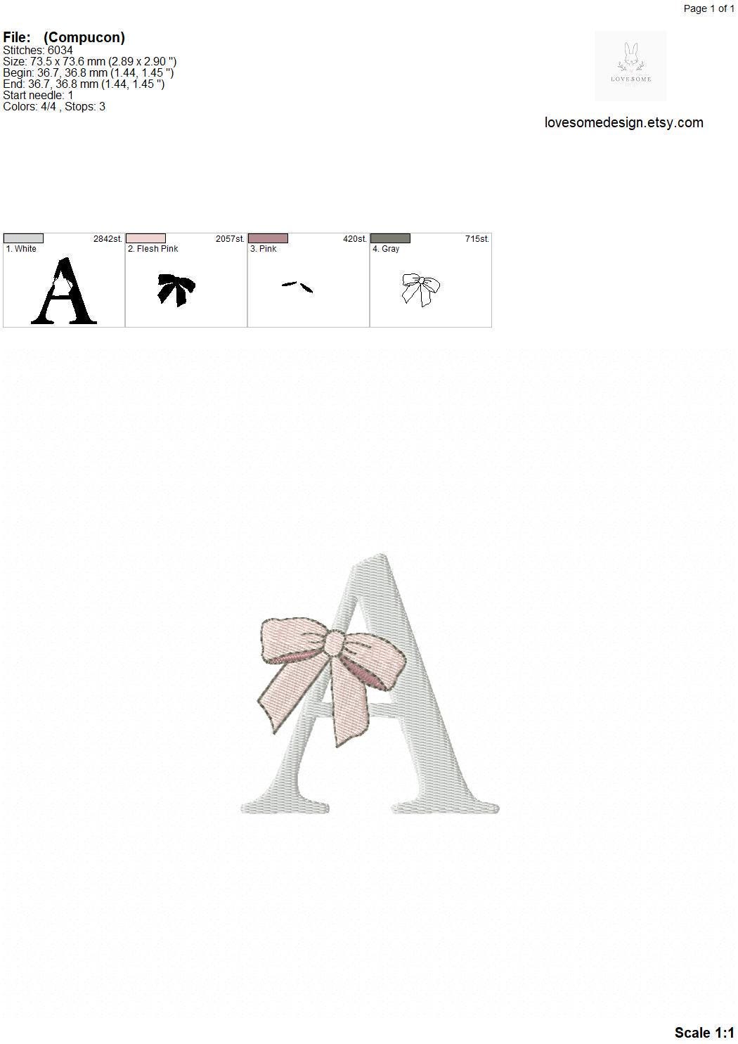 This listing features a machine embroidery font set which includes embroidery files of 26 uppercase monogram letters and an ampersand with a pretty coquette bow design in 3inch size. (For the whole set, pls see the listing images.)