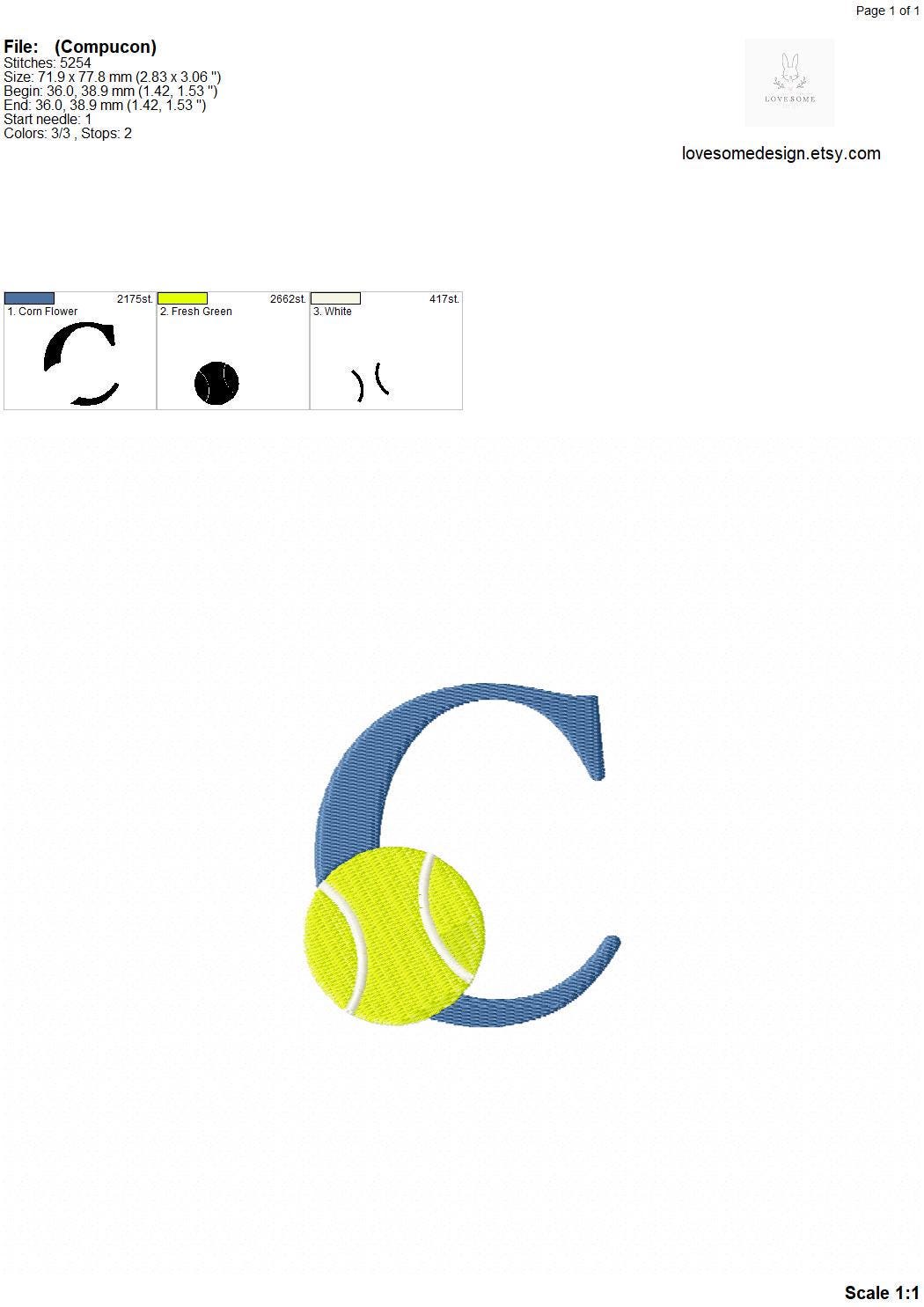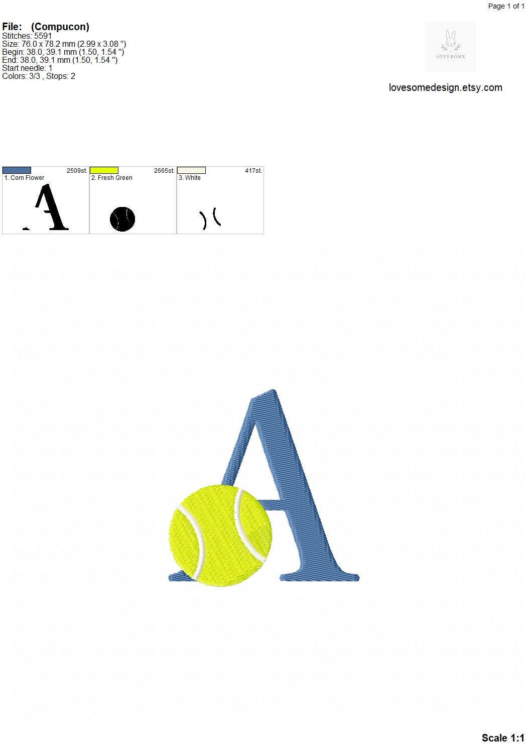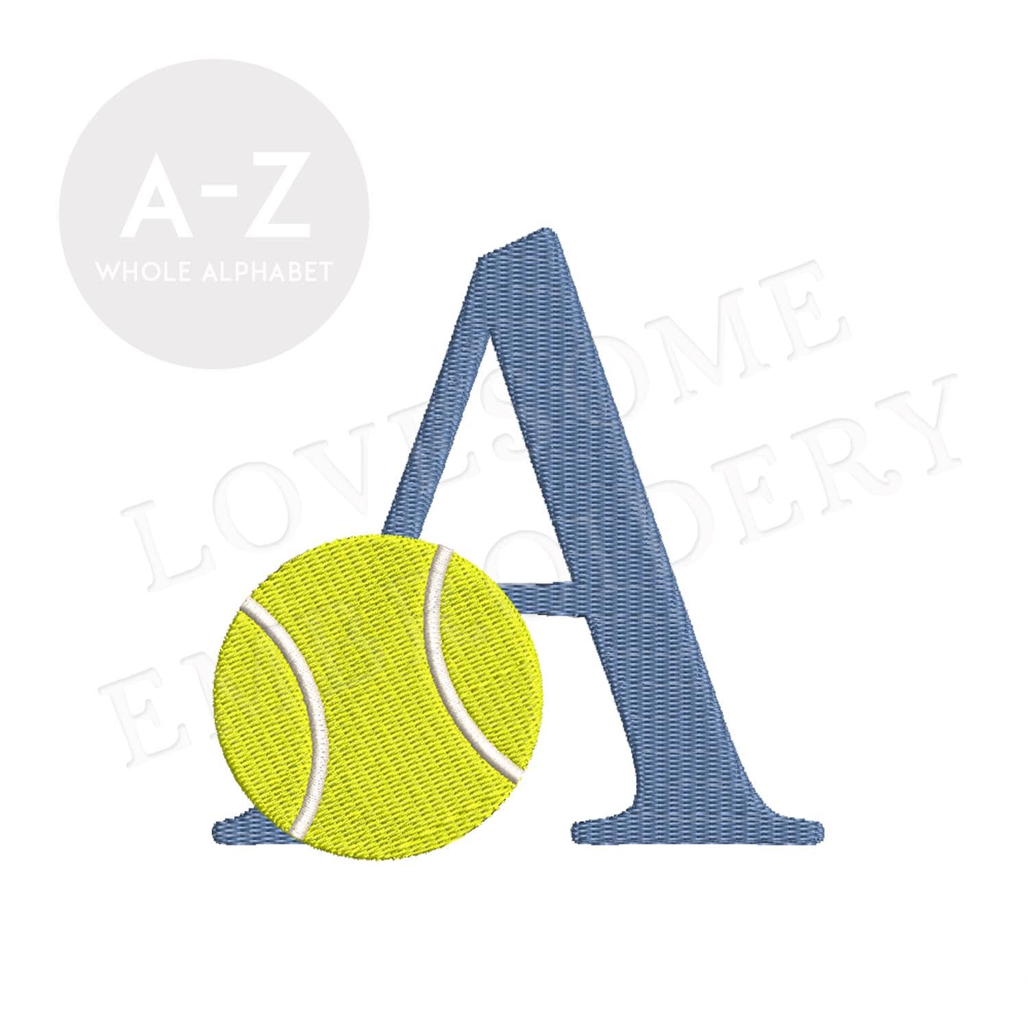 This listing features a machine embroidery font set which includes embroidery files of 26 uppercase sports embroidery letters with a tennis ball design in 3inch size. (For the whole set, pls see the listing images.)