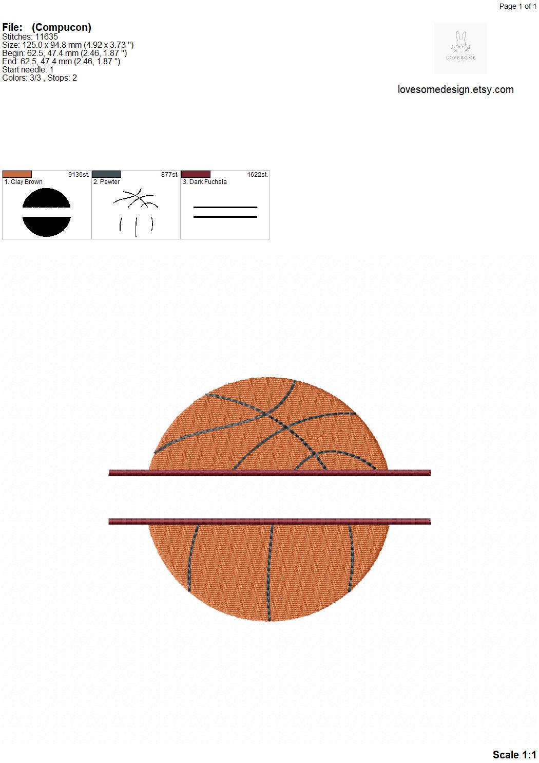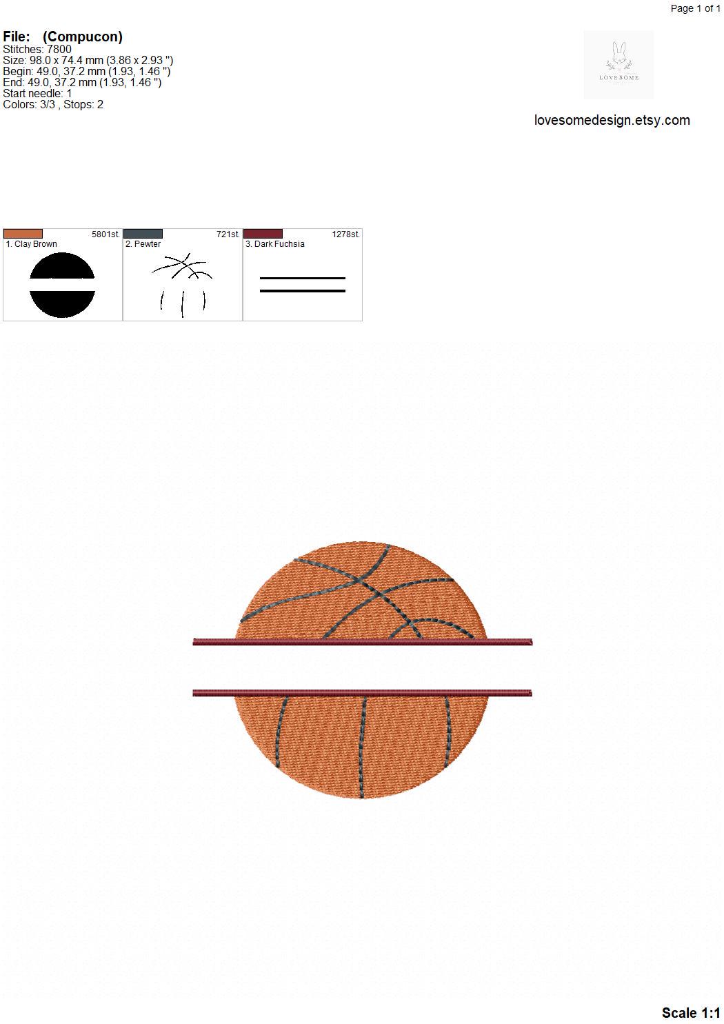 This listing includes one split basketball design for machine embroidery in two sizes, each appr. in 4inch and 5inch size.
