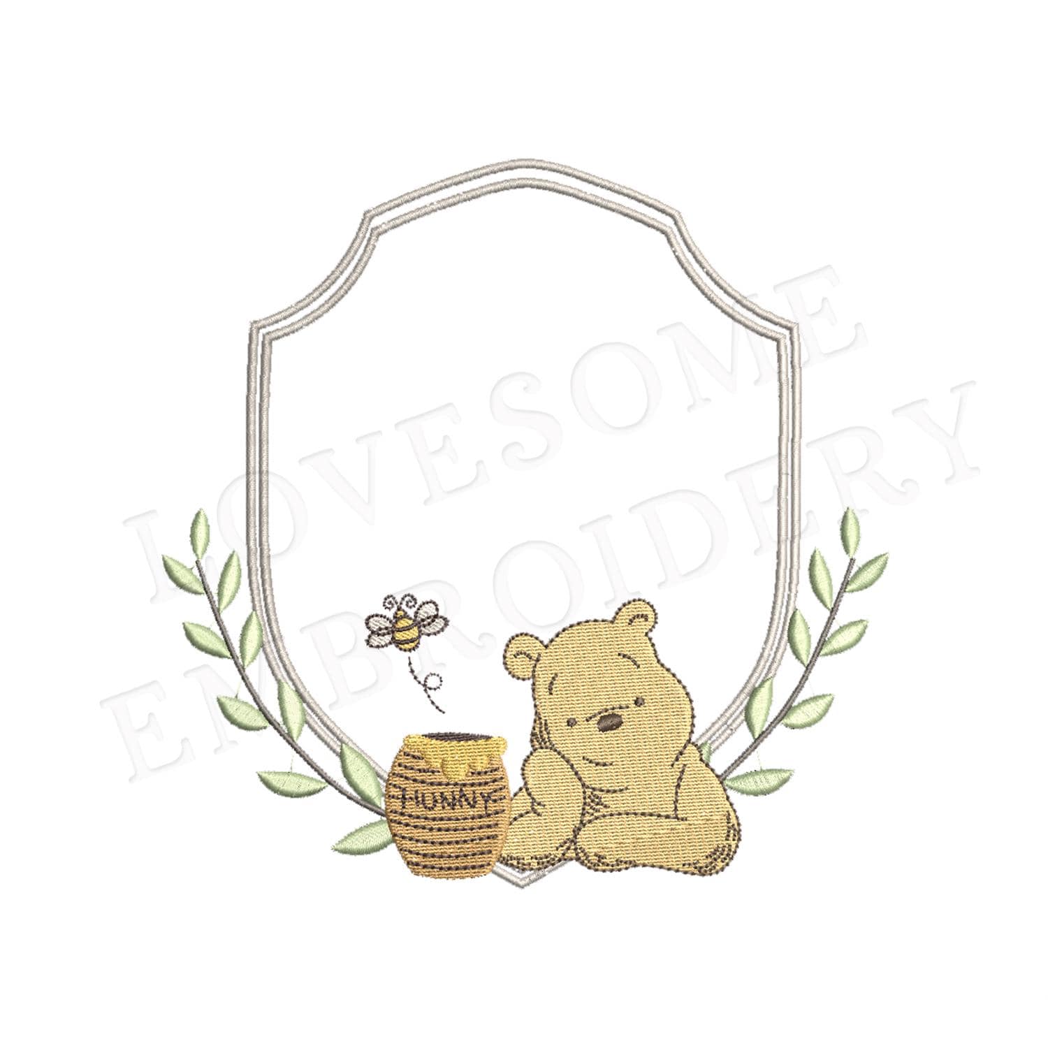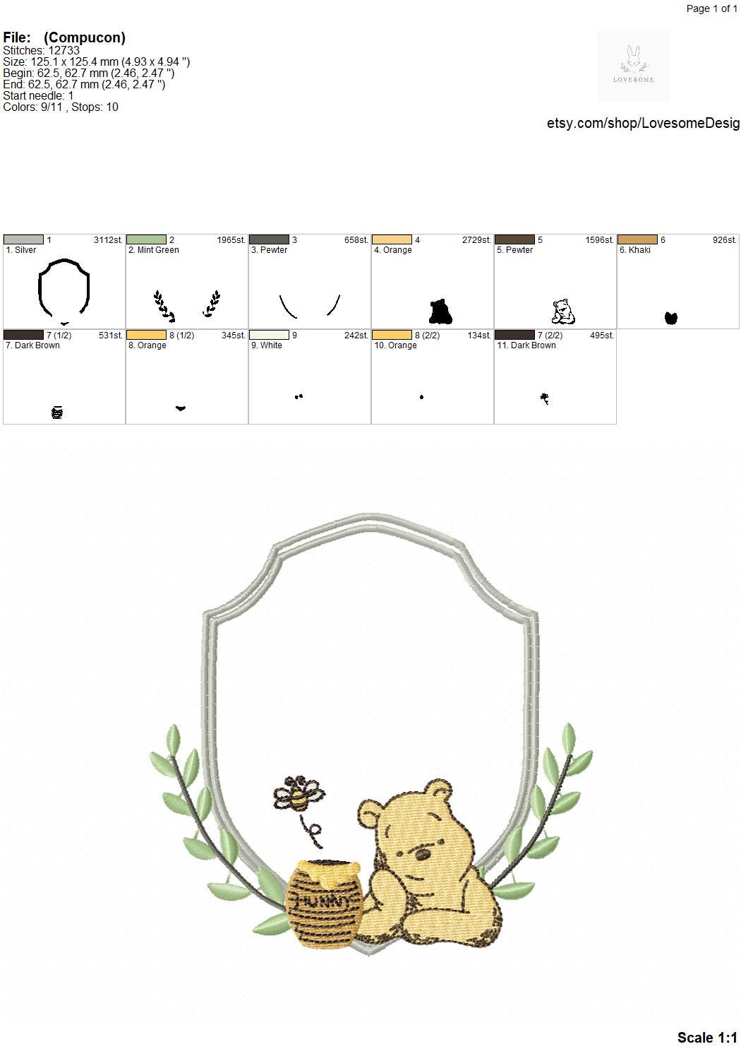 This listing features a machine embroidery file of Classic Winnie Pooh crest design in 5 inch size.