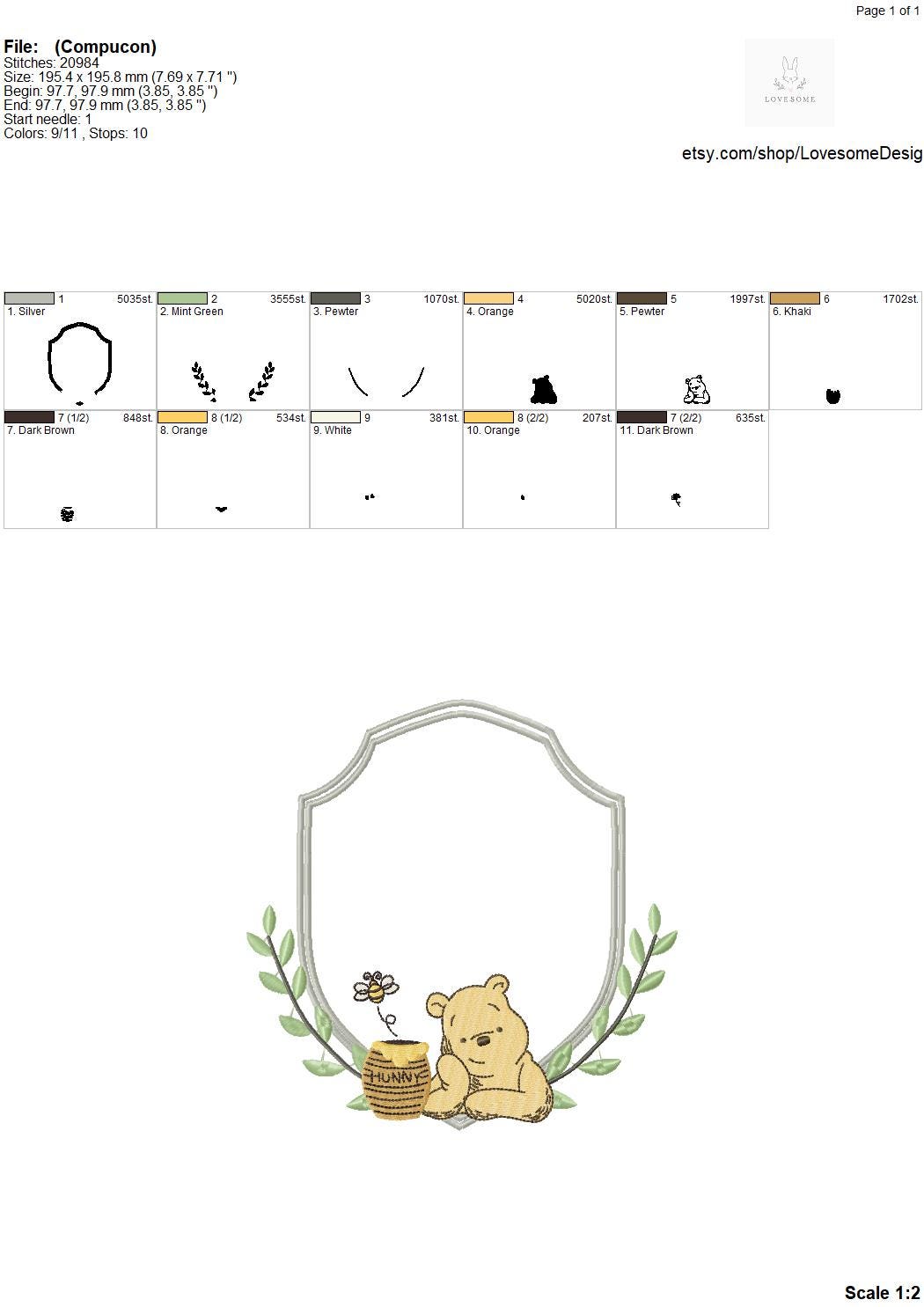 This listing features a machine embroidery file of Classic Winnie Pooh crest design in 8 inch size.