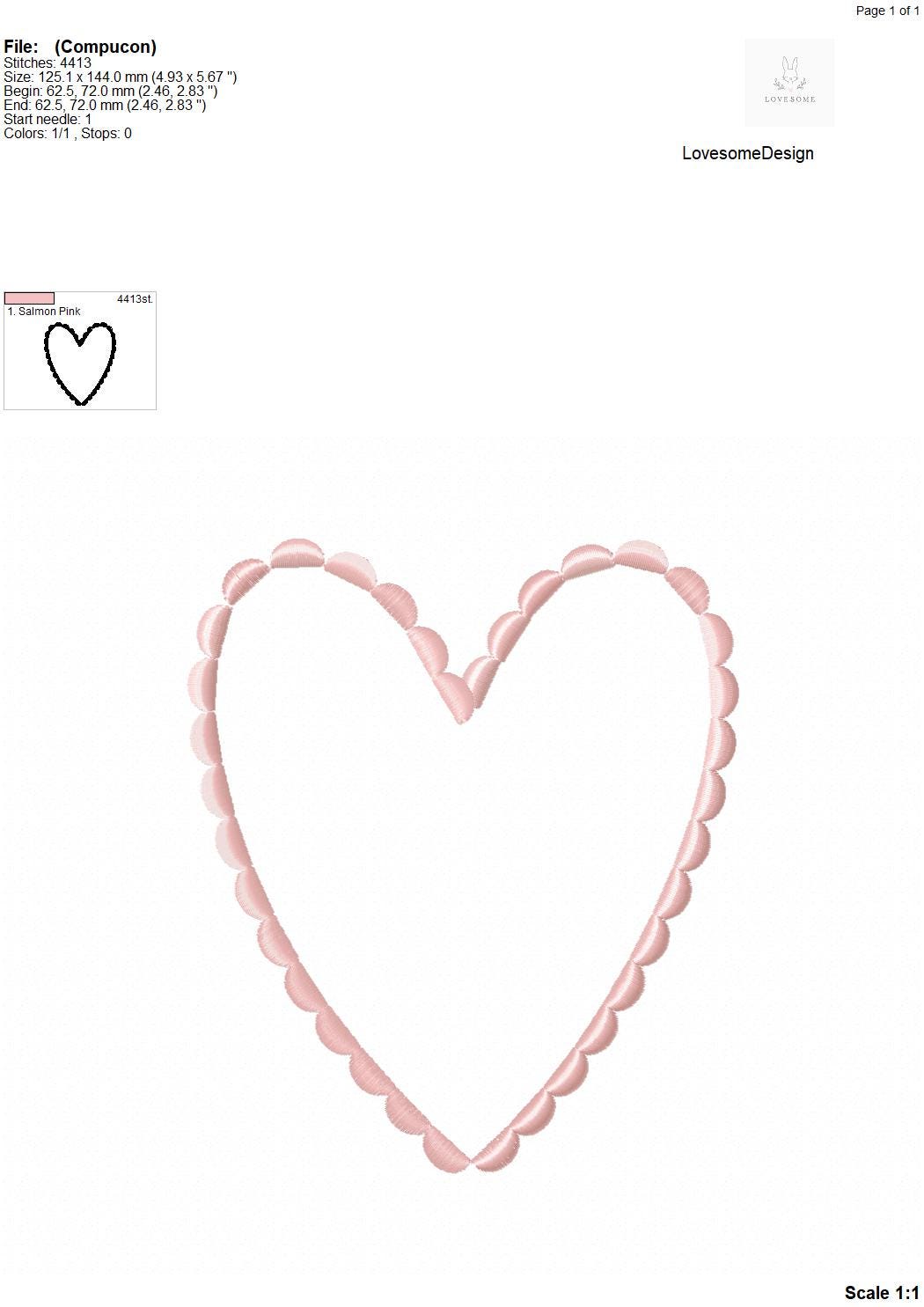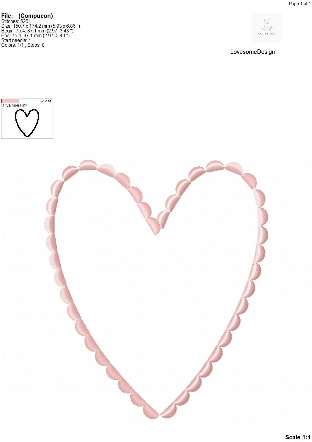 This listing includes a cute scallop edge heart frame design in two sizes, 4inch and 5inch for machine embroidery.