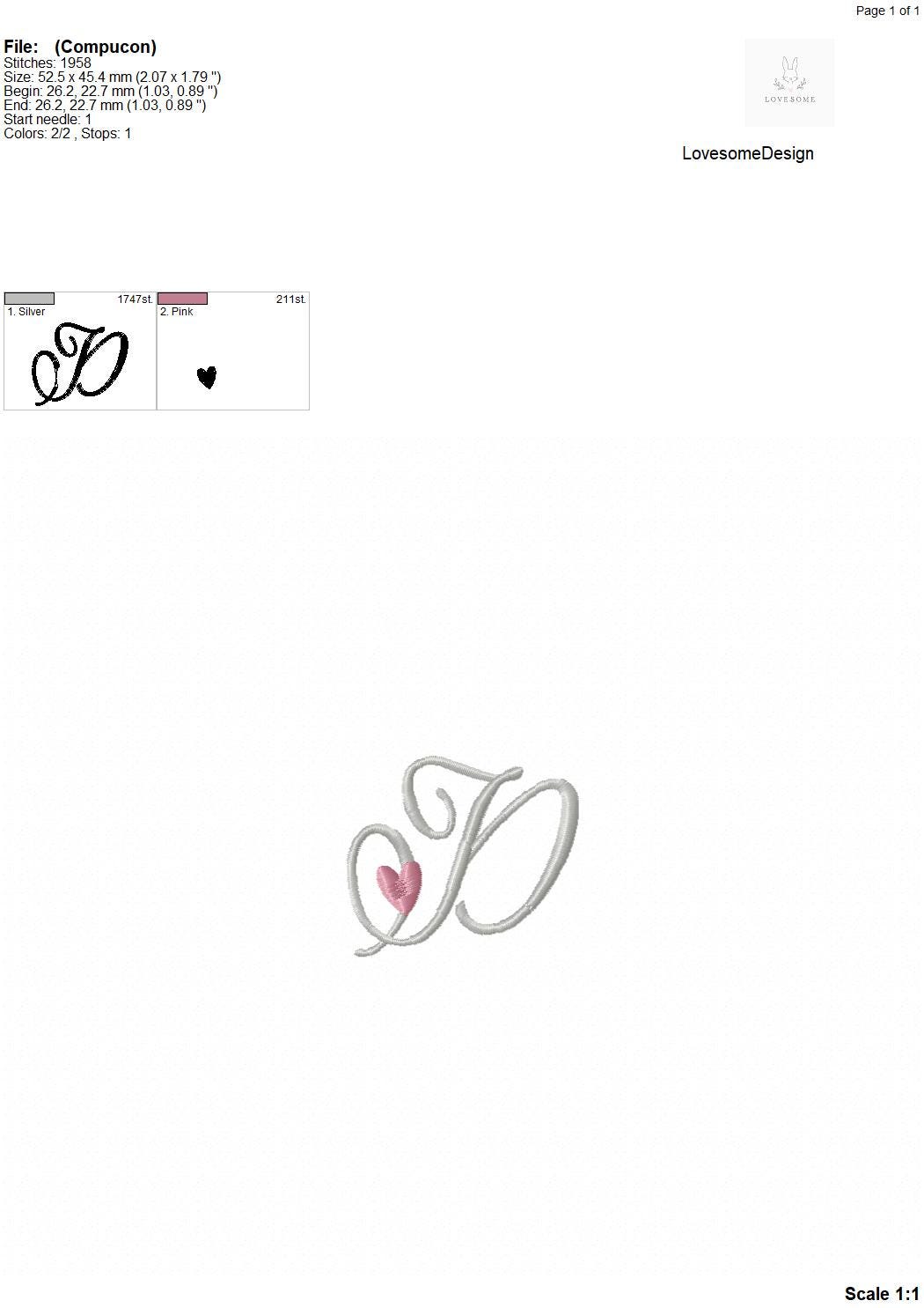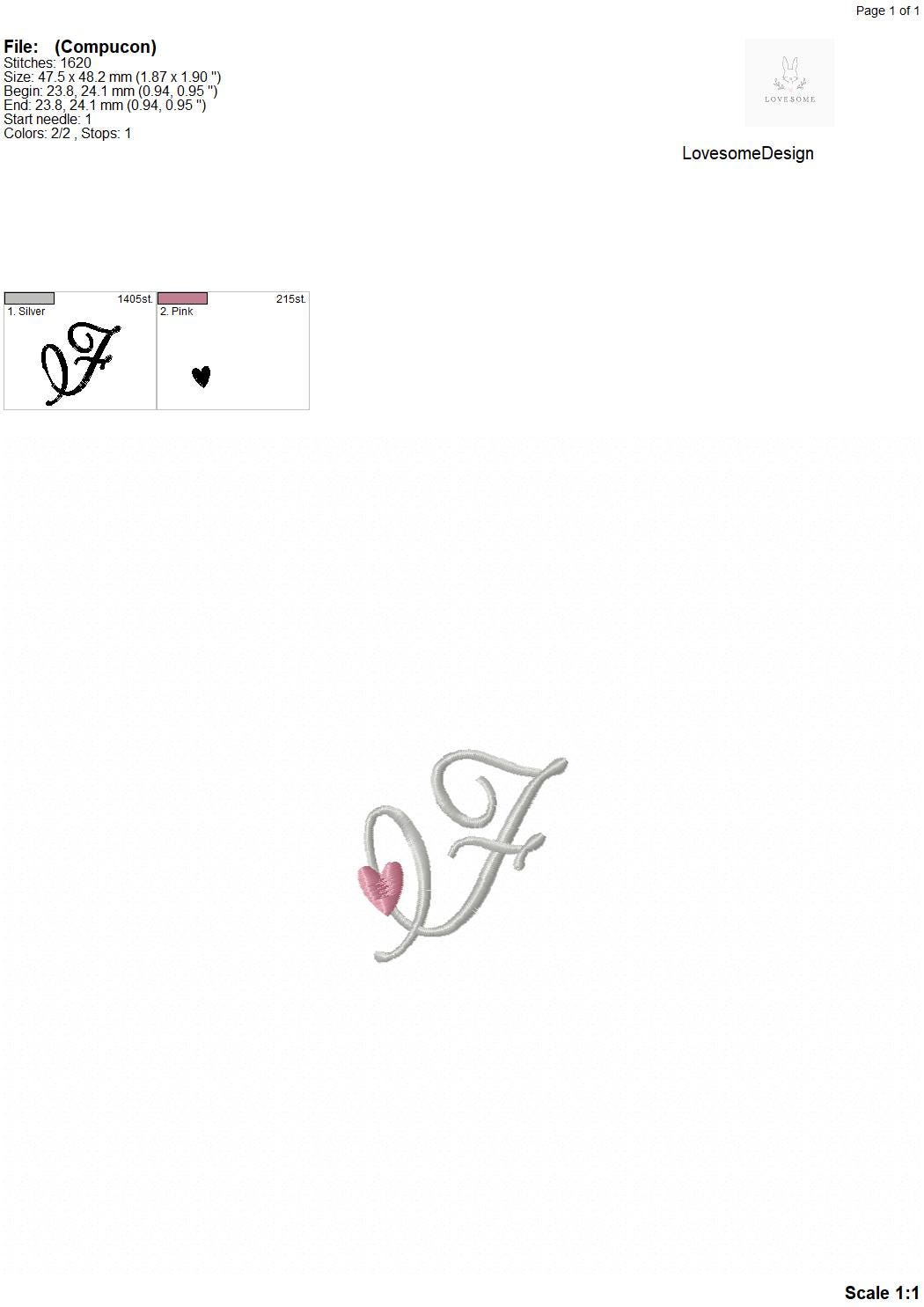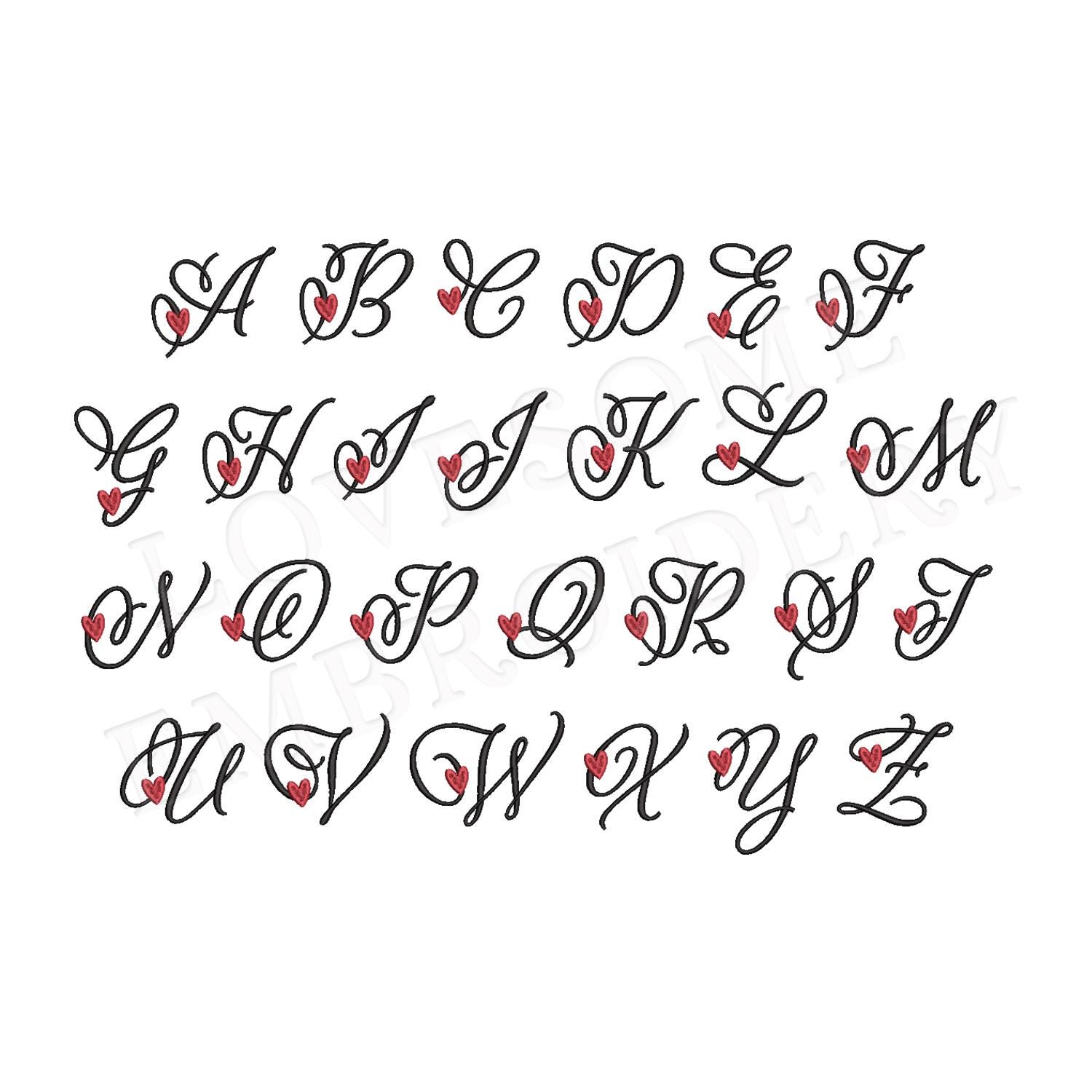 This listing features a machine embroidery font set which includes embroidery files of 26 uppercase cursive calligraphy letters with heart design in 2inch size. (For the whole set, pls see the listing images.)