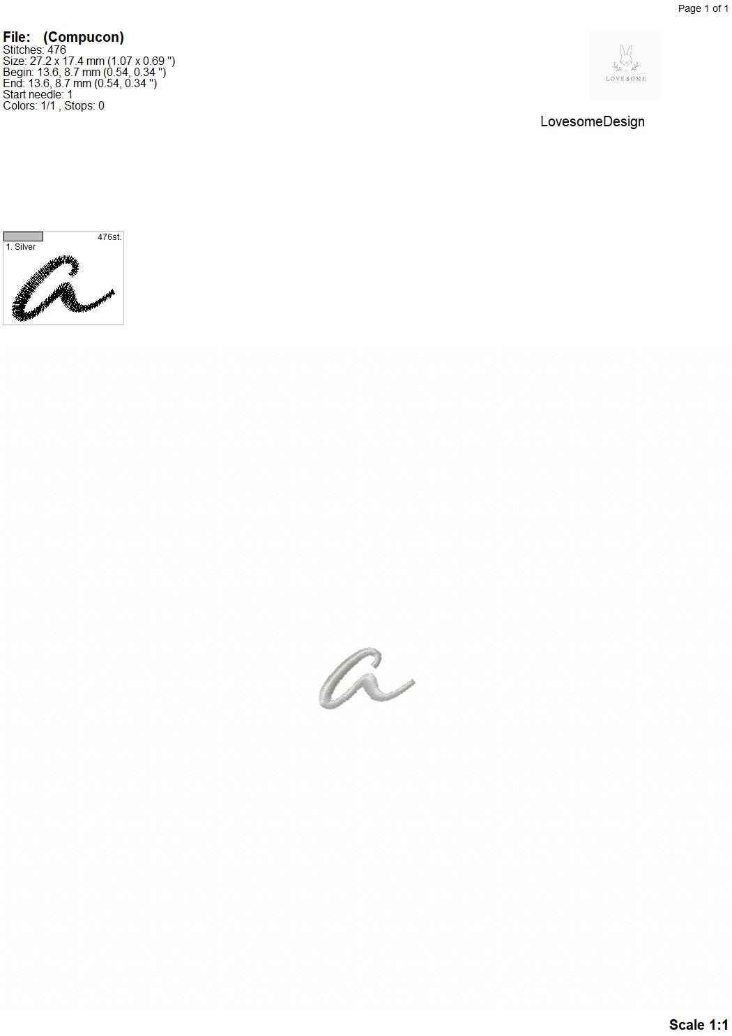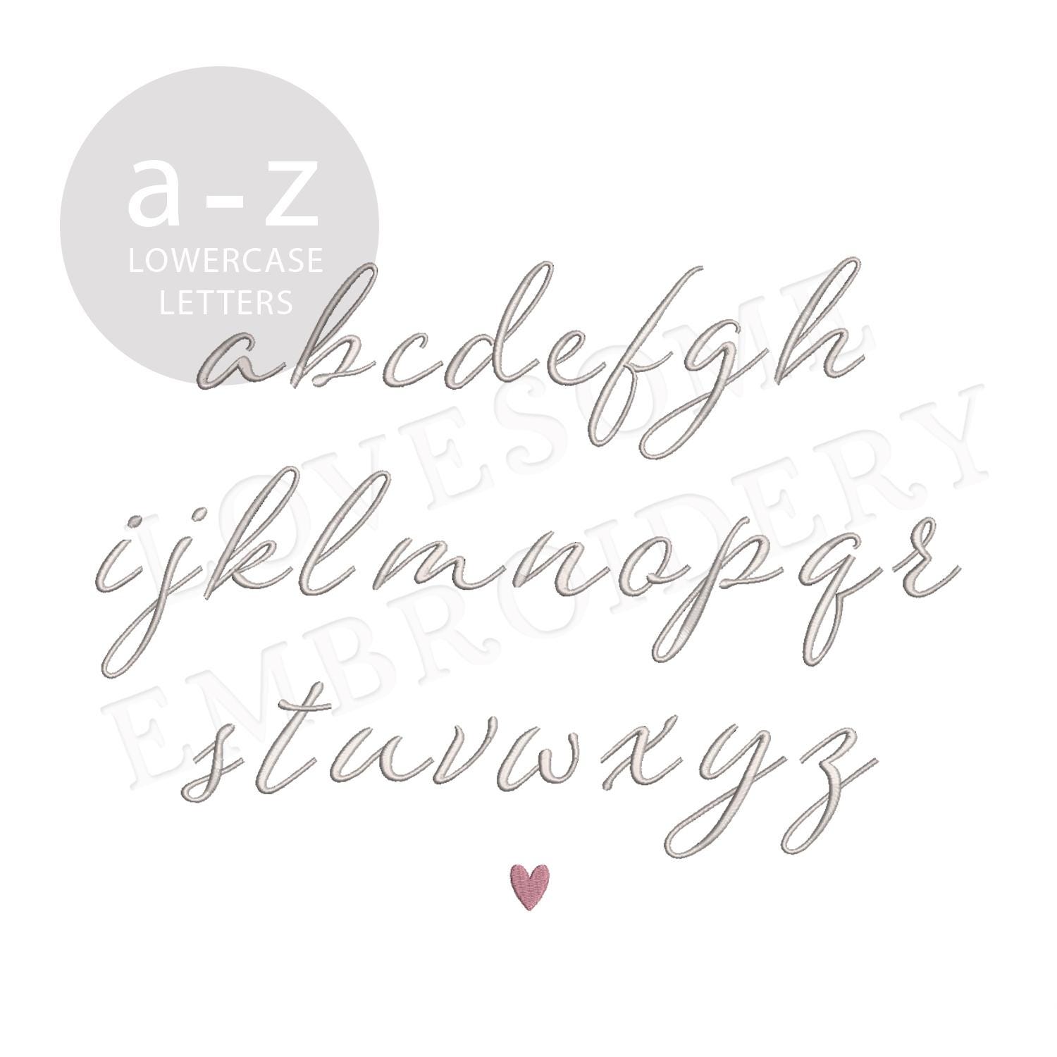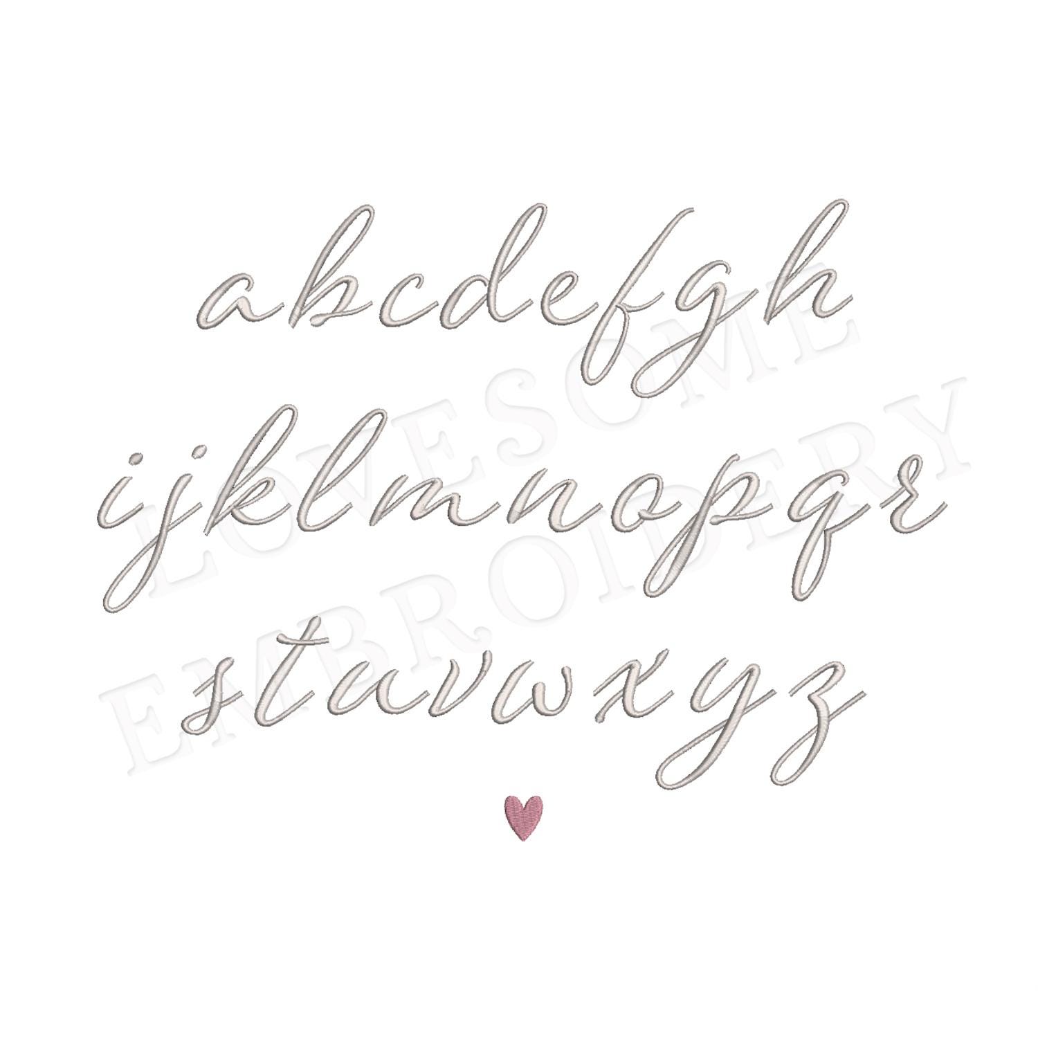 This listing features a machine embroidery font set which includes embroidery files of 26 lowercase cursive calligraphy letters and a cute heart design in appr. 2inch size. (For the whole set, pls see the listing images.)