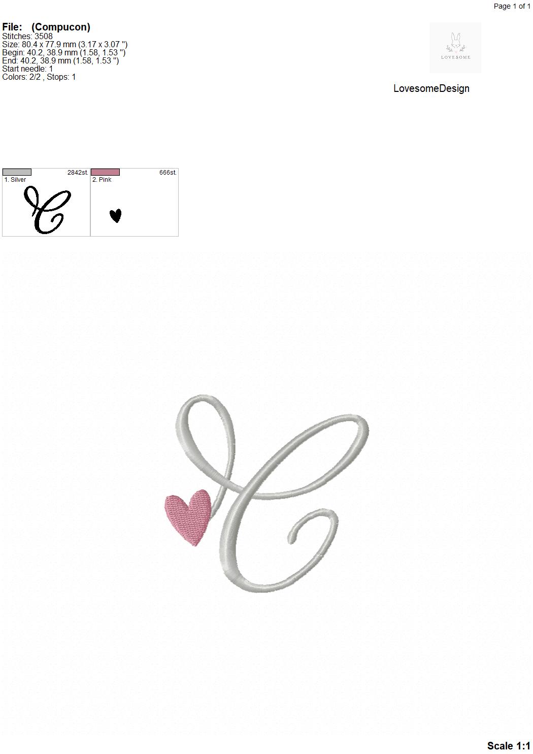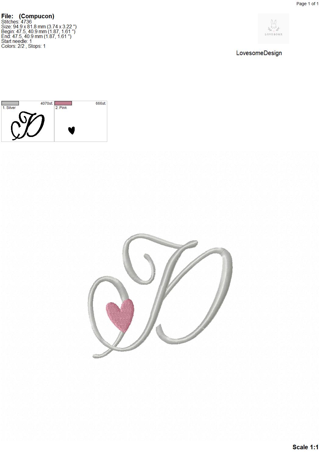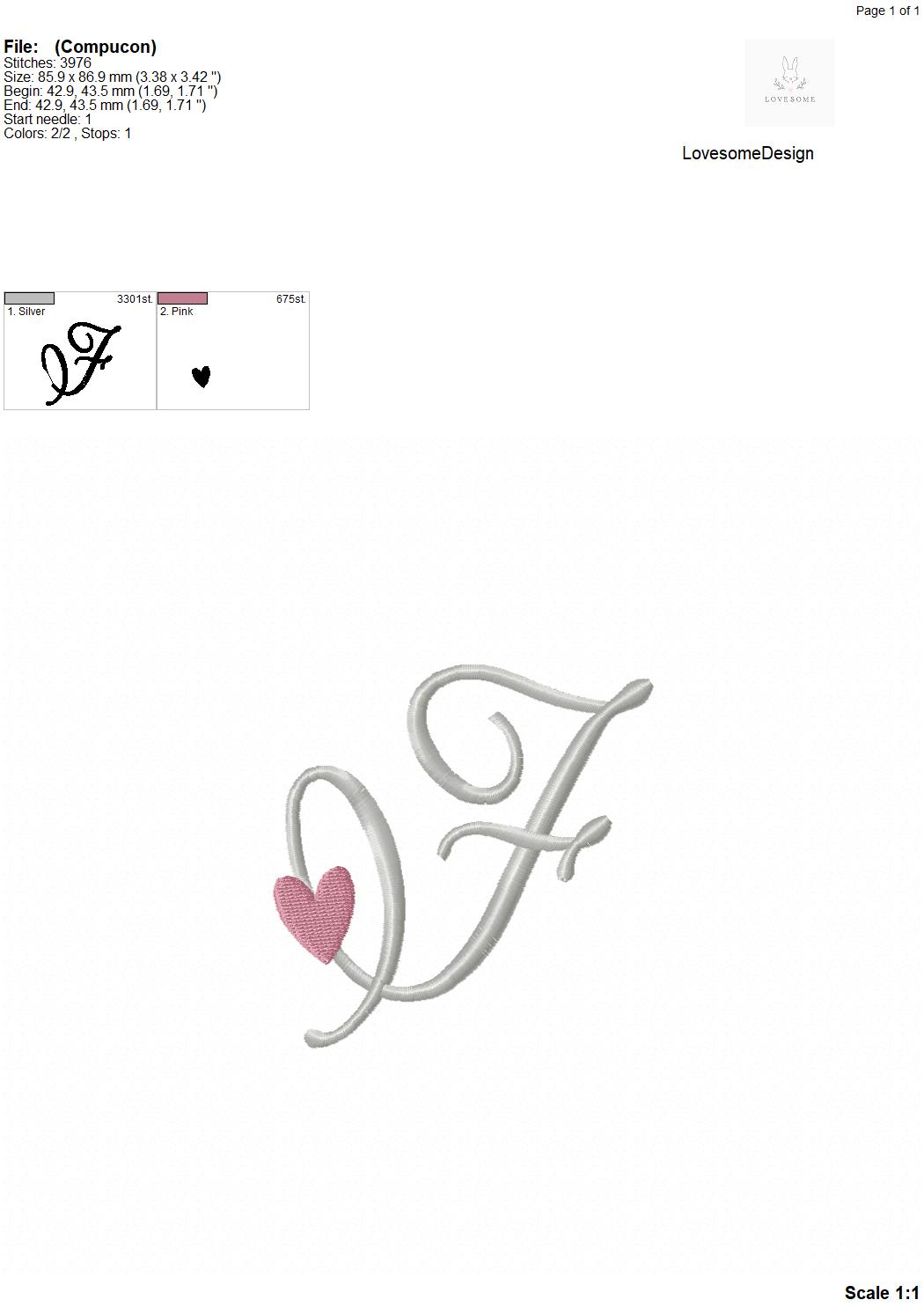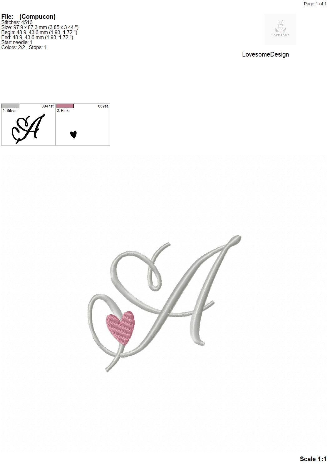 This listing features a machine embroidery font set which includes embroidery files of 26 uppercase cursive calligraphy letters with heart design in 3.5inch size. (For the whole set, pls see the listing images.)