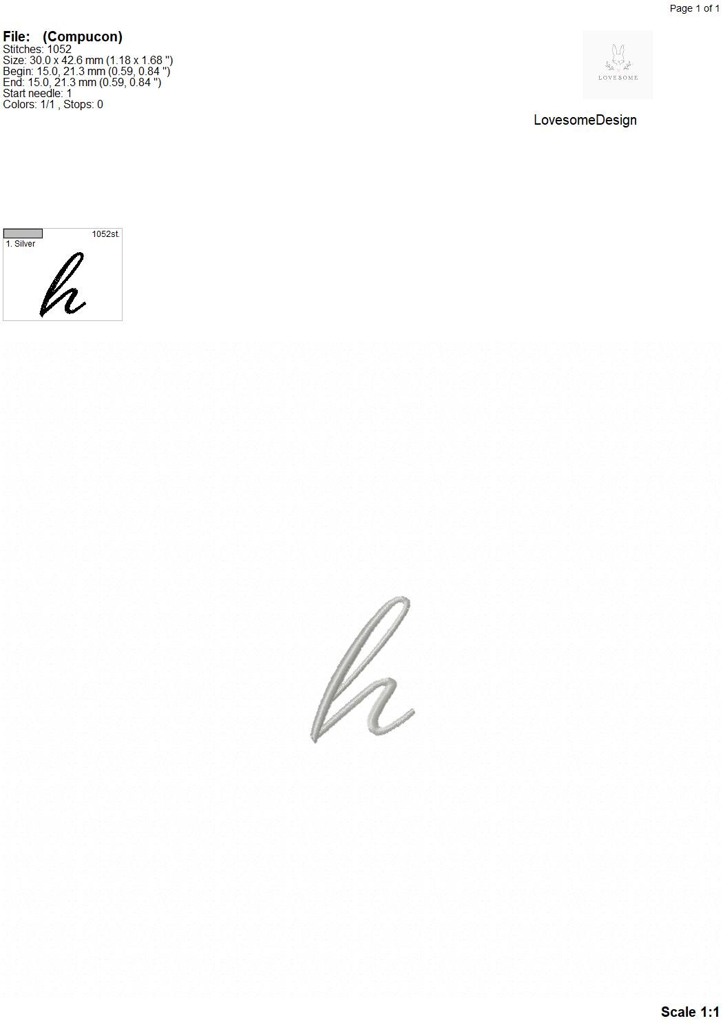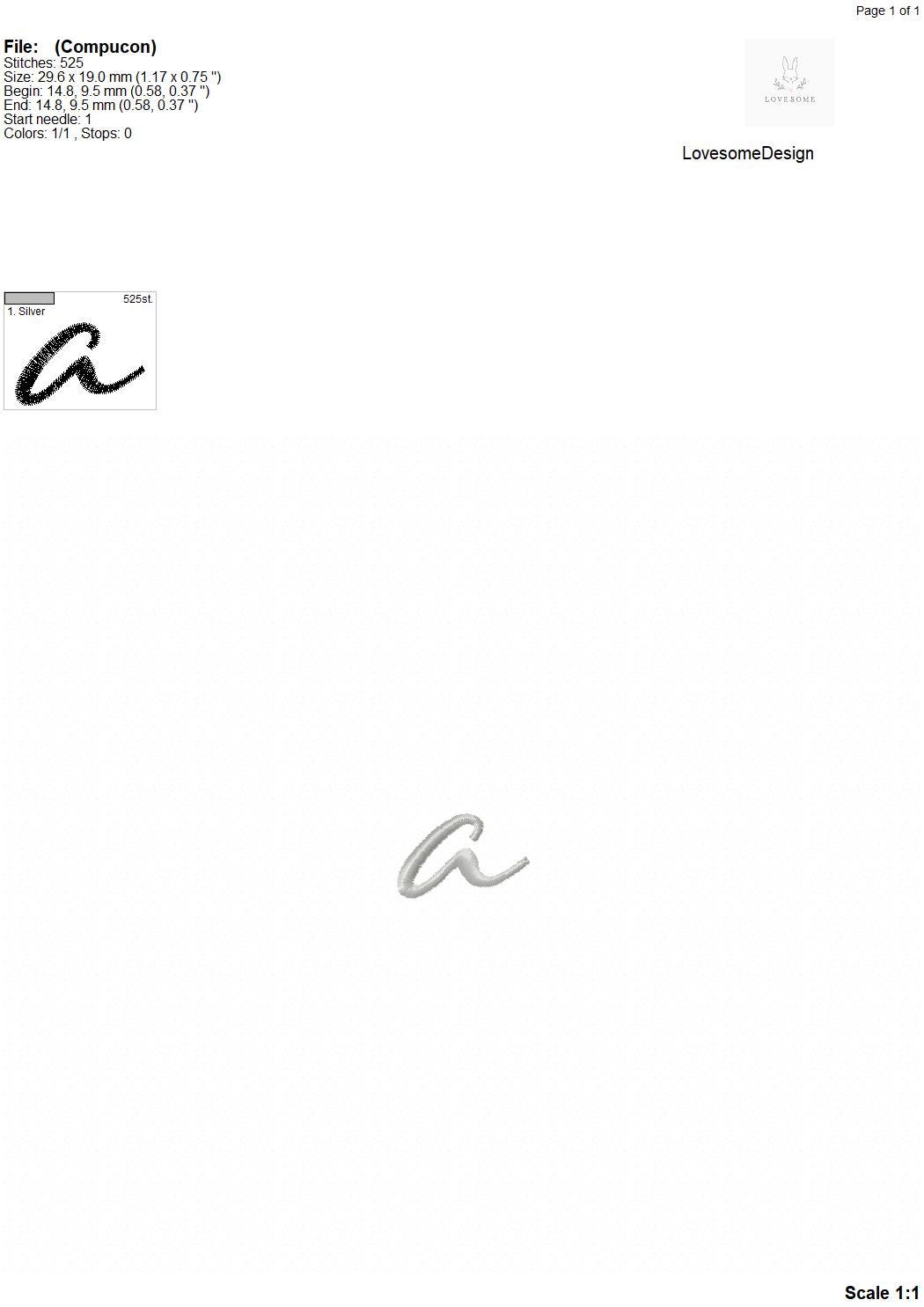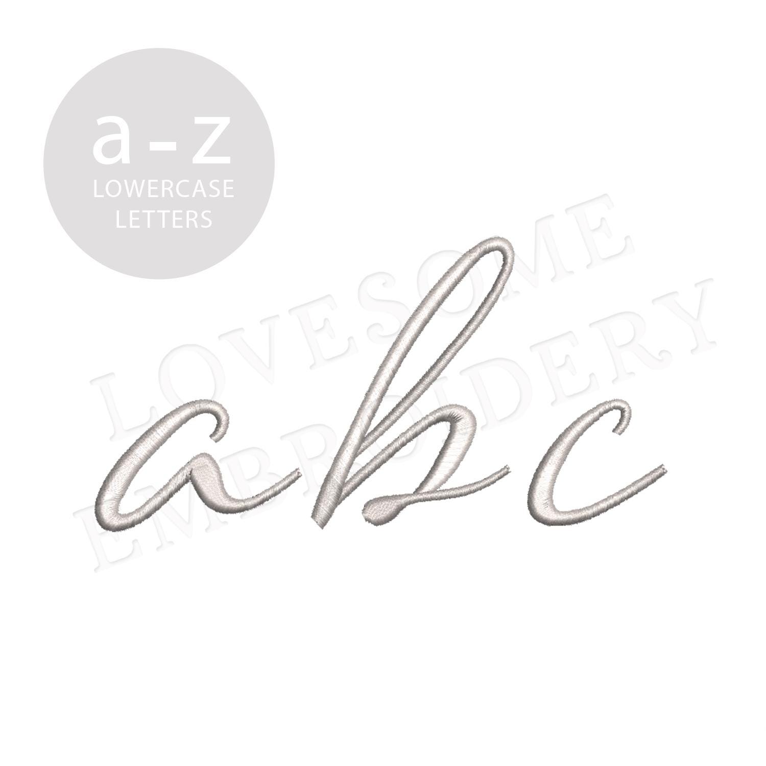This listing features a machine embroidery font set which includes embroidery files of 26 lowercase cursive calligraphy letters and a cute heart design in appr. 2.5inch size. (For the whole set, pls see the listing images.)