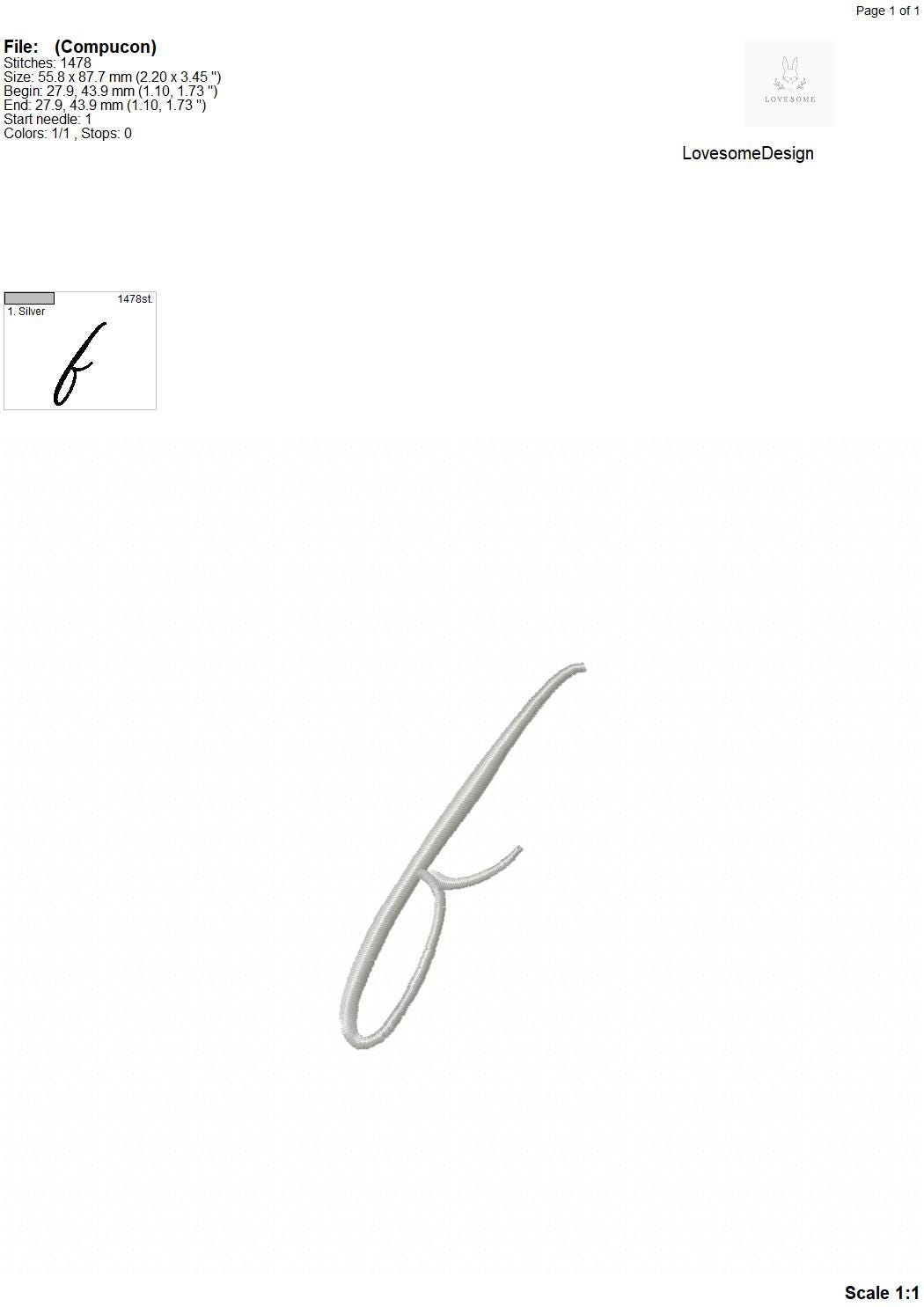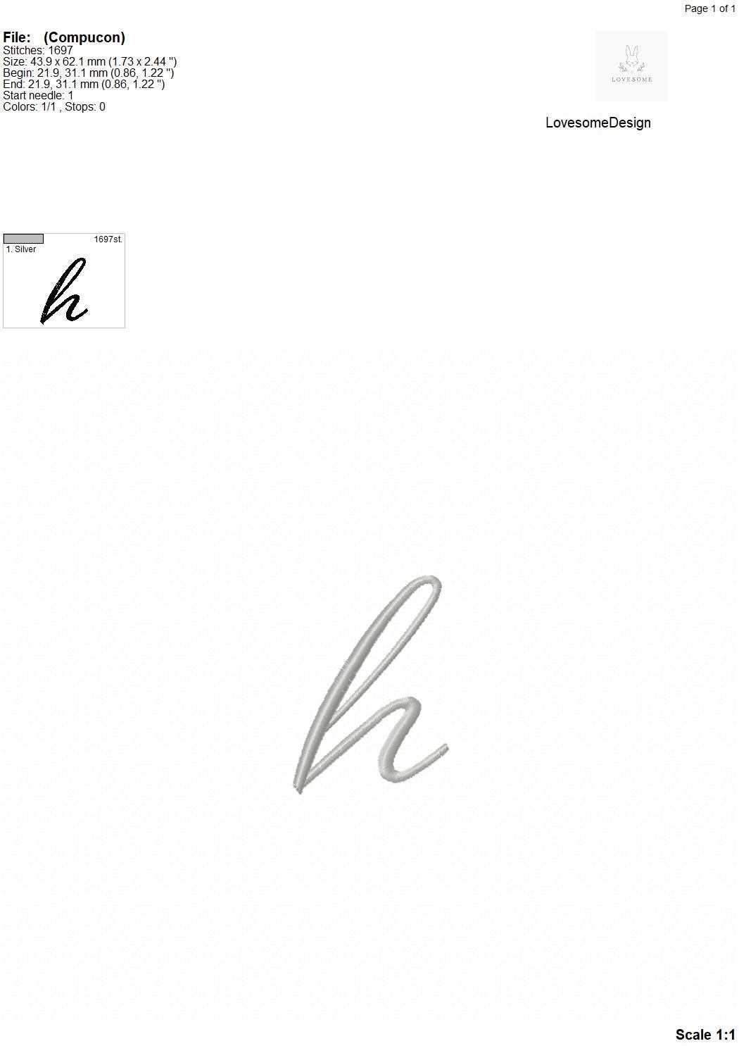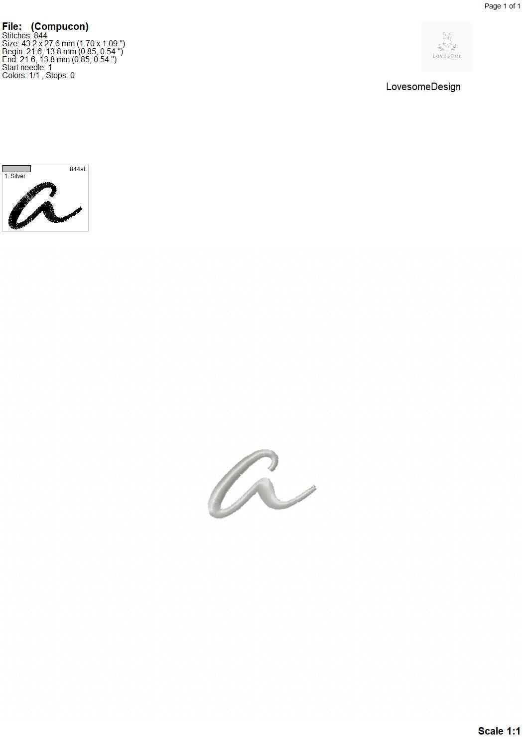This listing features a machine embroidery font set which includes embroidery files of 26 lowercase cursive calligraphy letters and a cute heart design in appr. 3.5inch size. (For the whole set, pls see the listing images.)