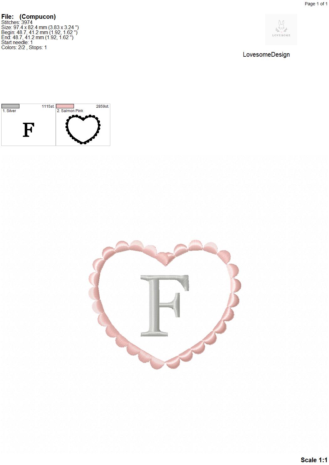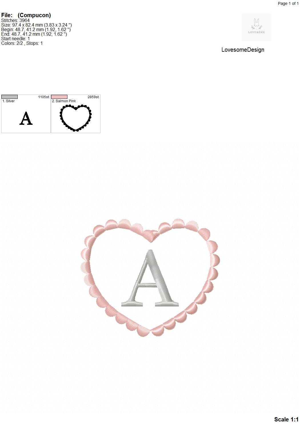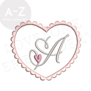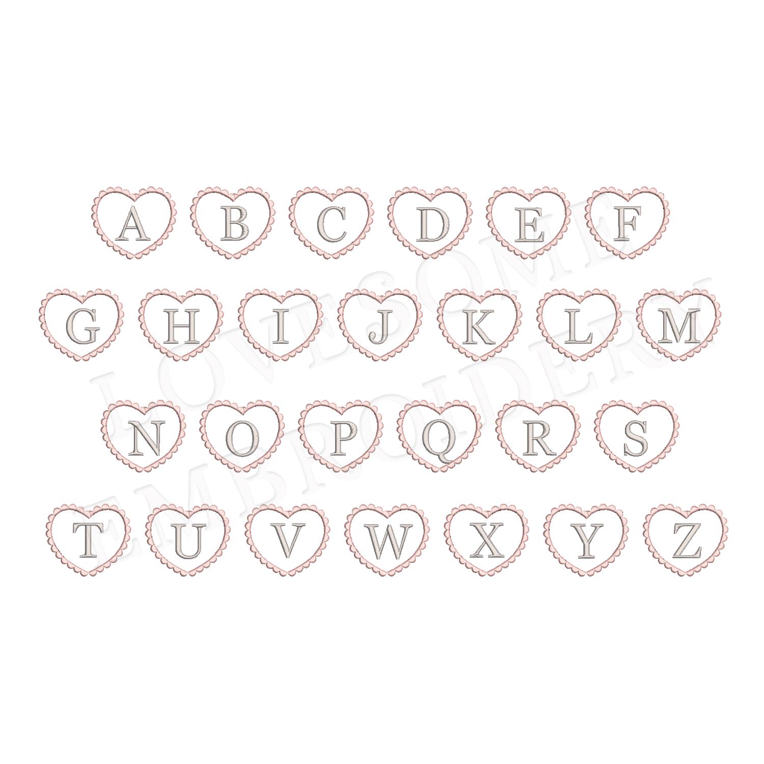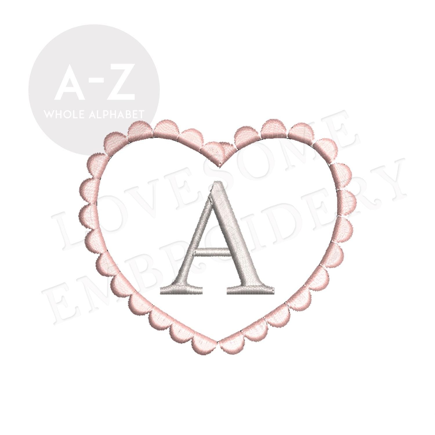 This listing features a machine embroidery font set which includes embroidery files of 26 uppercase serif letters in a beautiful scalloped heart design in 4inch size. (For the whole set, pls see the listing images.)