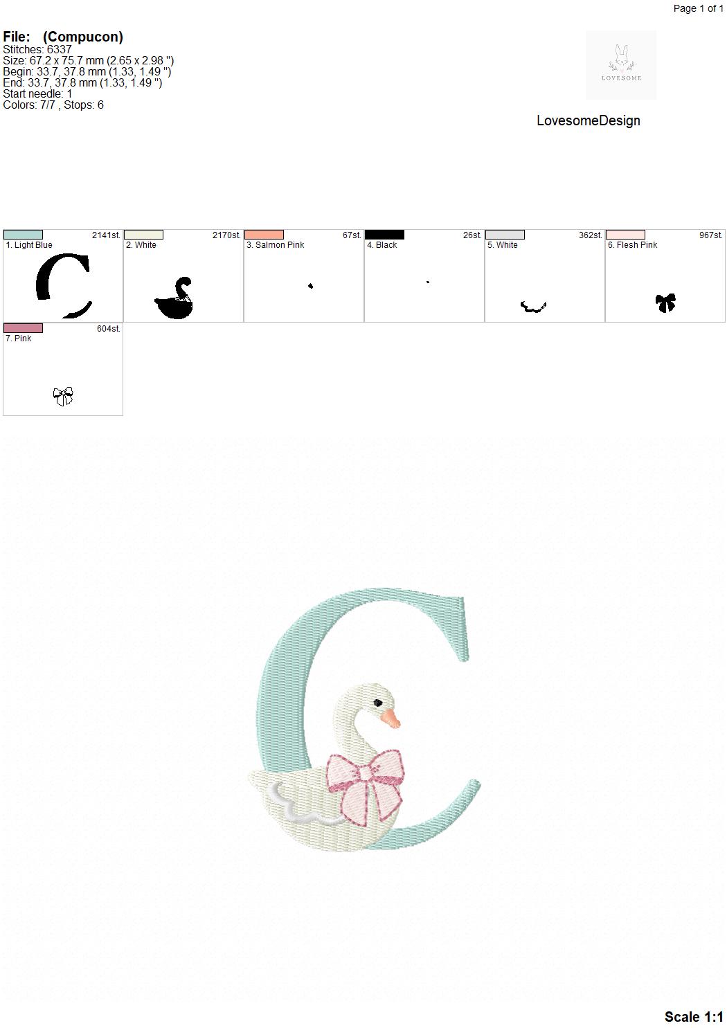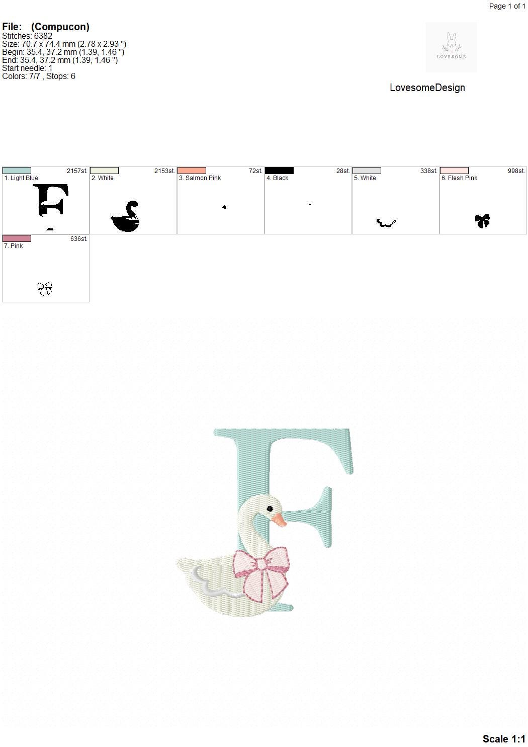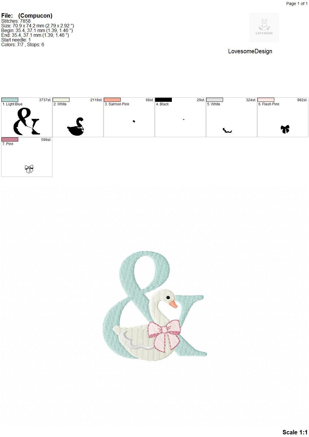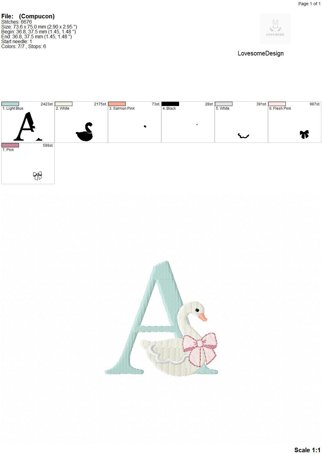 This listing features a machine embroidery font set which includes embroidery files of 26 uppercase monogram letters with swan with a bow design in 3inch size. (For the whole set, pls see the listing images.)