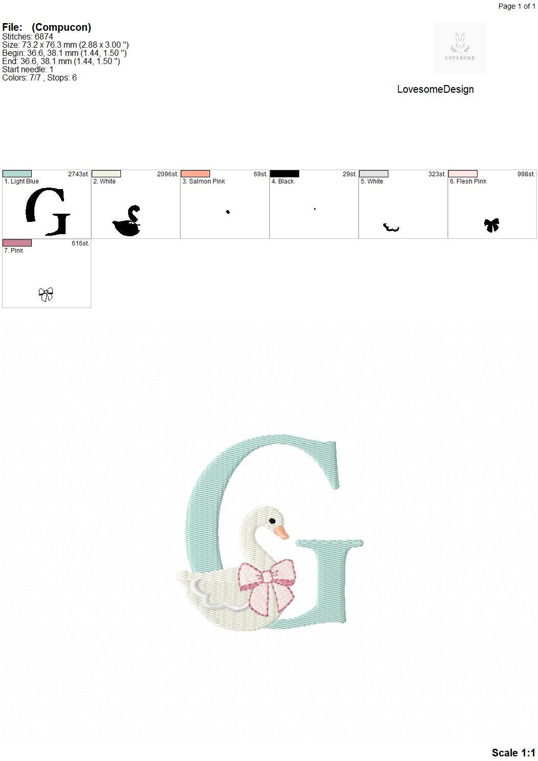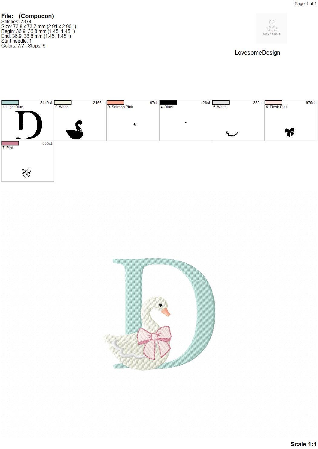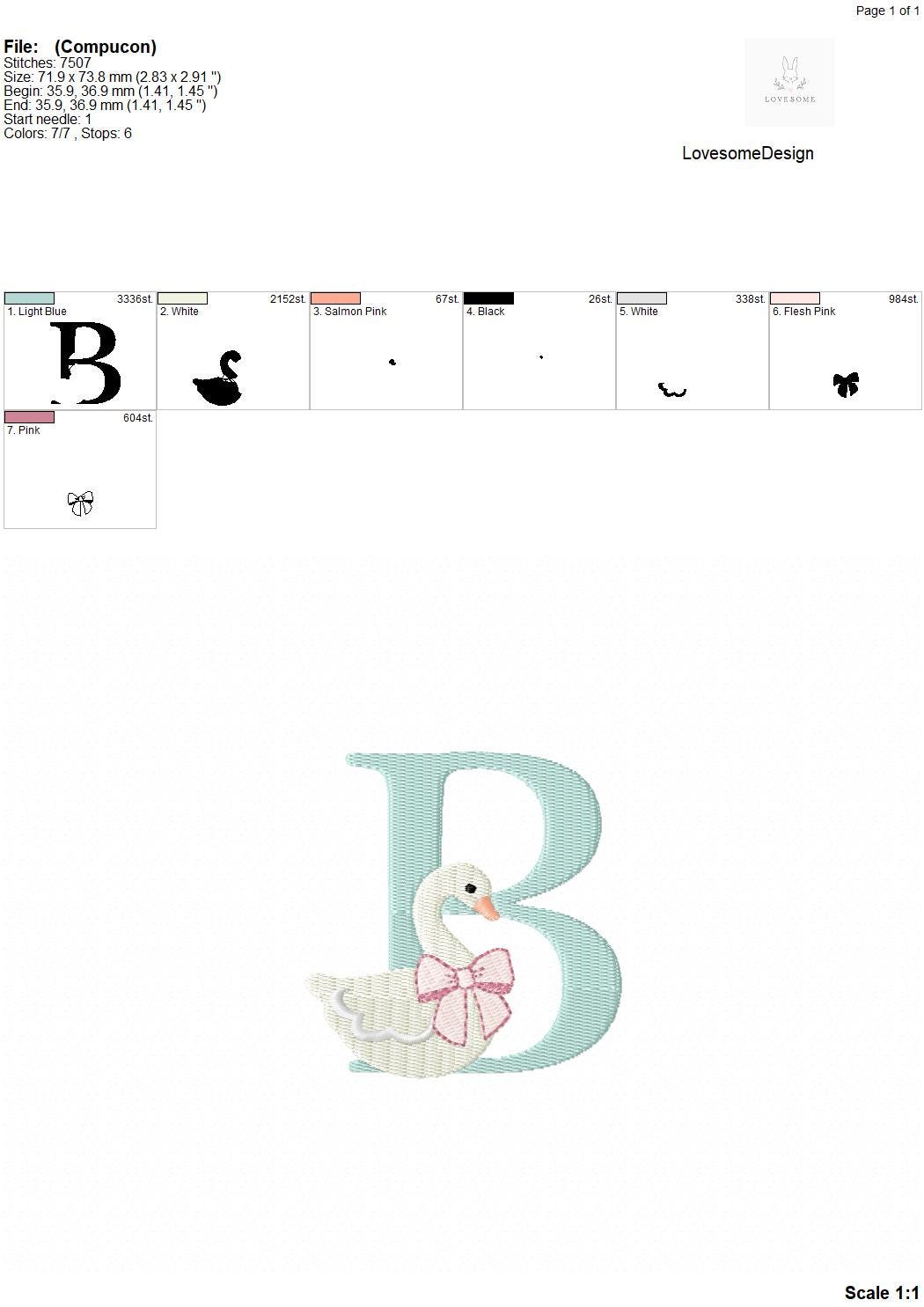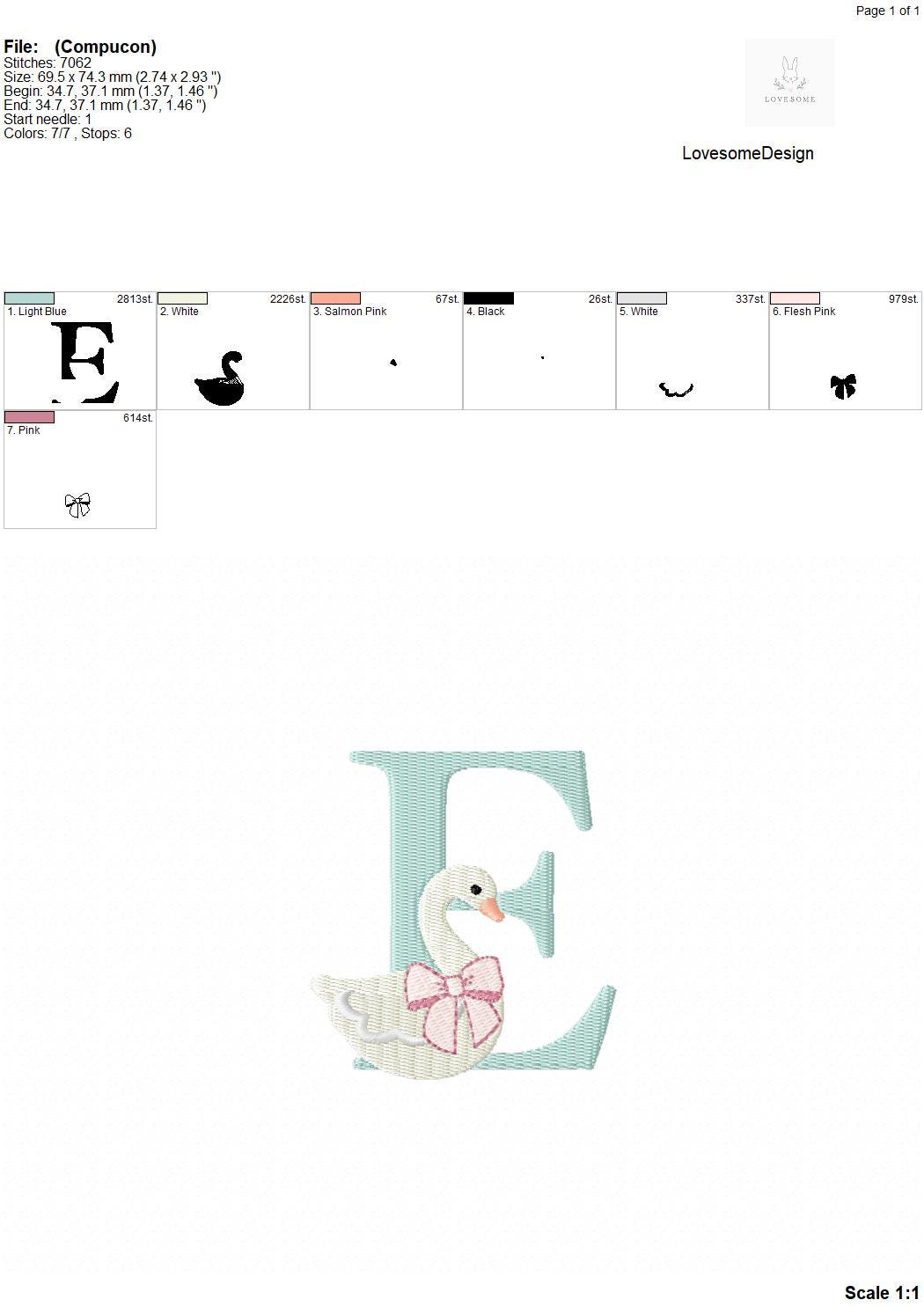 This listing features a machine embroidery font set which includes embroidery files of 26 uppercase monogram letters with swan with a bow design in 3inch size. (For the whole set, pls see the listing images.)