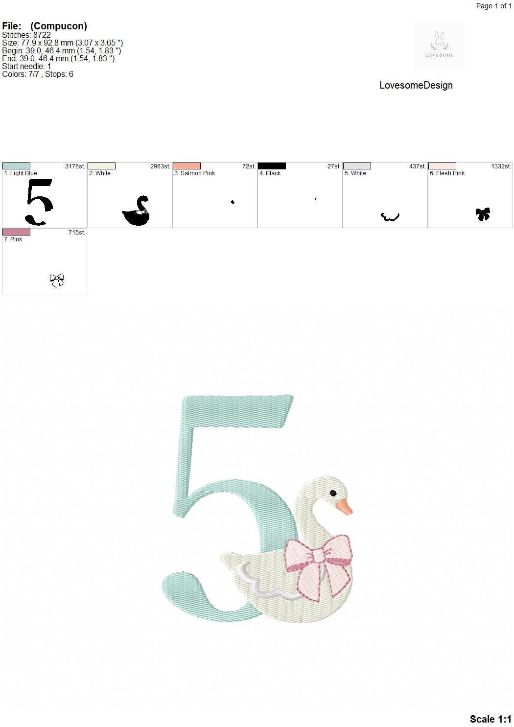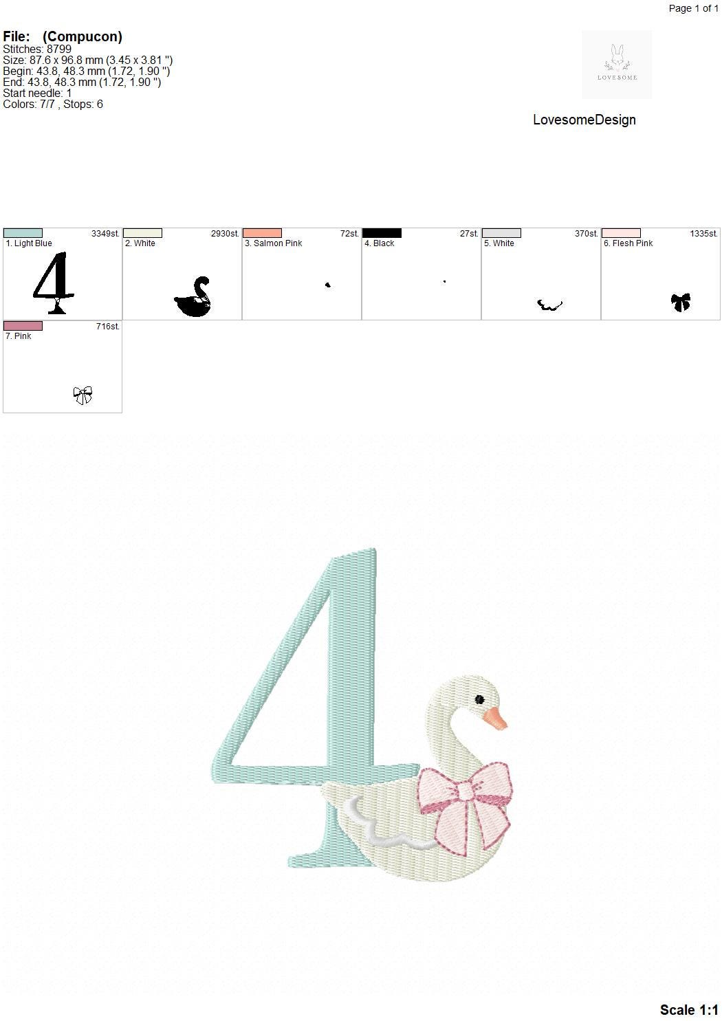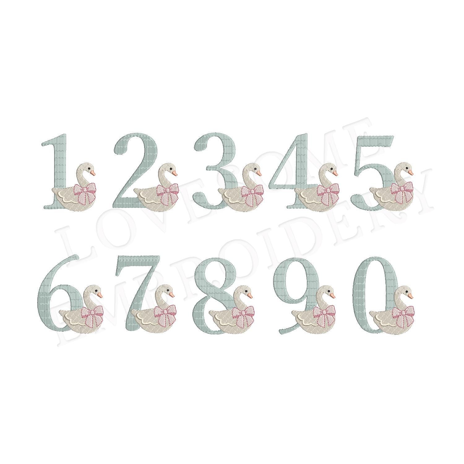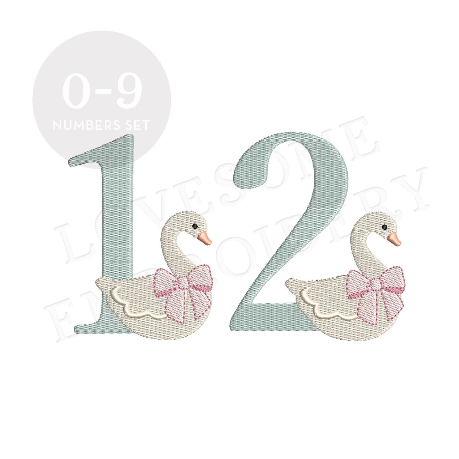 This listing features a machine embroidery numbers set which includes embroidery files of ten numbers (0-9) with swan with a bow design in one size for 4x4 hoops for machine embroidery. (For the whole set, pls see the listing images.)