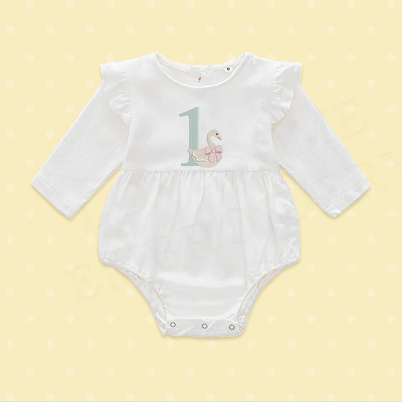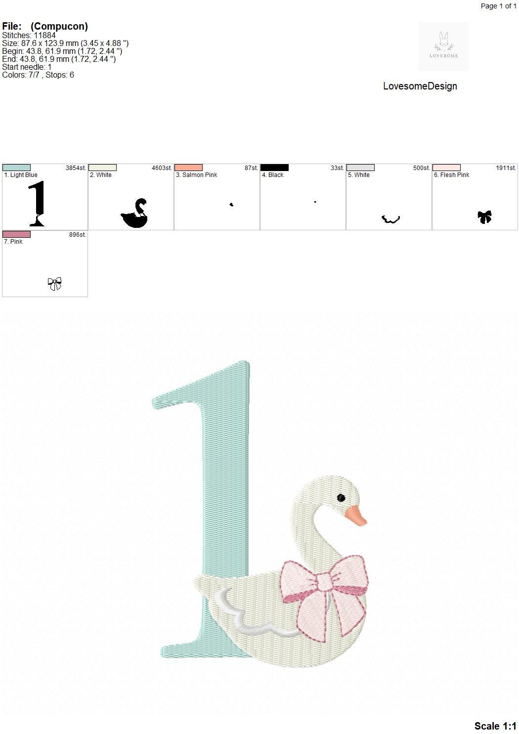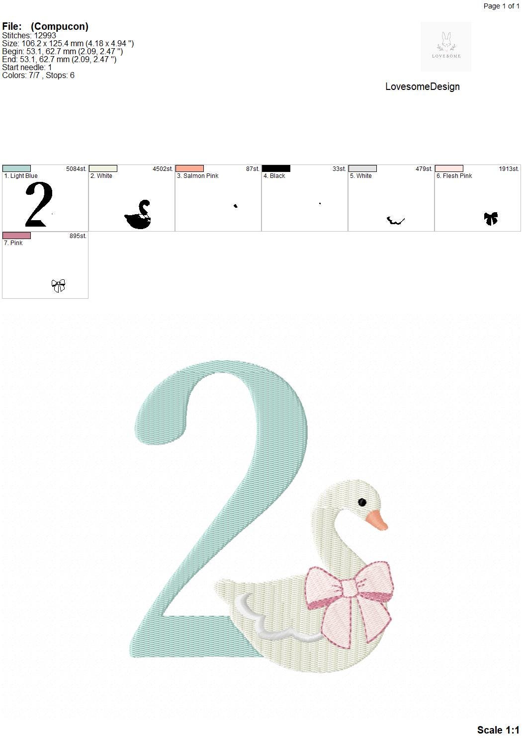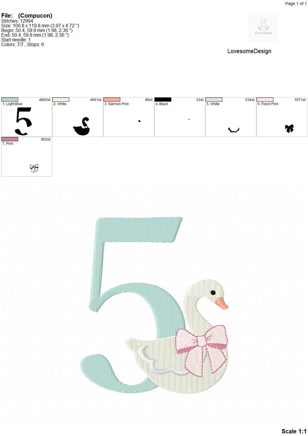 This listing features a machine embroidery numbers set which includes embroidery files of ten numbers (0-9) with swan with a bow design in 5inch size for machine embroidery. (For the whole set, pls see the listing images.)