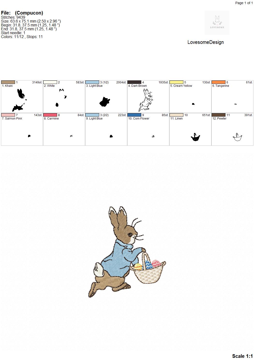 This listing features a machine embroidery file of Peter Rabbit carrying a basket of easter eggs design in 3 inch size.