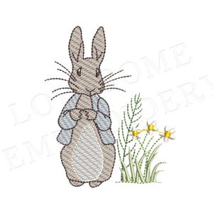 This listing features a machine embroidery file of a cute rabbit wearing a bow design in two sizes, one in 3inch and one in 3.5inch.