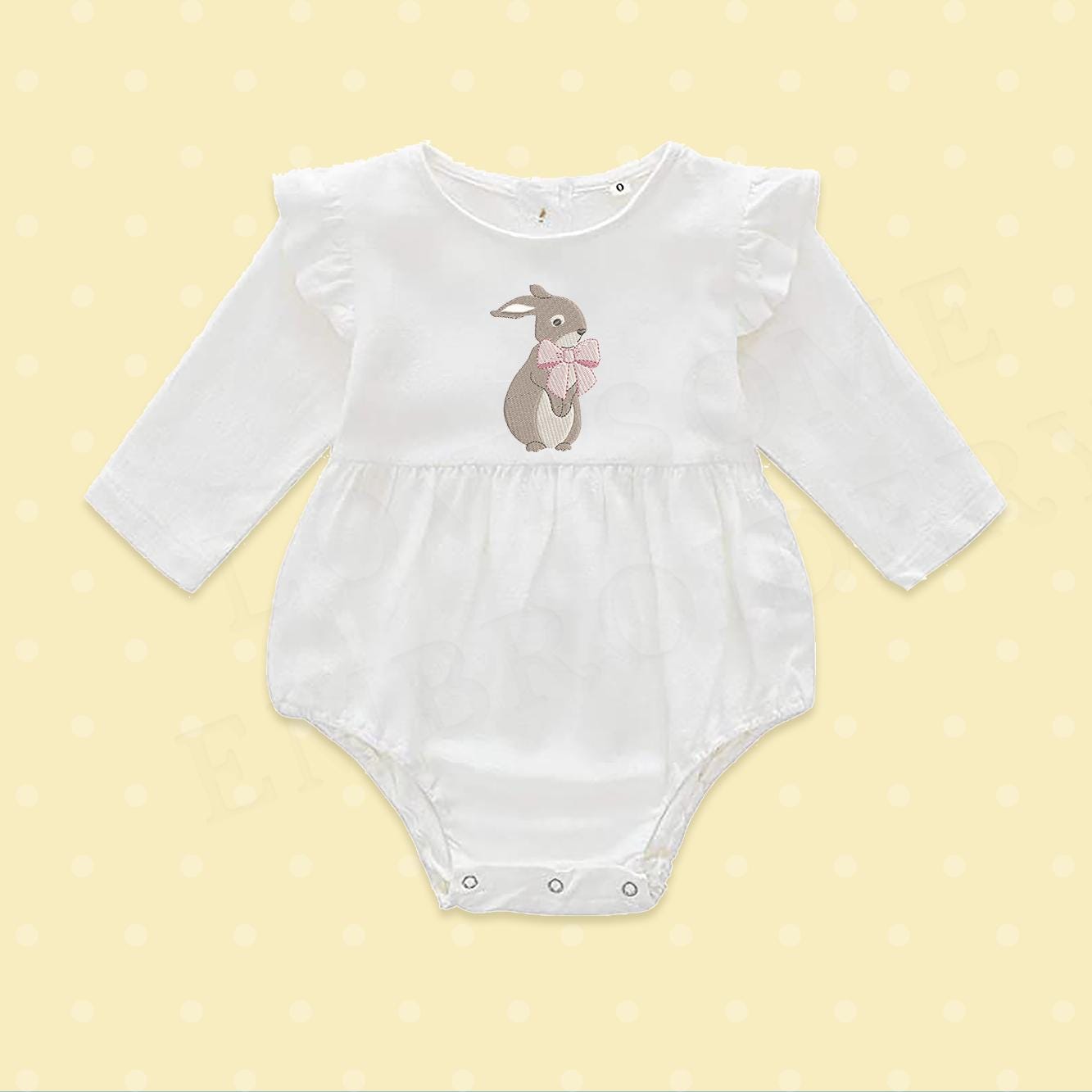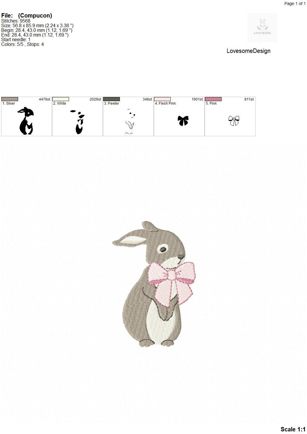 This listing features a machine embroidery file of a cute rabbit wearing a bow design in two sizes, one in 3inch and one in 3.5inch.