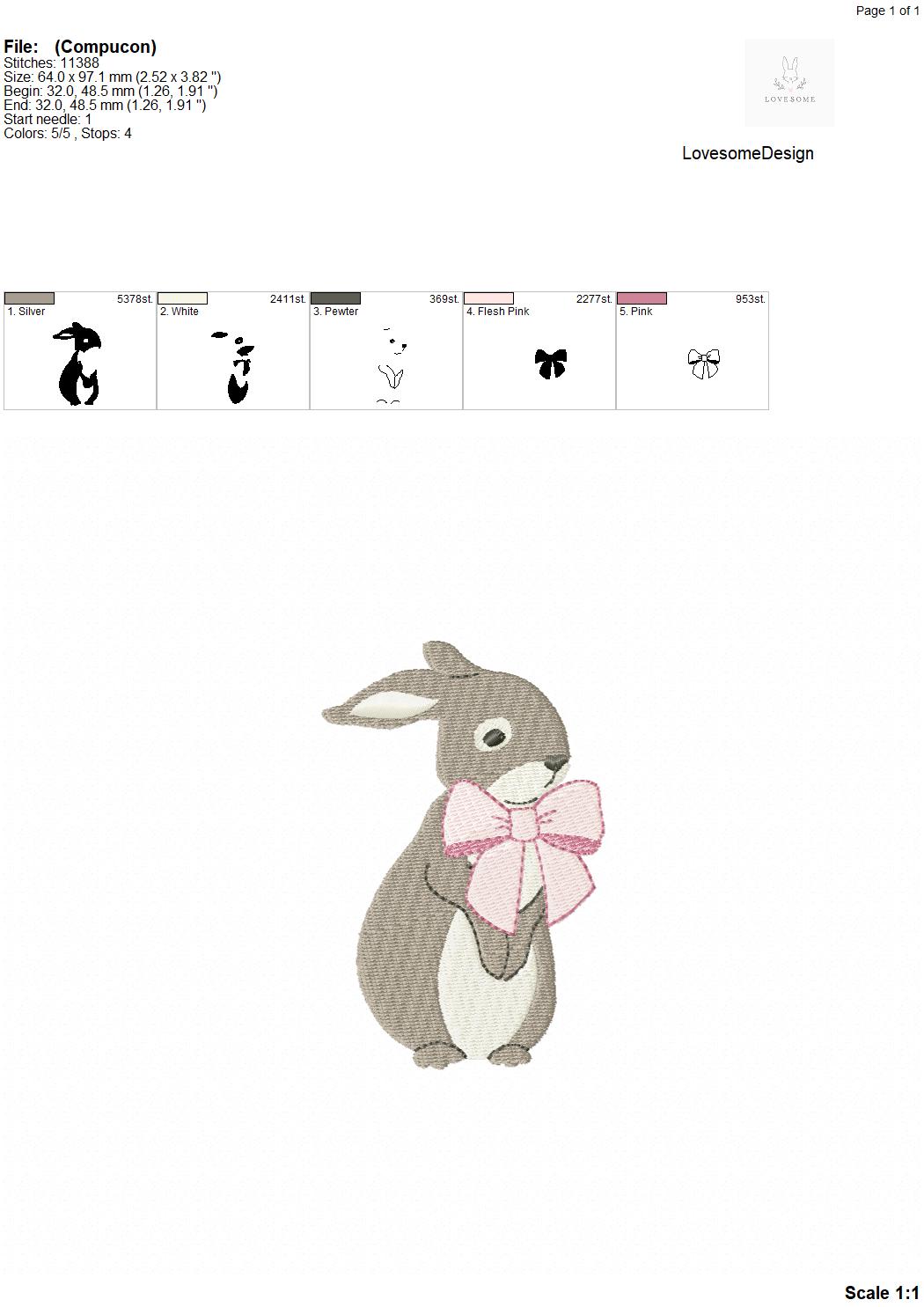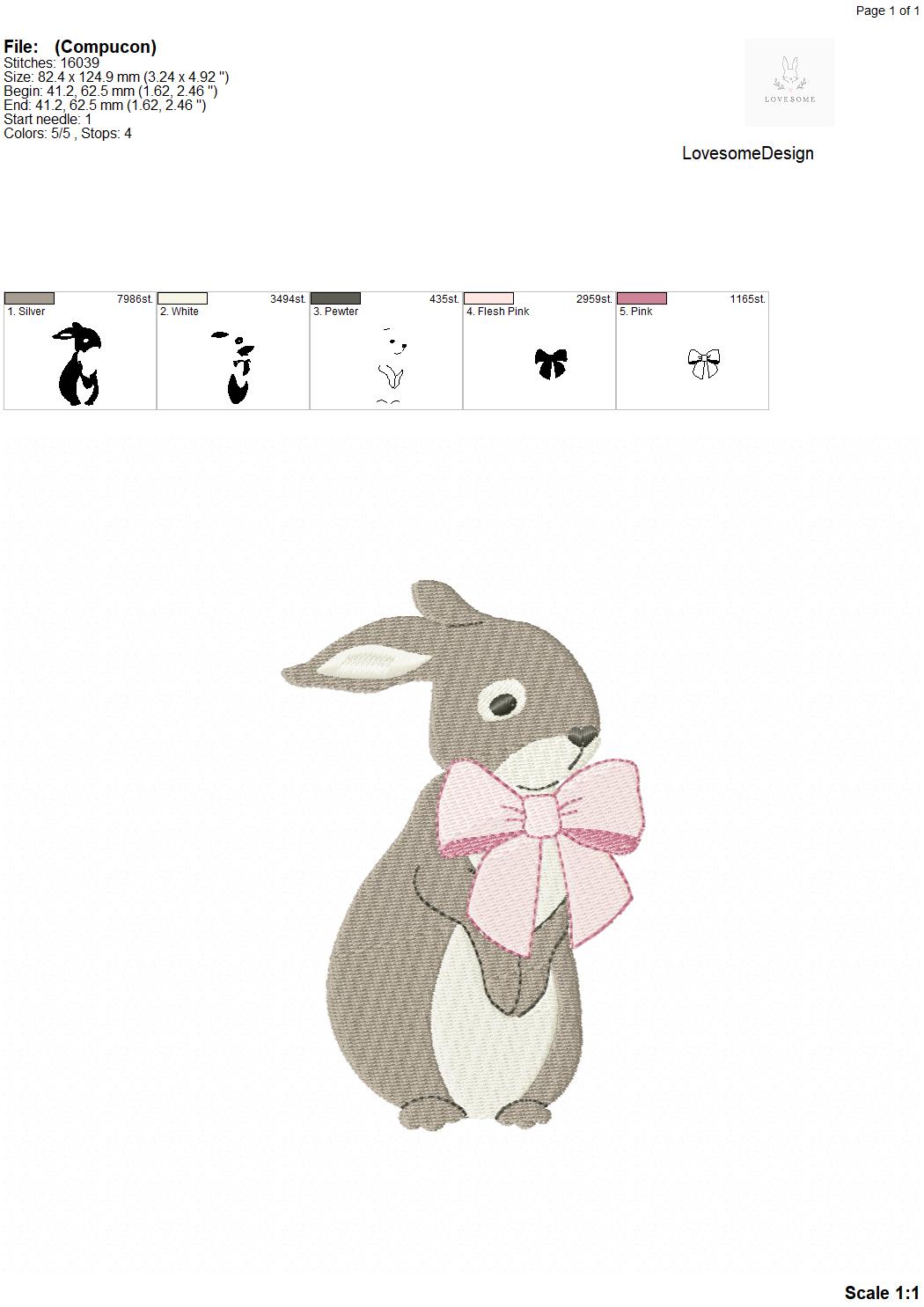 This listing features a machine embroidery file of a cute rabbit wearing a bow design in two sizes, one in 4inch and one in 5inch.