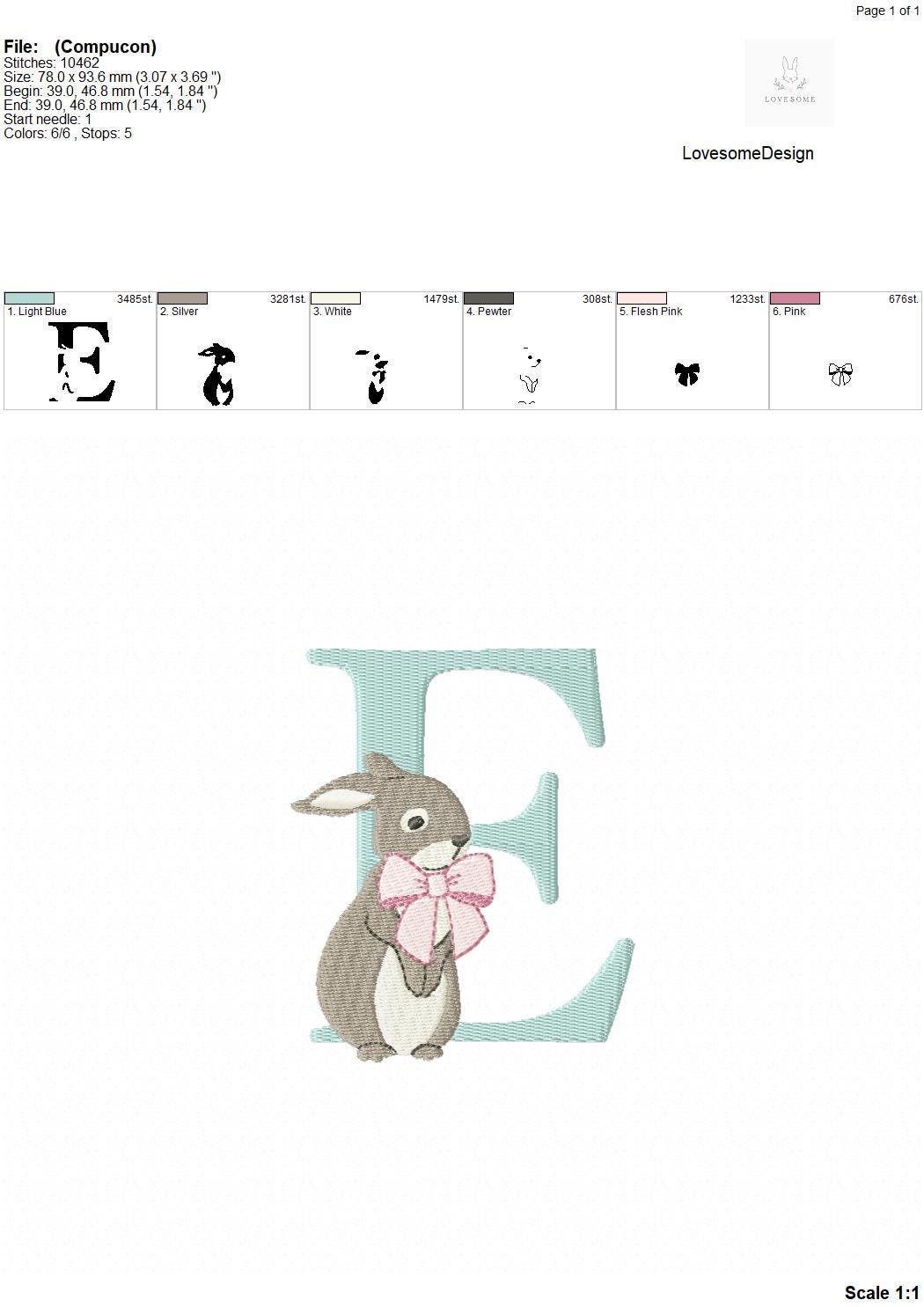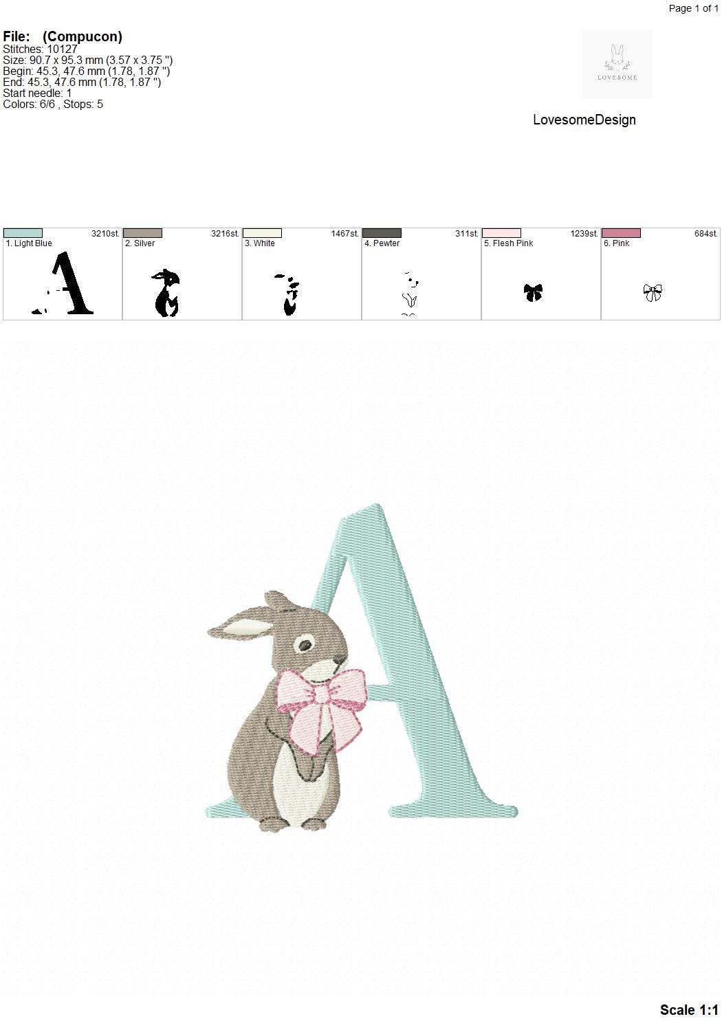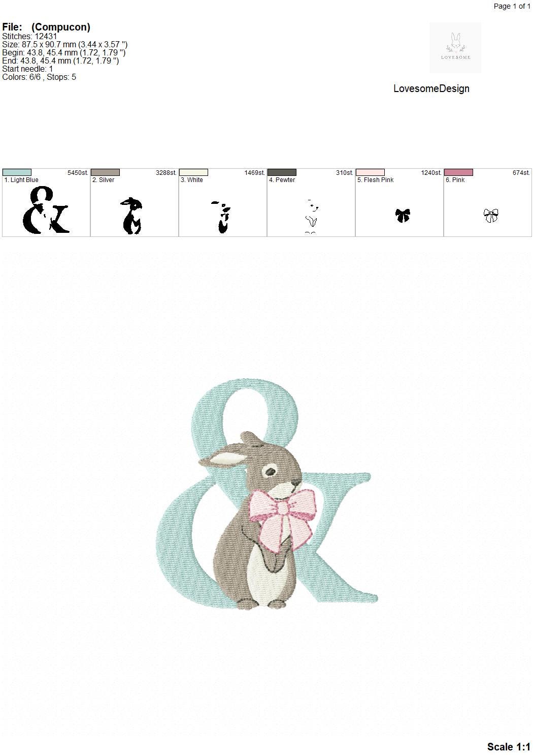 This listing features a machine embroidery font set which includes embroidery files of 26 uppercase monogram letters and an ampersand with cute rabbit design wearing a beautiful bow in 4inch size. (For the whole set, pls see the listing images.)