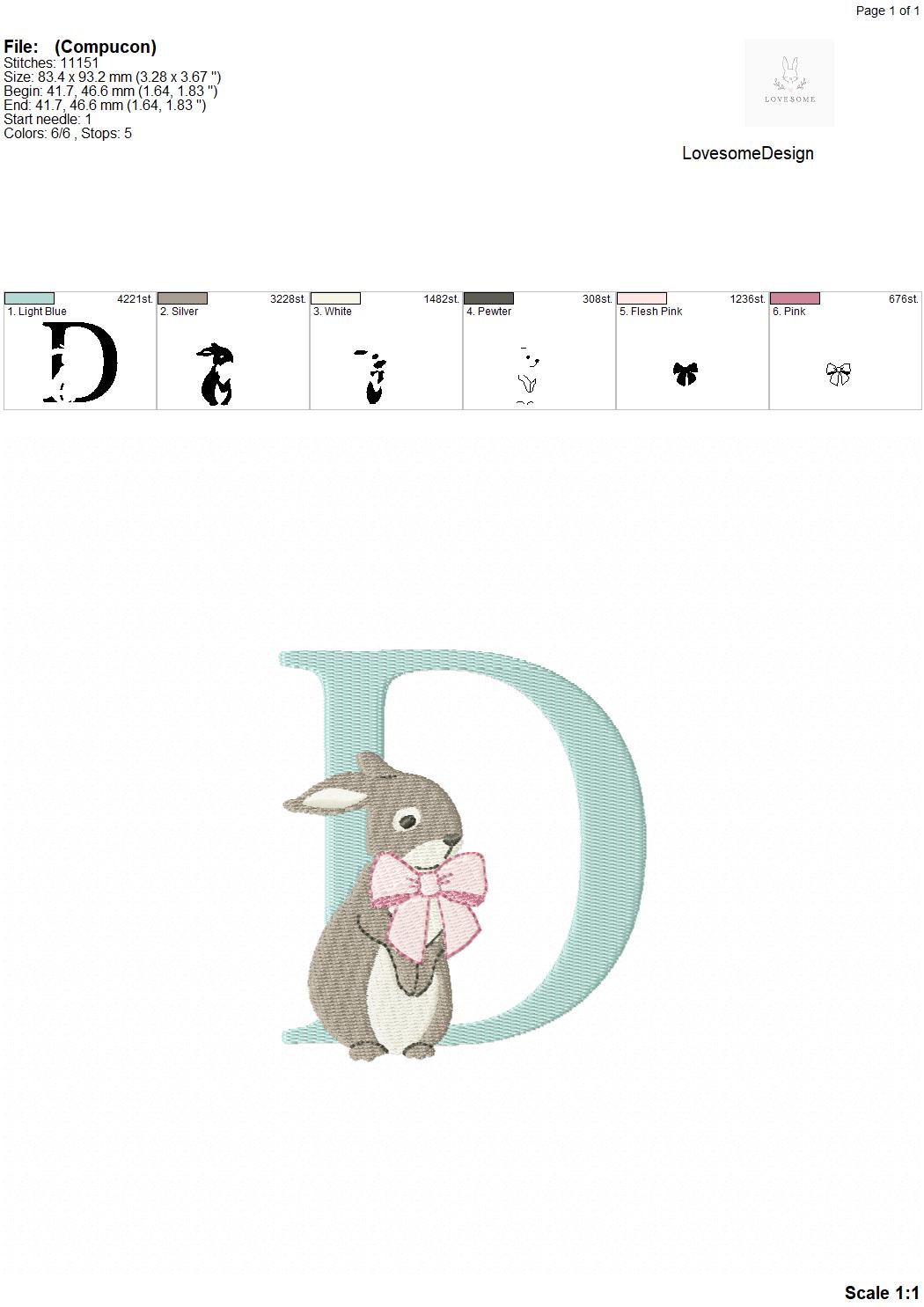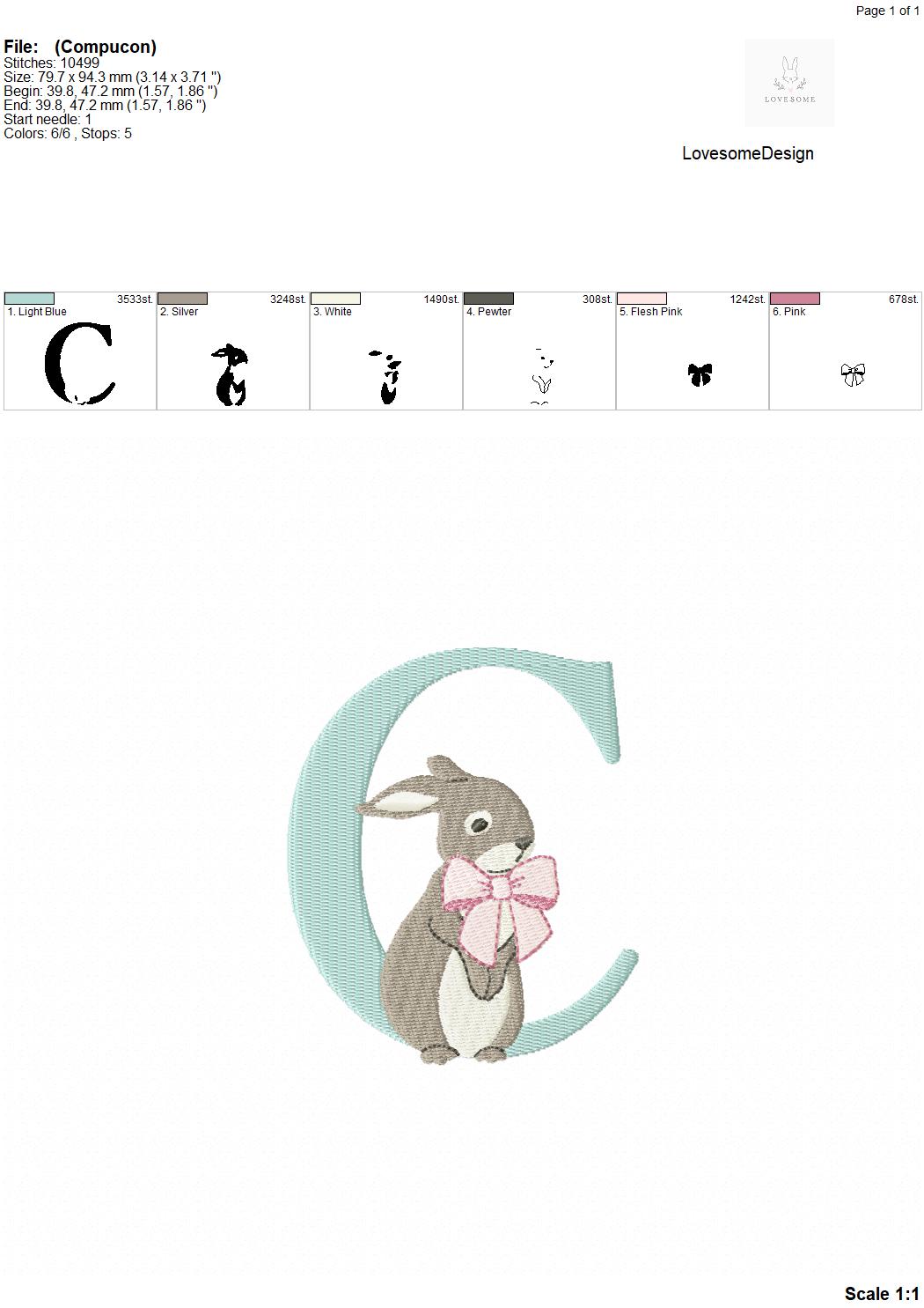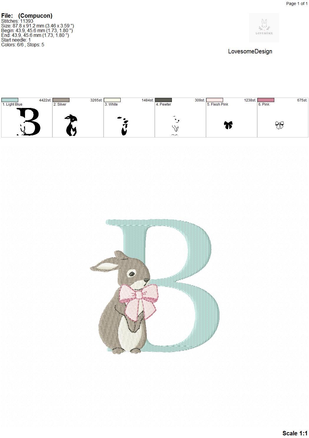This listing features a machine embroidery font set which includes embroidery files of 26 uppercase monogram letters and an ampersand with cute rabbit design wearing a beautiful bow in 4inch size. (For the whole set, pls see the listing images.)
