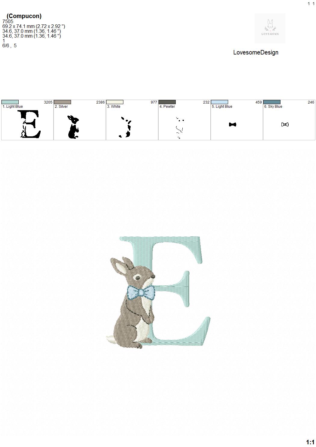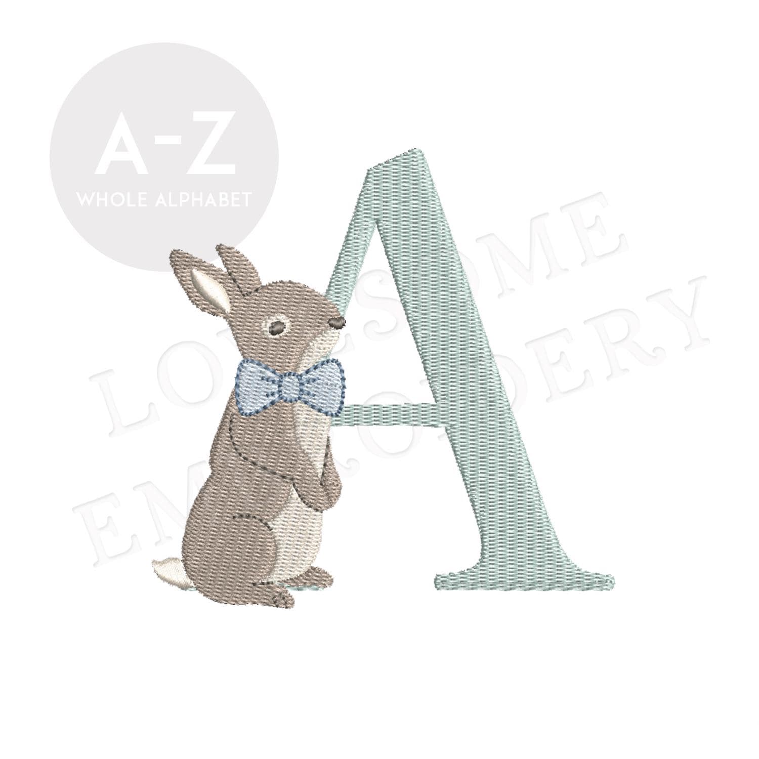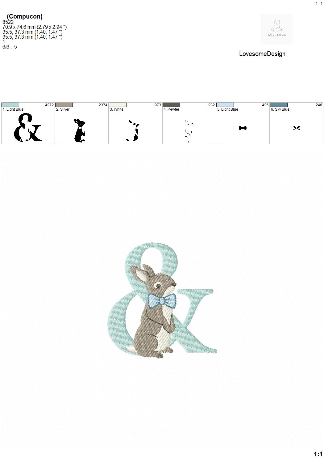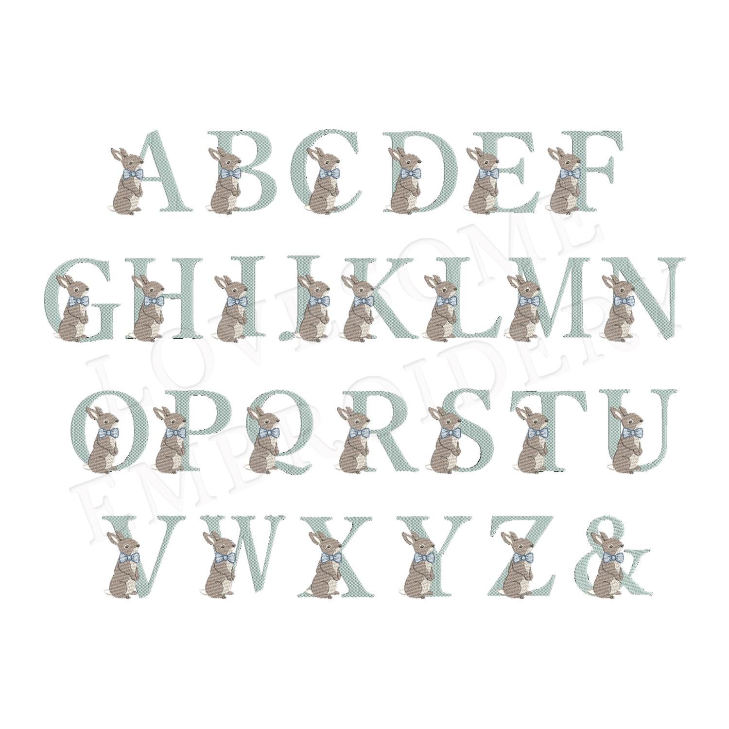 This listing features a machine embroidery font set which includes embroidery files of 26 uppercase monogram letters and an ampersand with cute rabbit design wearing a bow tie in 3inch size. (For the whole set, pls see the listing images.)
