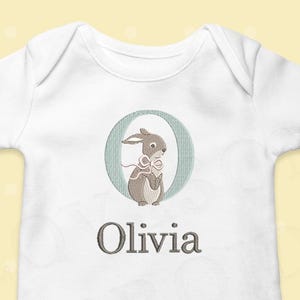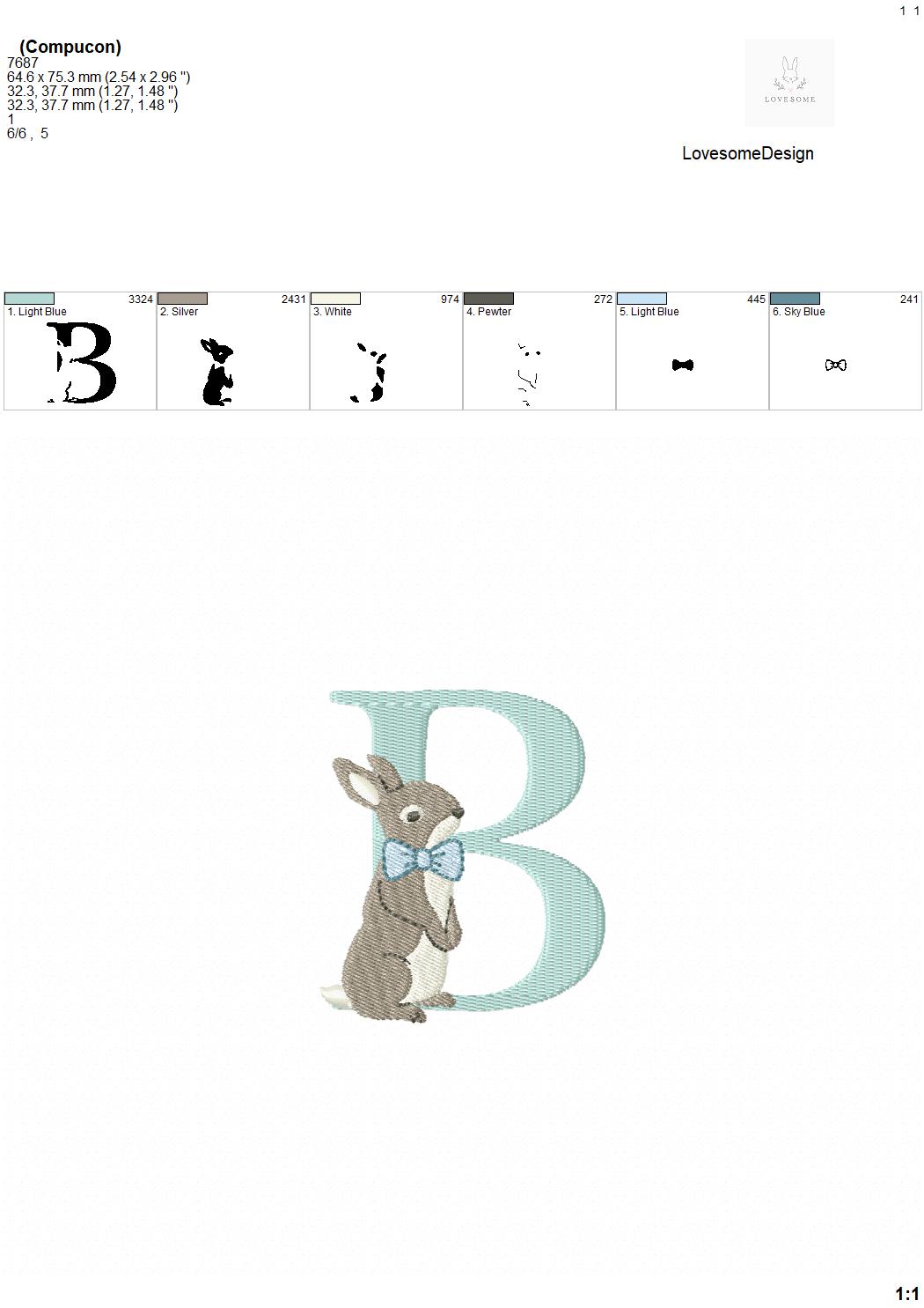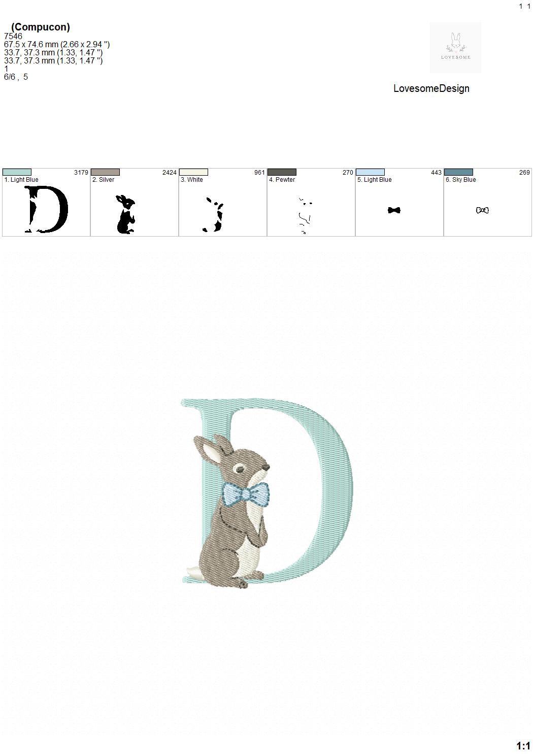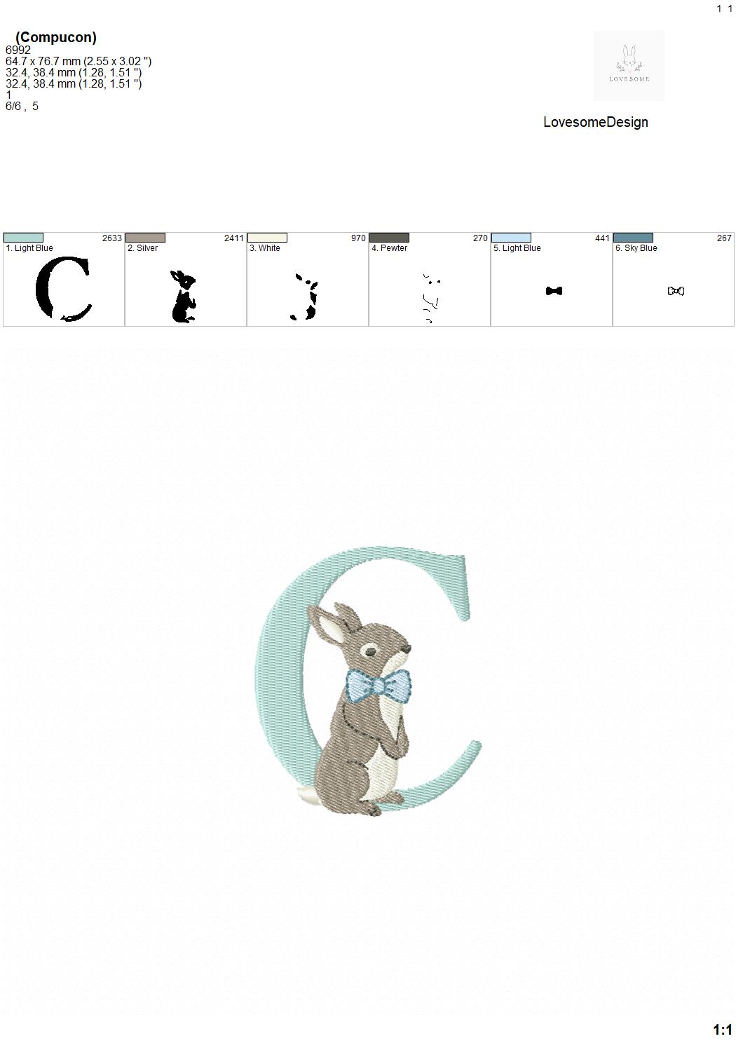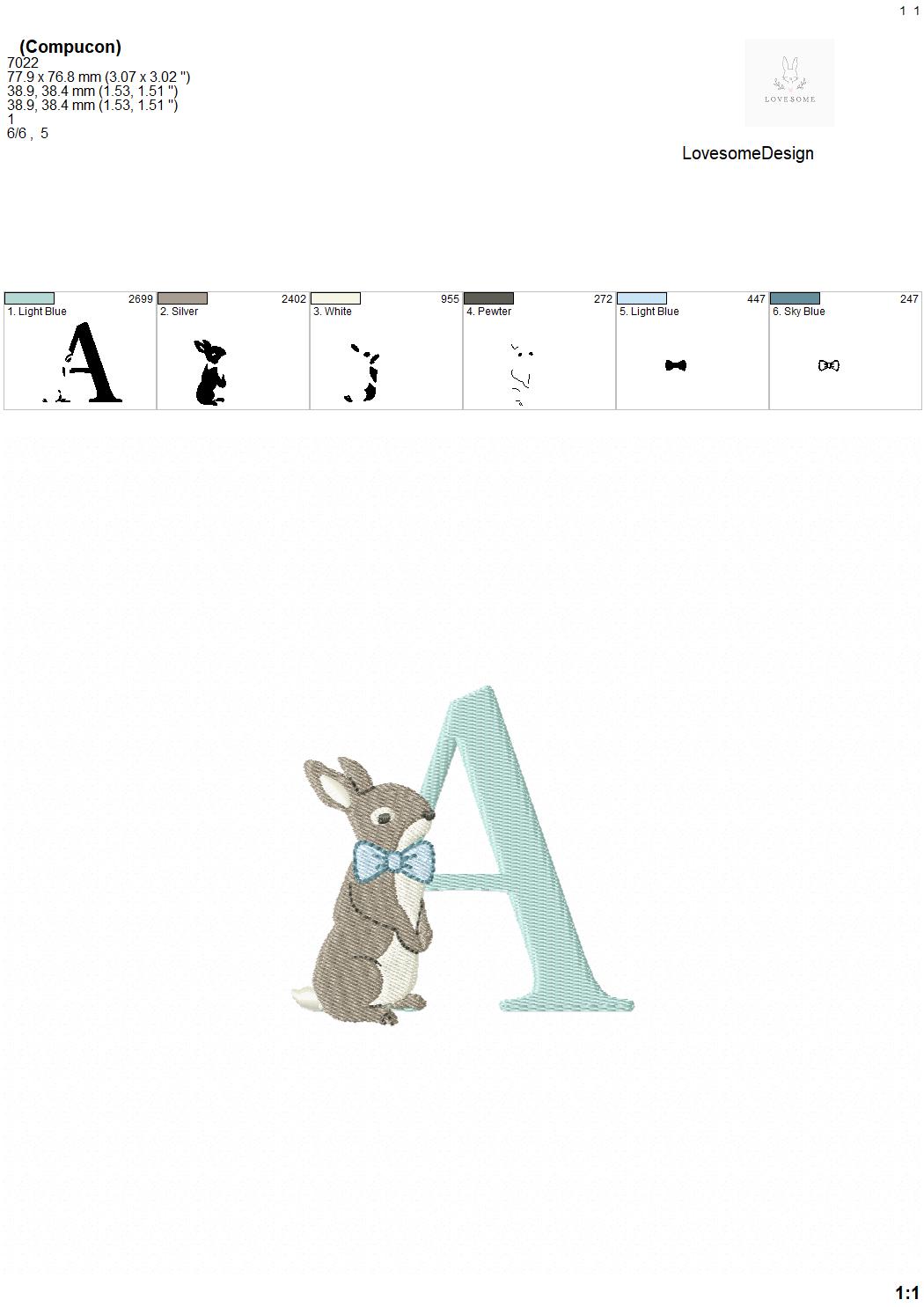 This listing features a machine embroidery font set which includes embroidery files of 26 uppercase monogram letters and an ampersand with cute rabbit design wearing a bow tie in 3inch size. (For the whole set, pls see the listing images.)