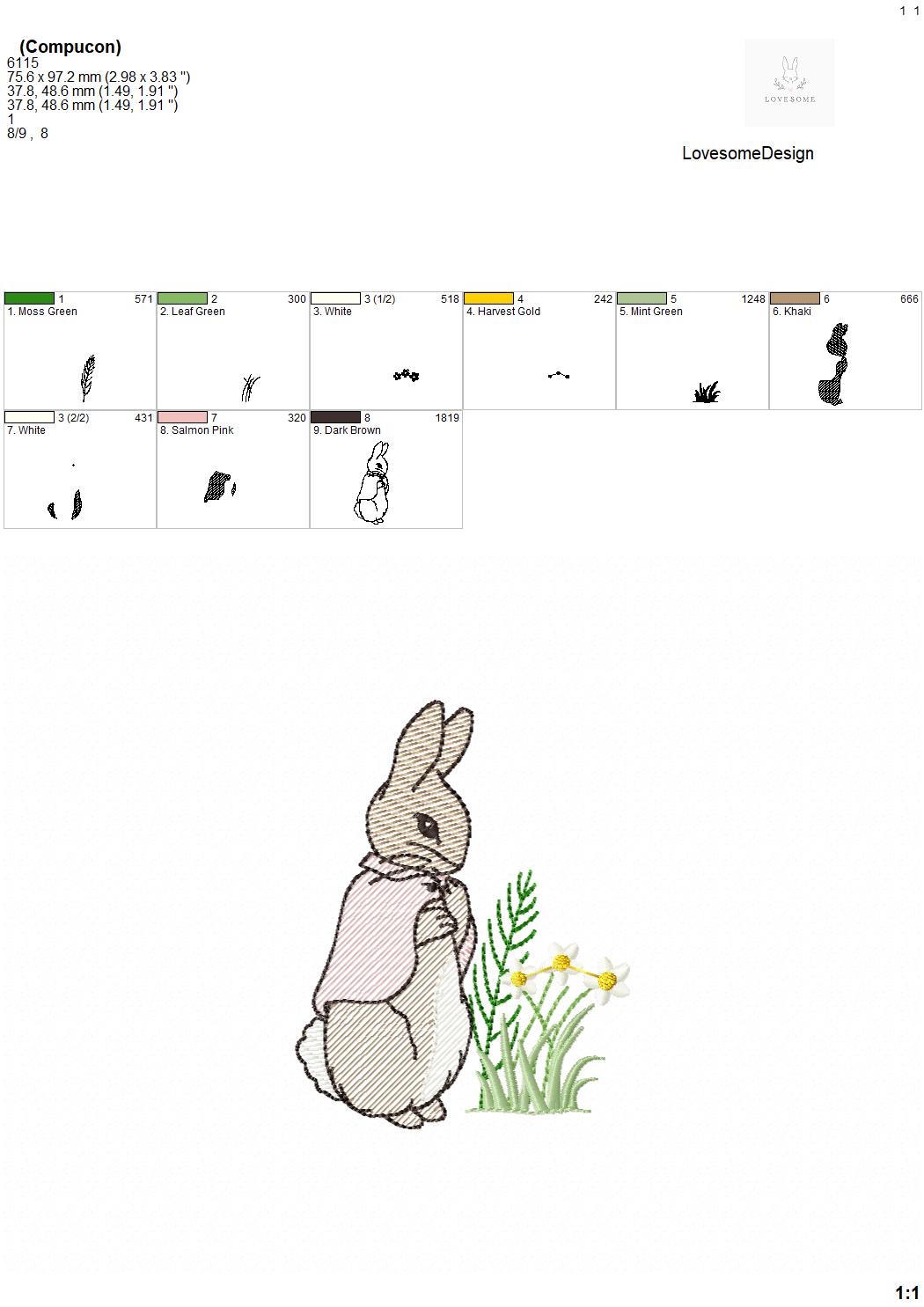 This listing features a machine embroidery file of quick stitch Cottontail Rabbit with meadow florals design in 4 inch size.