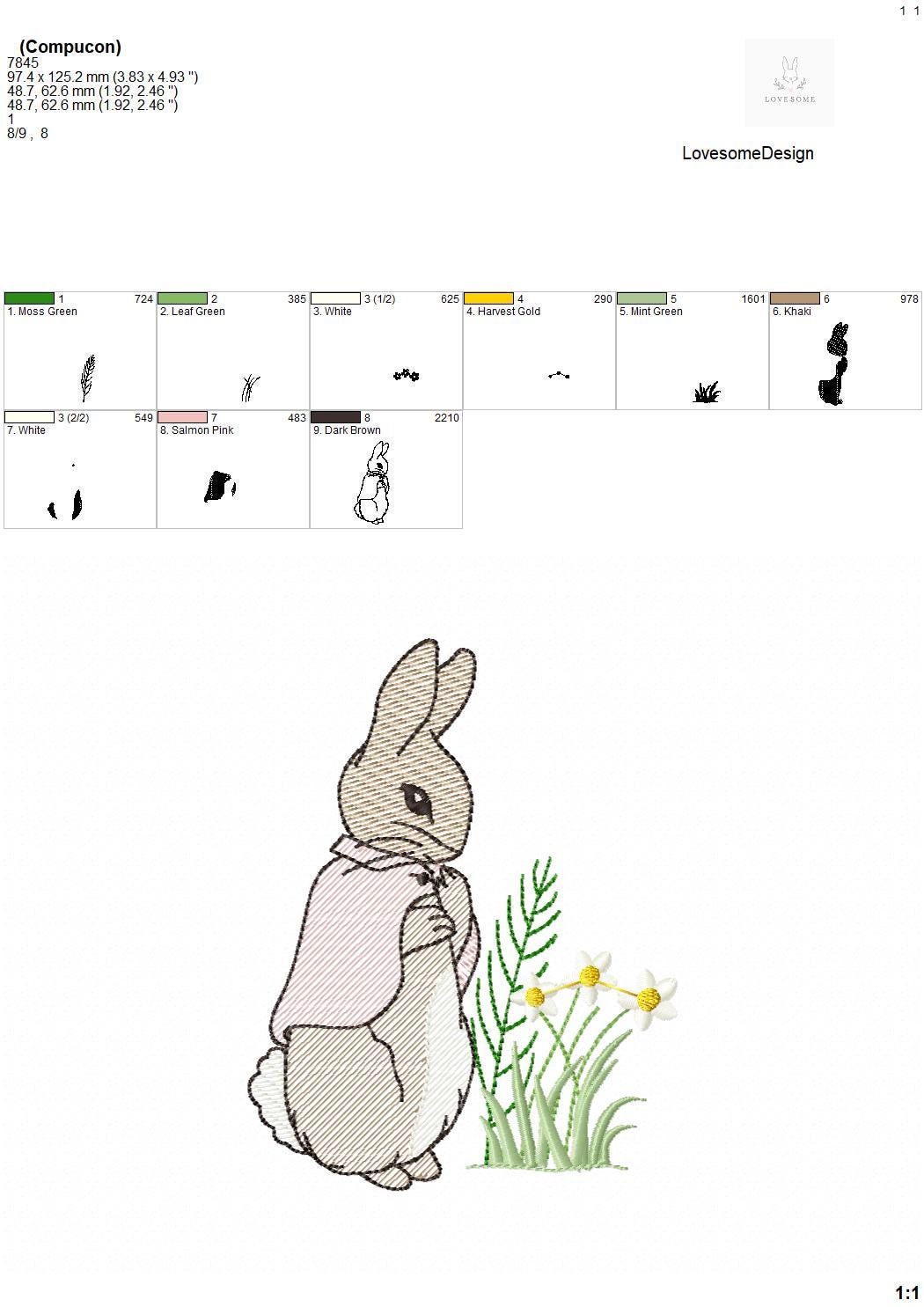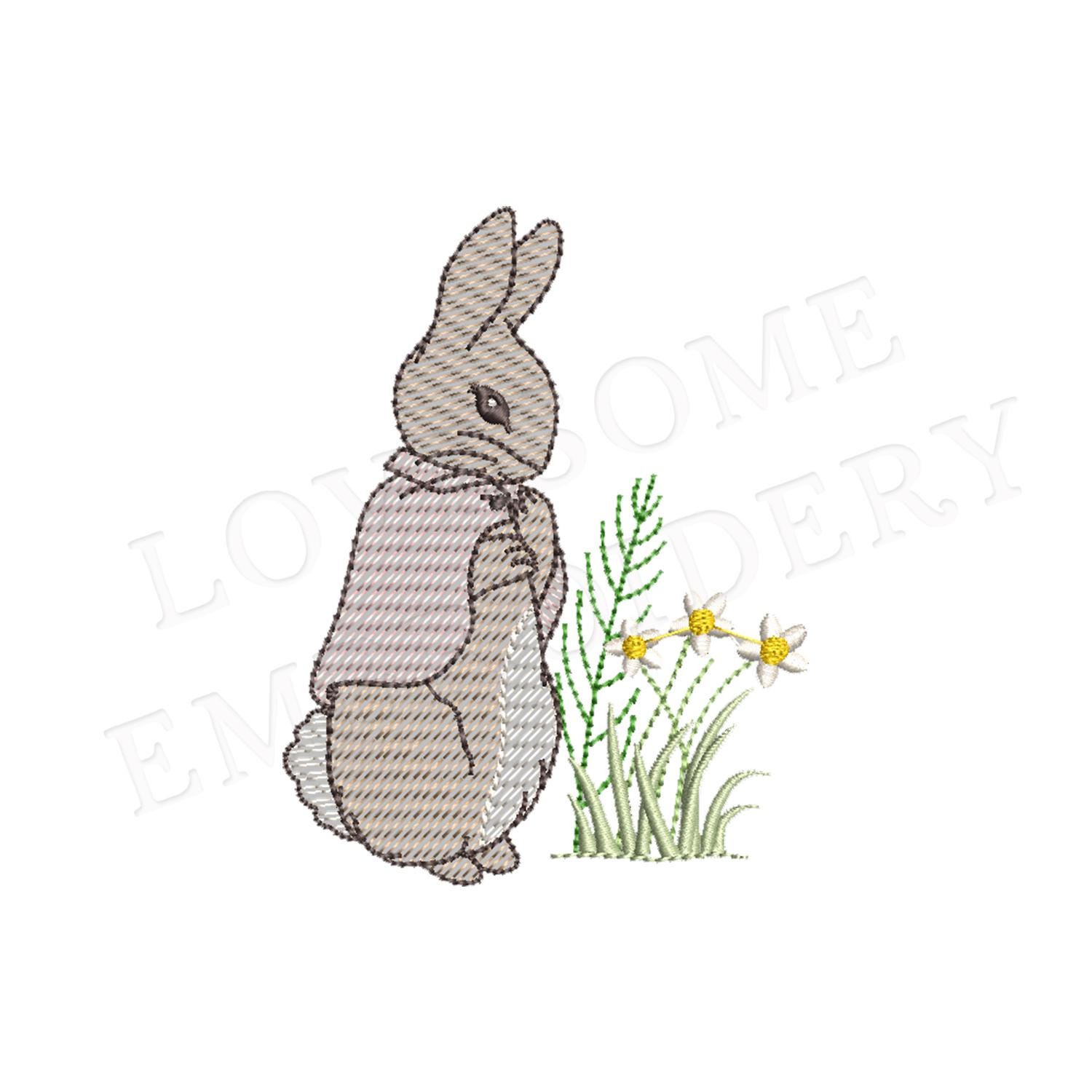 This listing features a machine embroidery file of quick stitch Cottontail Rabbit with meadow florals design in 5 inch size.