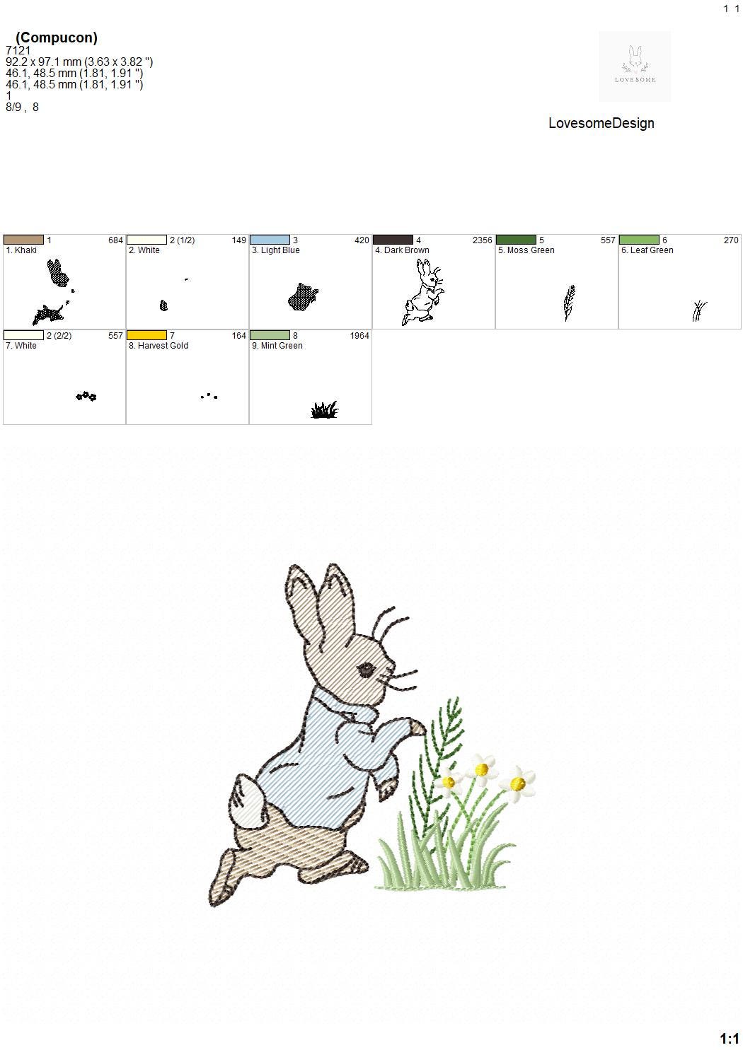 This listing features a machine embroidery file of quick stitch Peter Rabbit with meadow florals design in 4 inch size.
